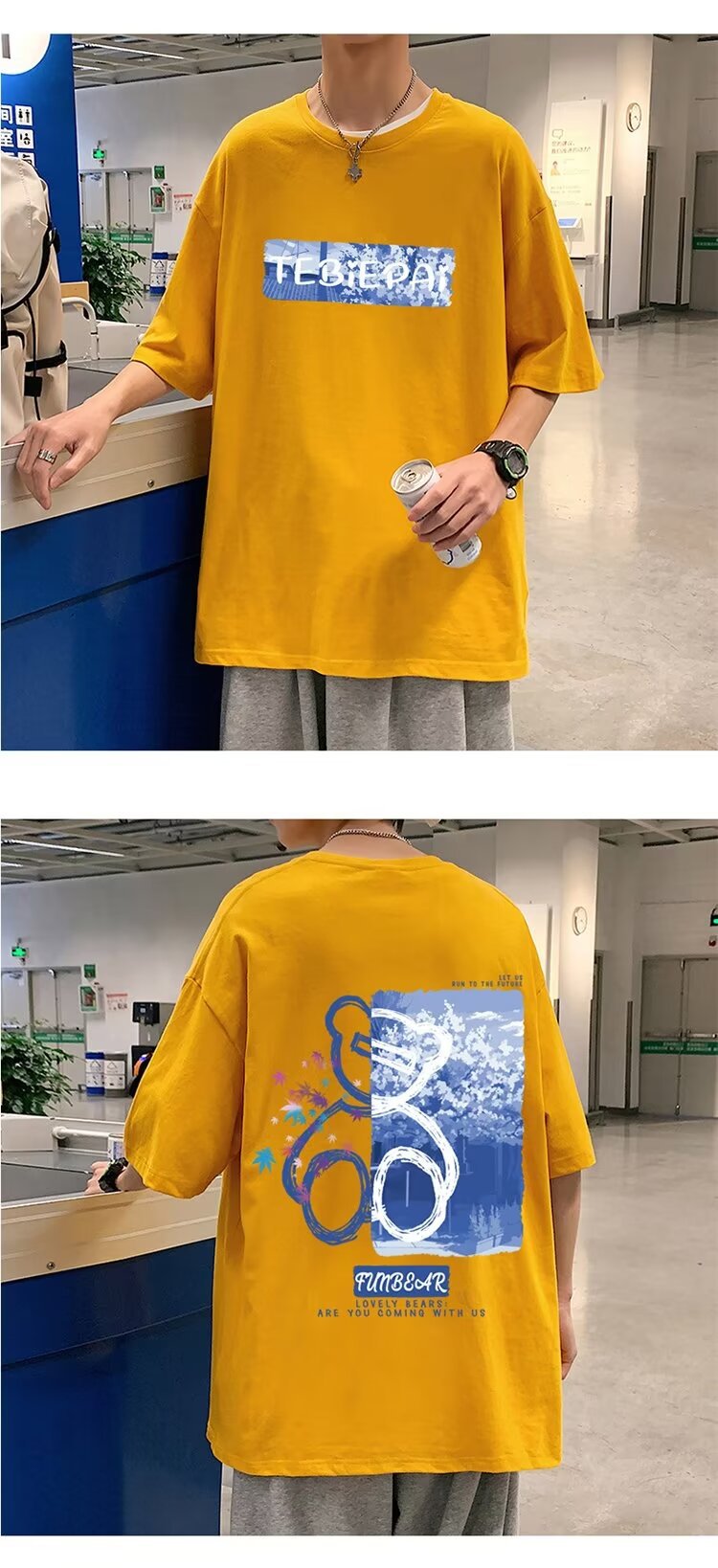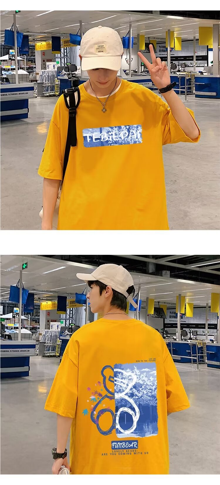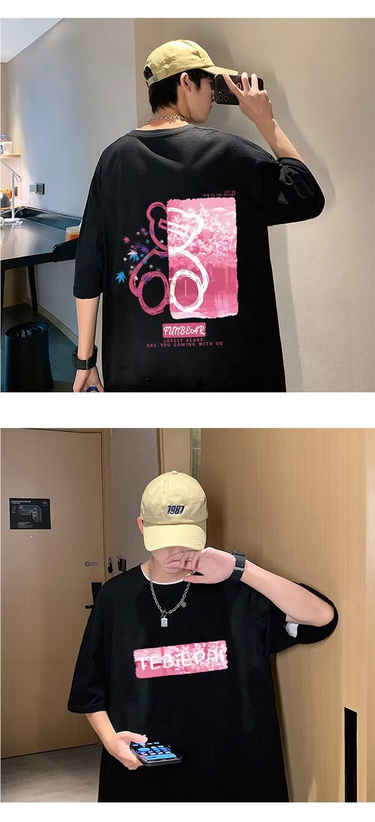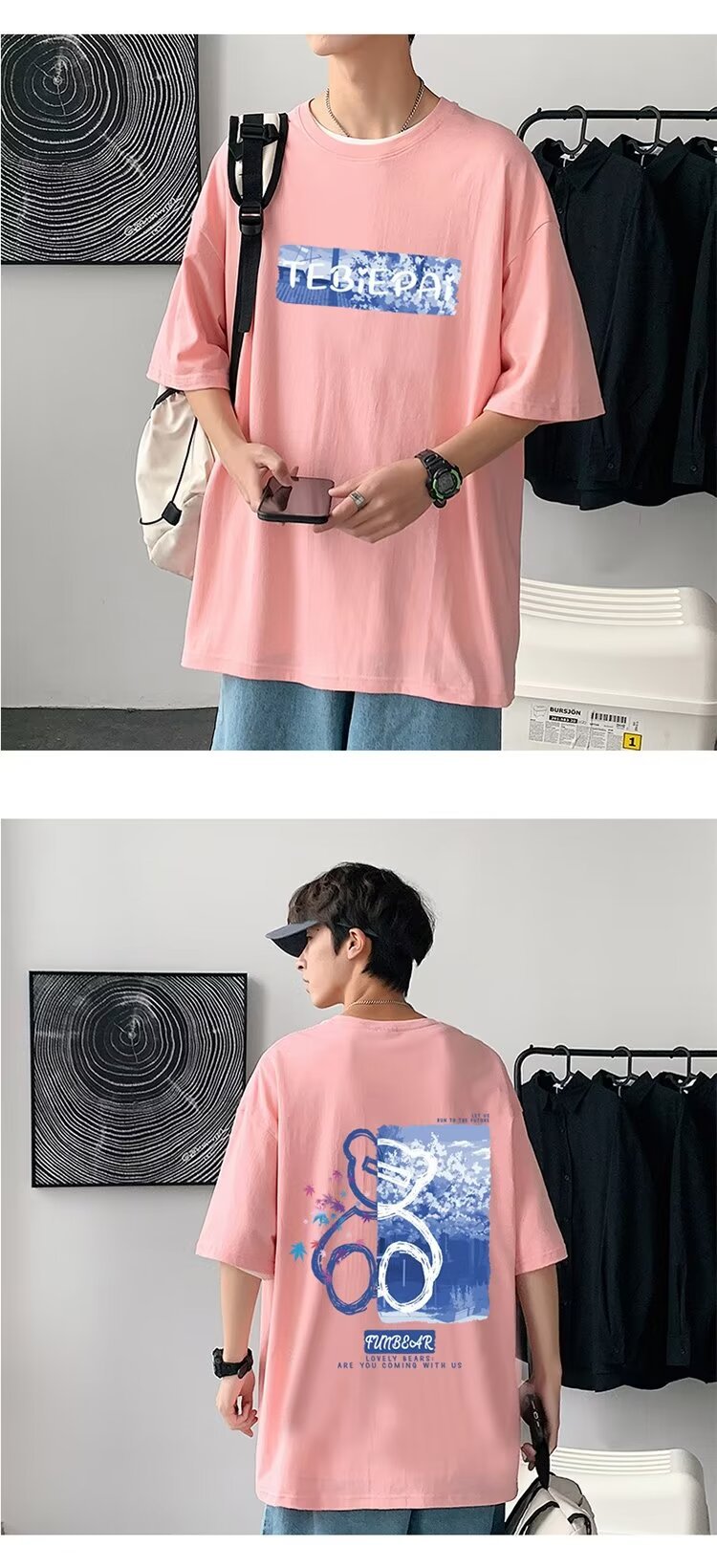 반팔 티셔츠 남자 여름 홍콩 스타일 Ins 트렌디 브랜드 올매치 느슨한 플러스 사이즈 베어 프린트 반팔 티셔츠 탑스토어 가기