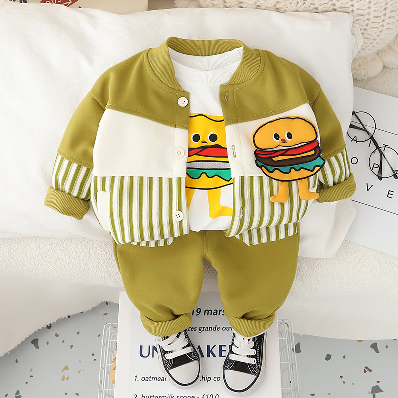 2024 소년 세트 봄과 가을 3 종 세트 수직 바 색상 일치 어린이 햄버거 서양식 코트 아기 긴팔 옷스토어 가기