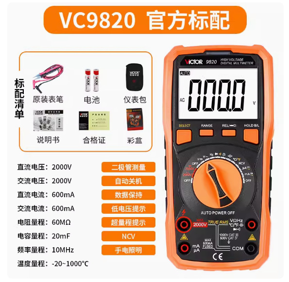 승리 VC9820 고전압 측정 전압 2000v 멀티 미터 디지털 고정밀 자동 식별 지능형 안티 번