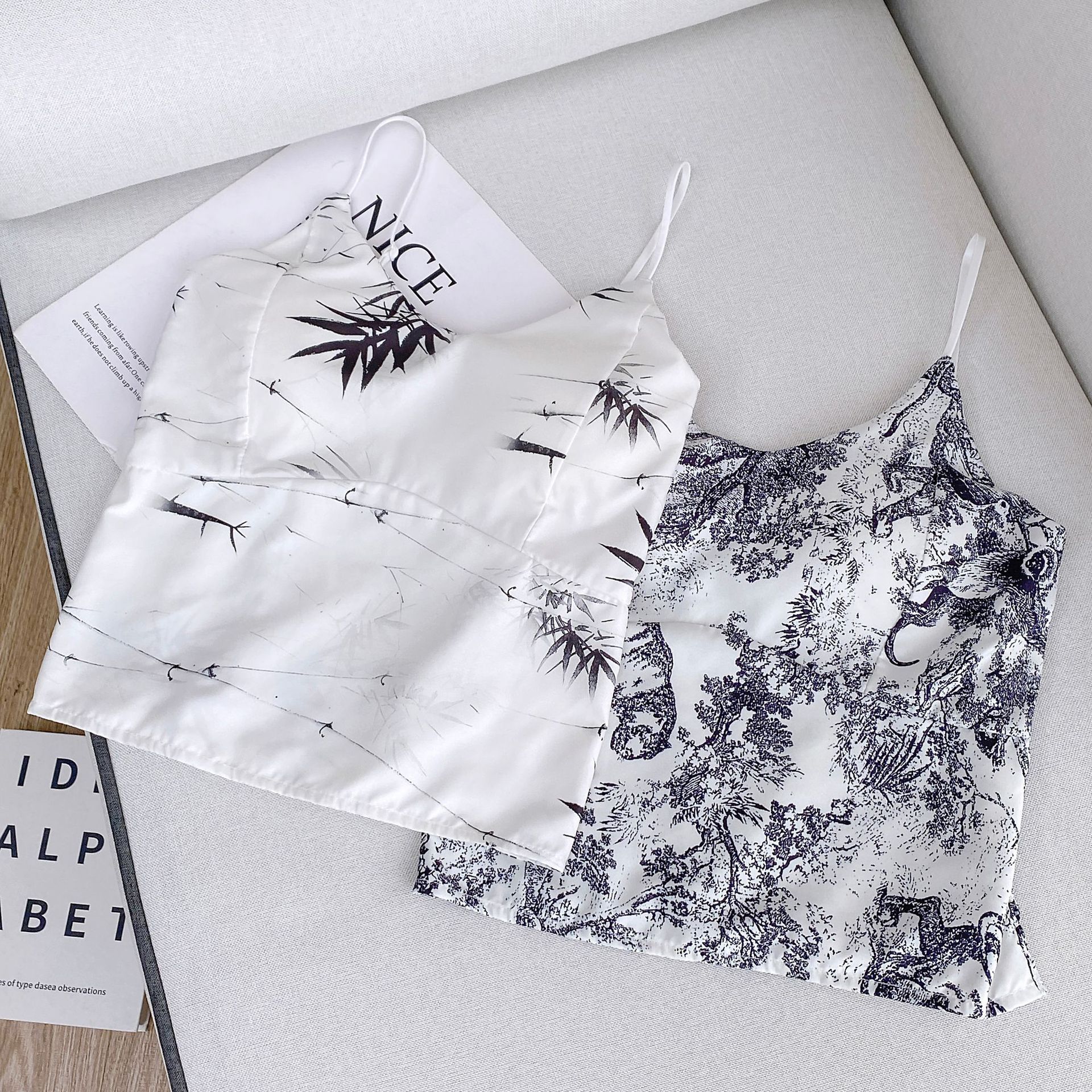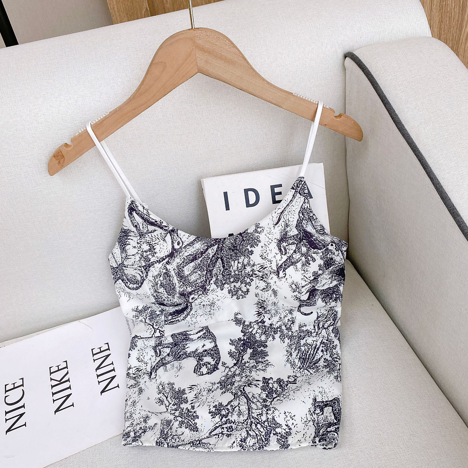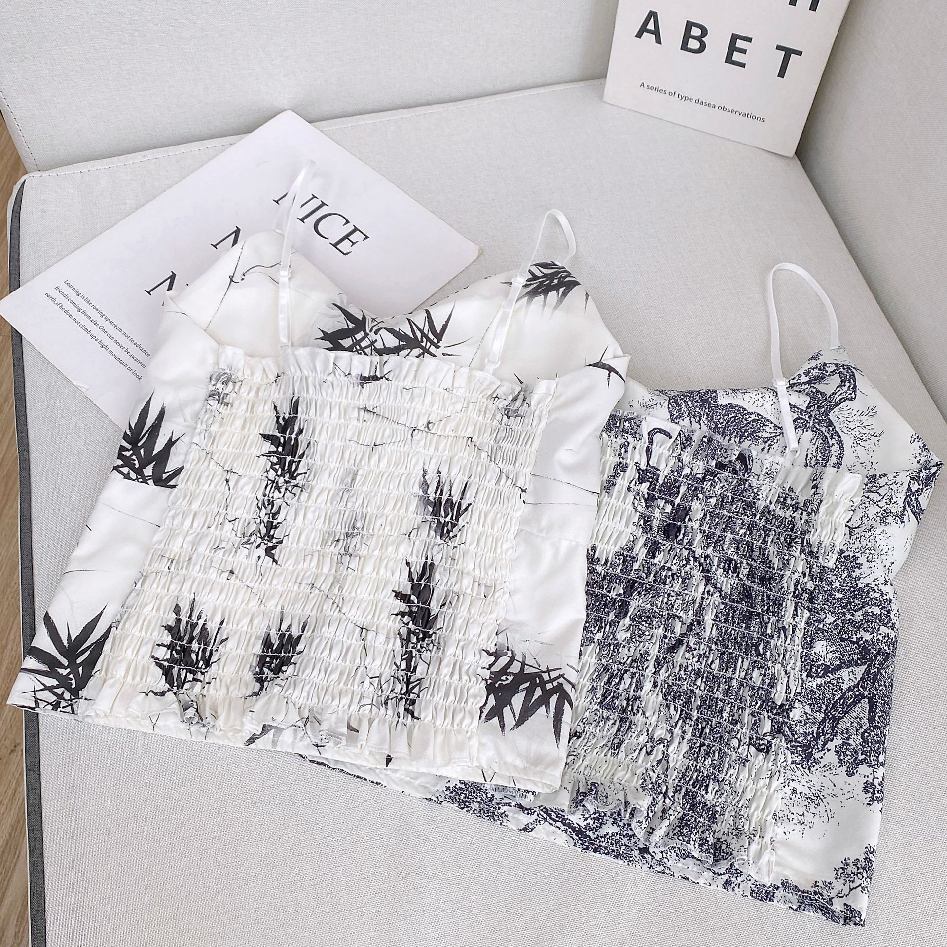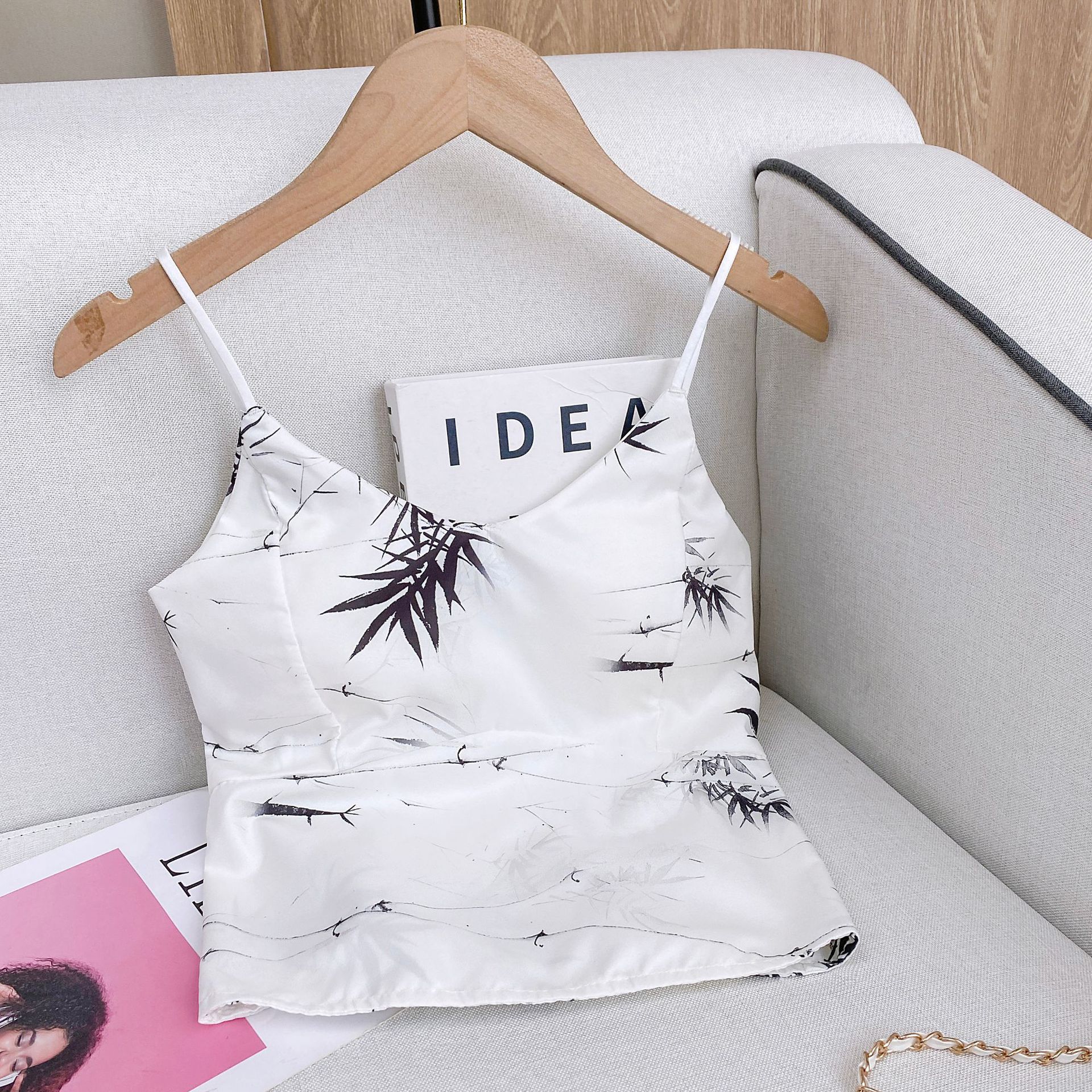 여름 신선한 중국 스타일 잉크 페인팅 인쇄 슬링 조끼 가슴 패드 고정 컵베이스 외부 착용 여성을위한 아름다운 뒷모습스토어 가기