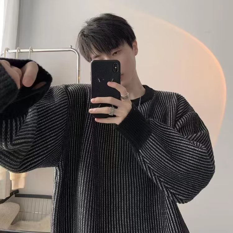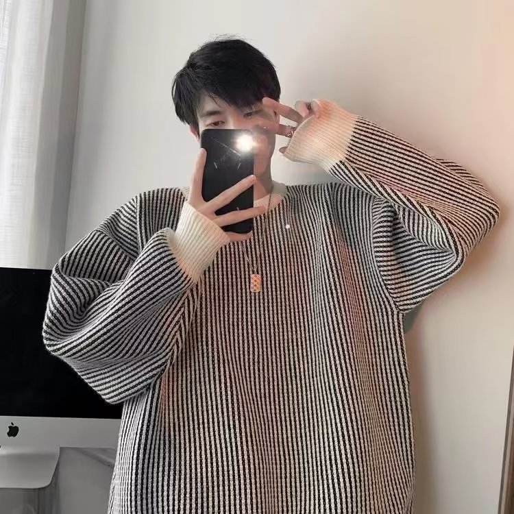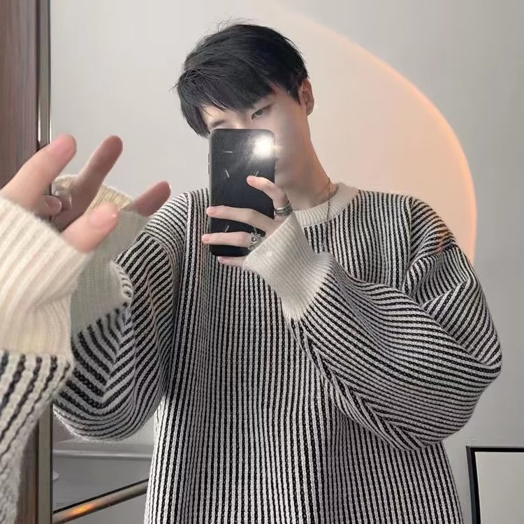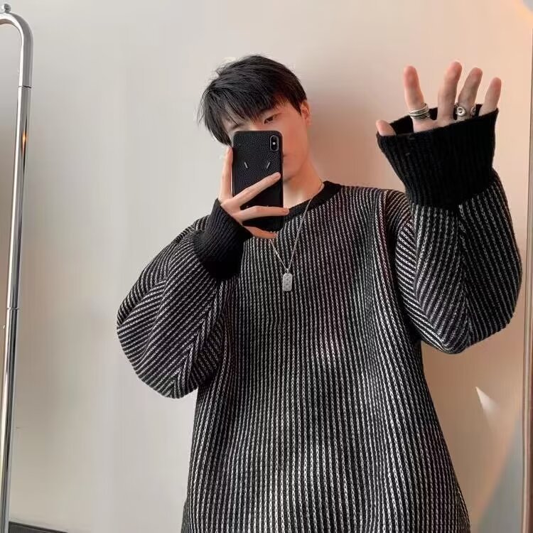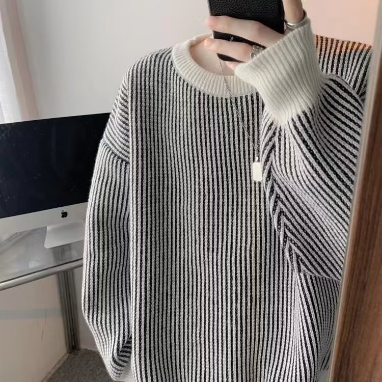 Crewneck 일본 가을과 겨울 줄무늬 스웨터 풀오버 스웨터 올 매치 레이드 백 스타일 느슨한 어깨 니트 스웨터 커플스토어 가기