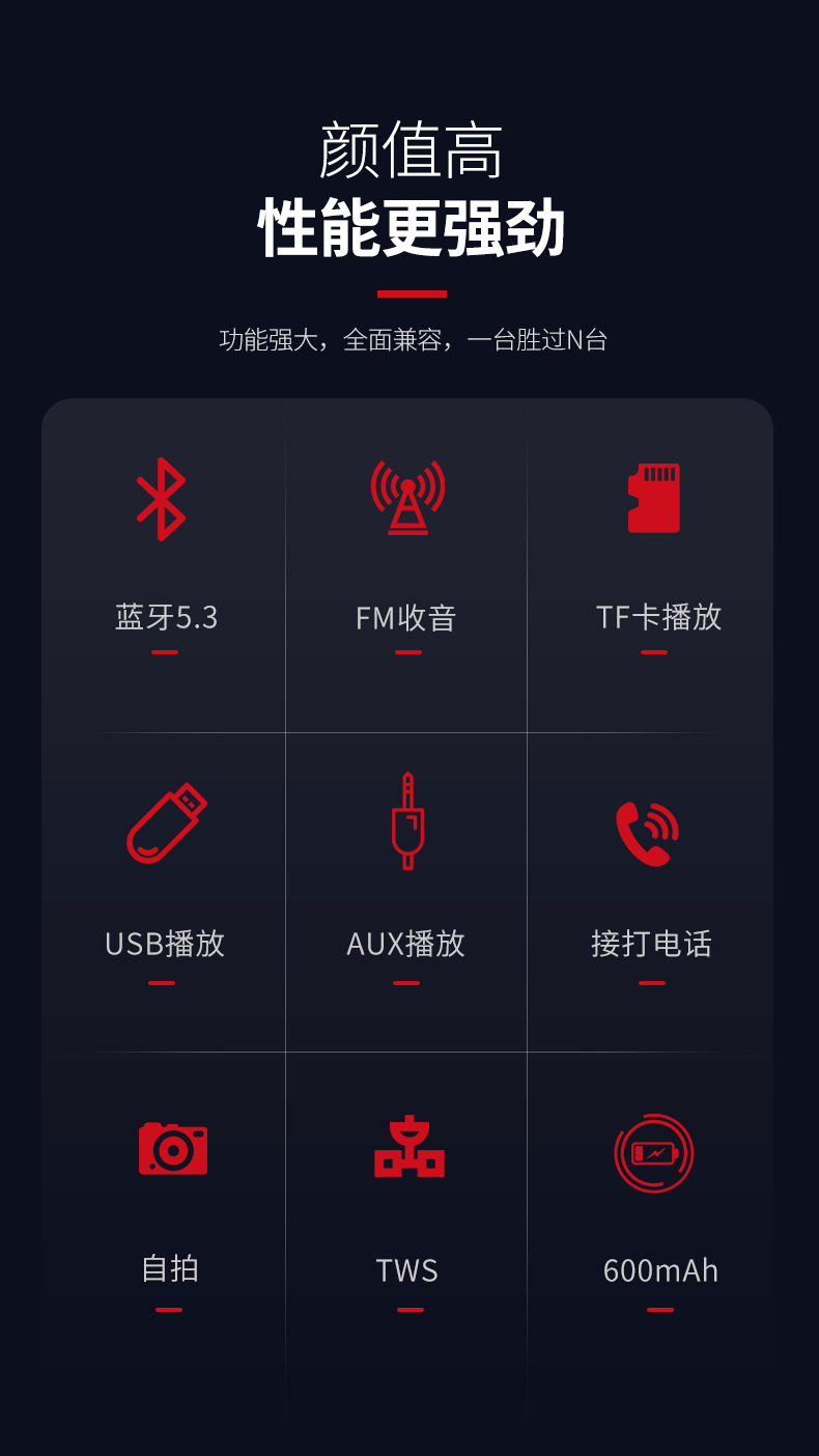 功能(FUTION):蓝牙播放,读U盘,TF卡,FM收音,自拍,TWS,MINI 5P充电