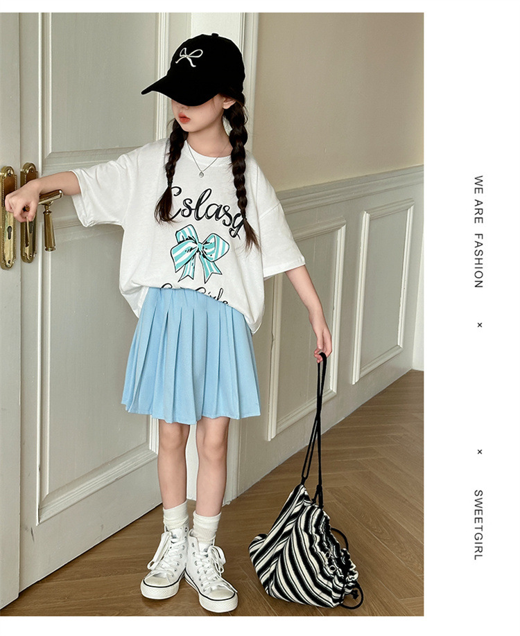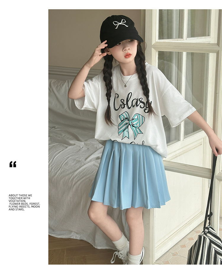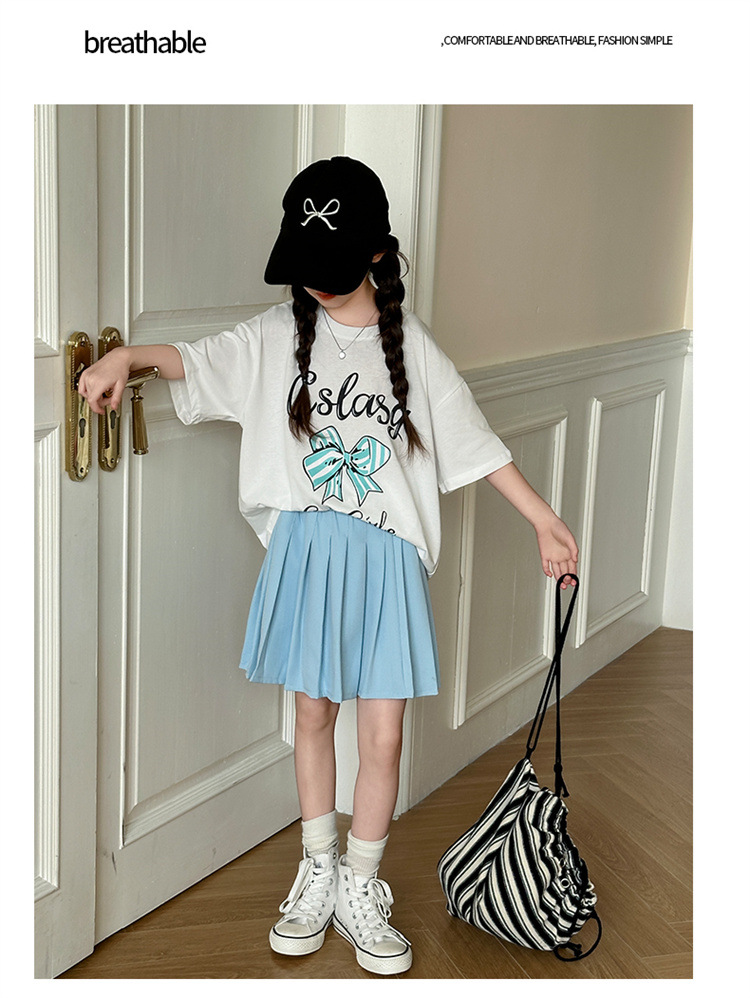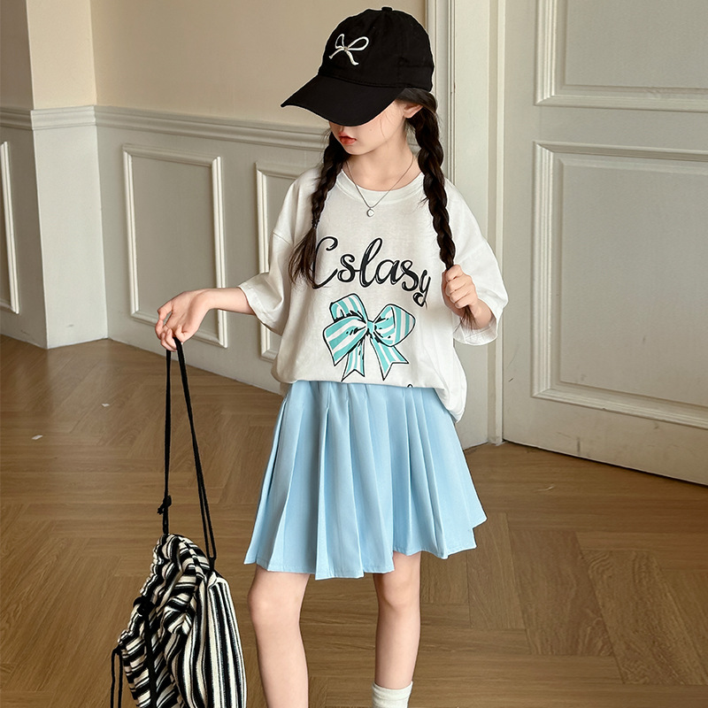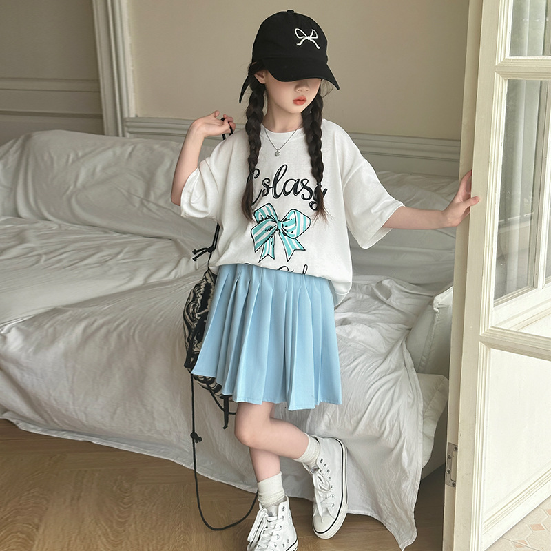 여자 세트 여름 2024 새로운 서양식 어린이 한국 스타일 패션 짧은 소매 여자 스커트 투피스 스커트