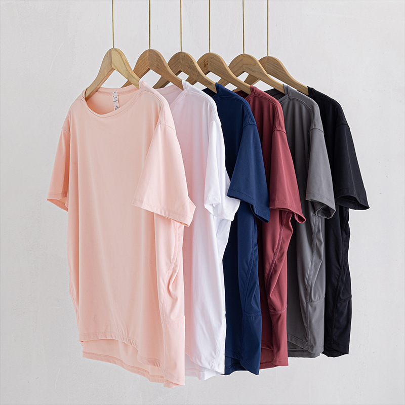 여름 새로운 박쥐 꼬리 반소매 느슨한 티셔츠 국경 스포츠 최고 여성 아이스 센스 퀵 드라이 블라우스 요가 옷스토어 가기