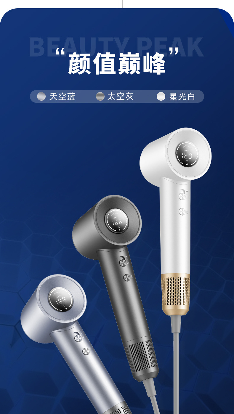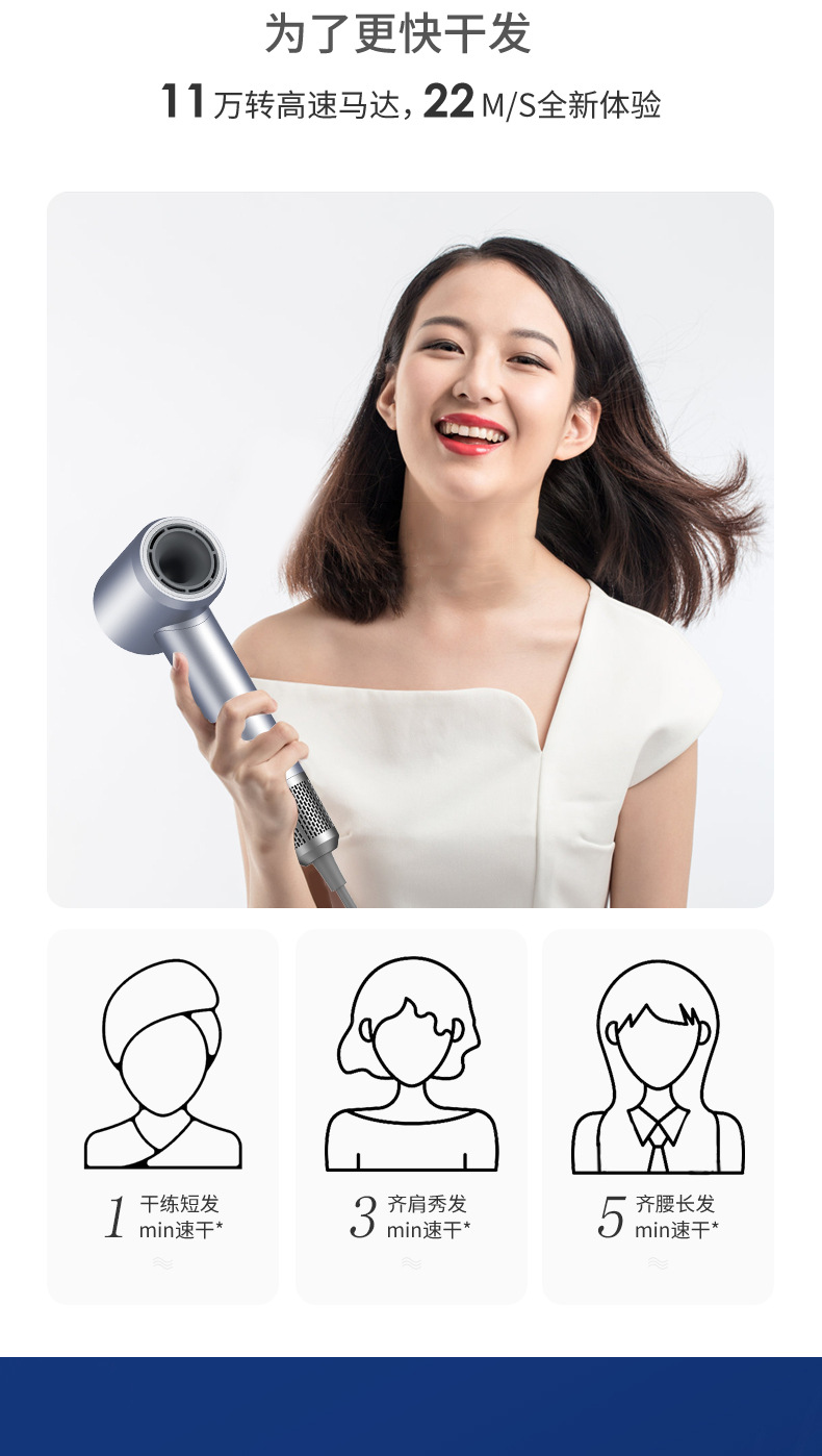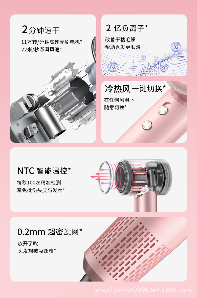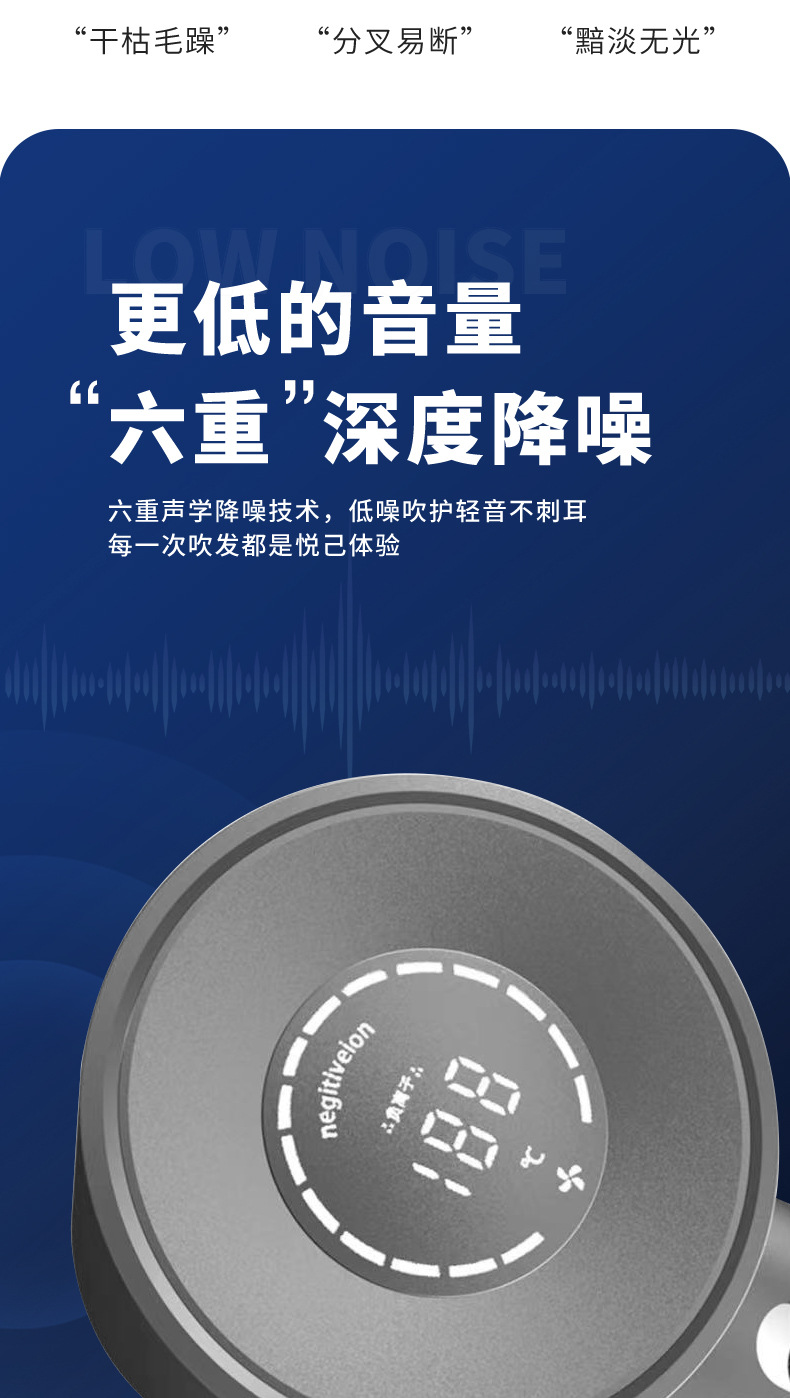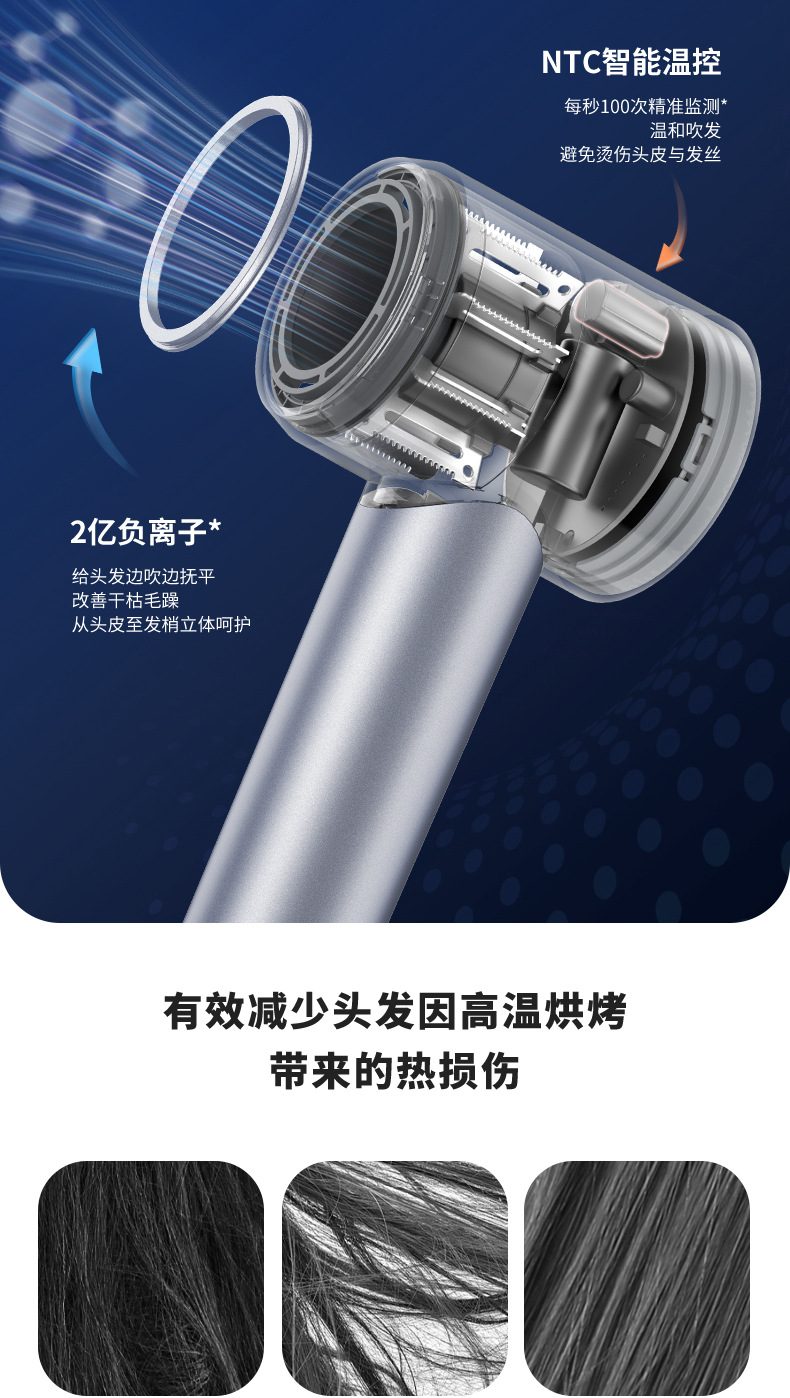 本品采用全新升级无刷高速电机,内置亿级负离子发生器,使用寿命长达15年。
