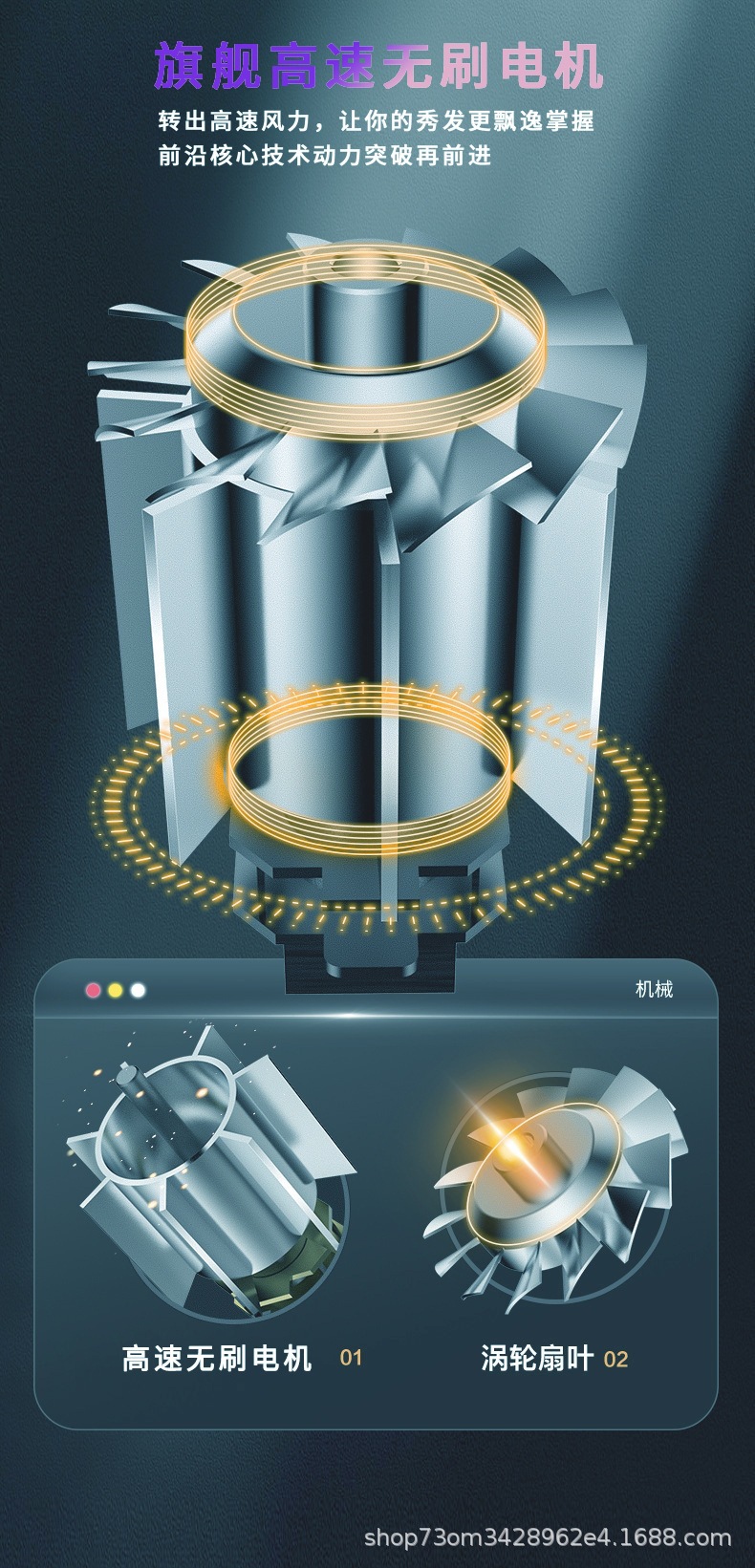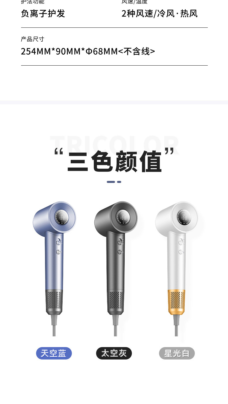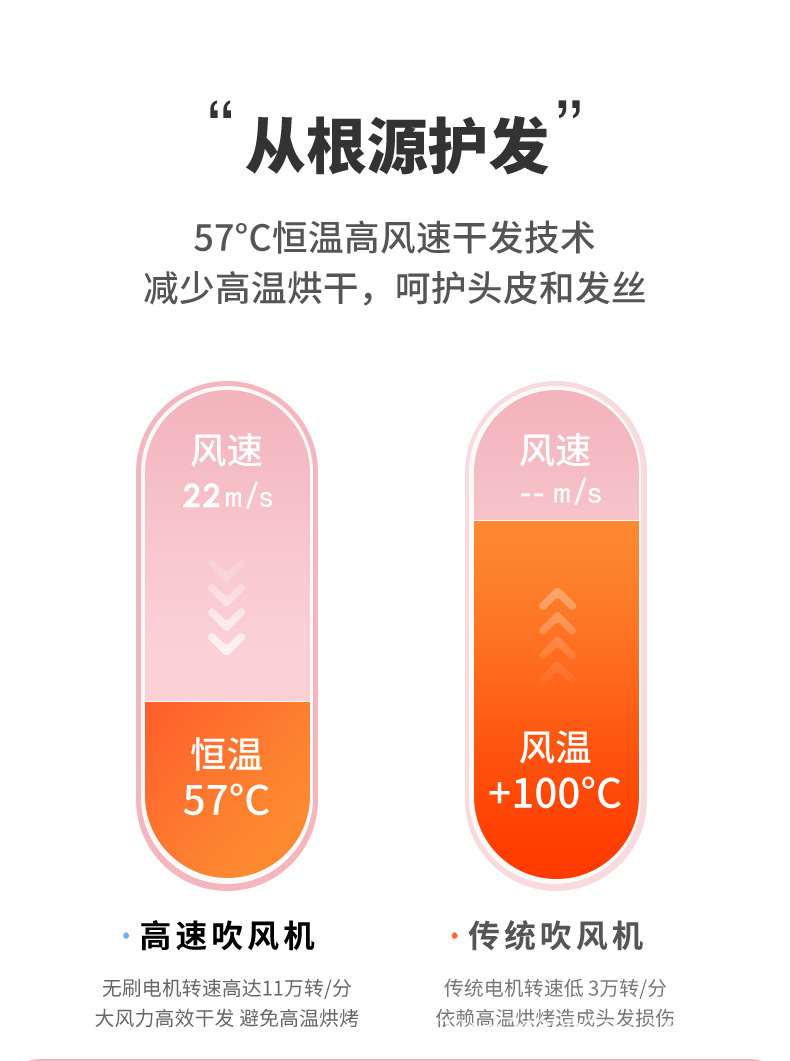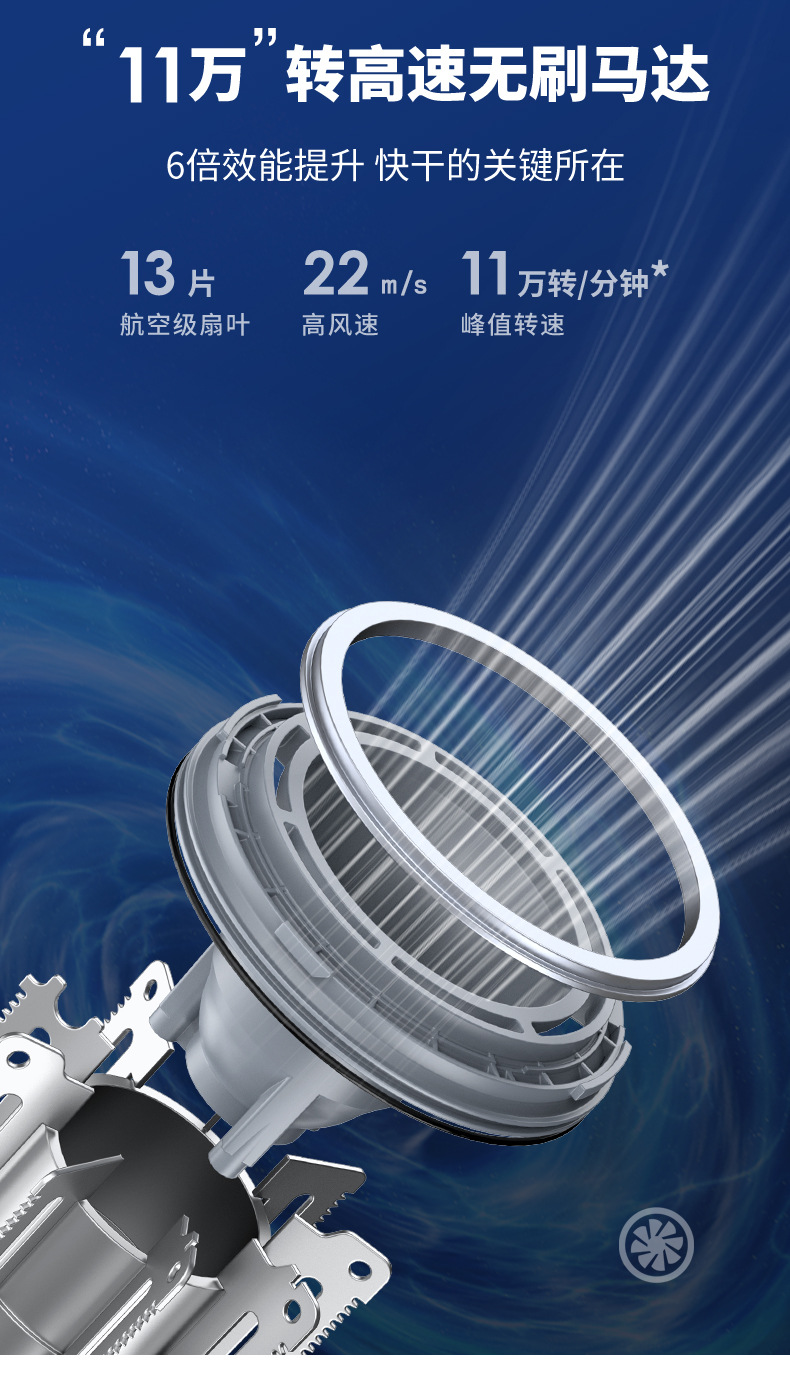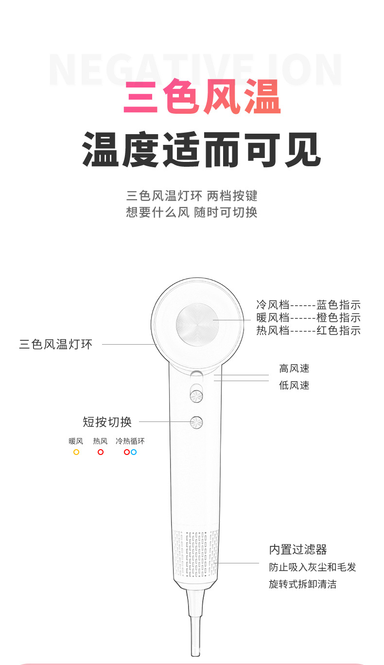本品采用全新升级无刷高速电机,内置亿级负离子发生器,使用寿命长达15年。