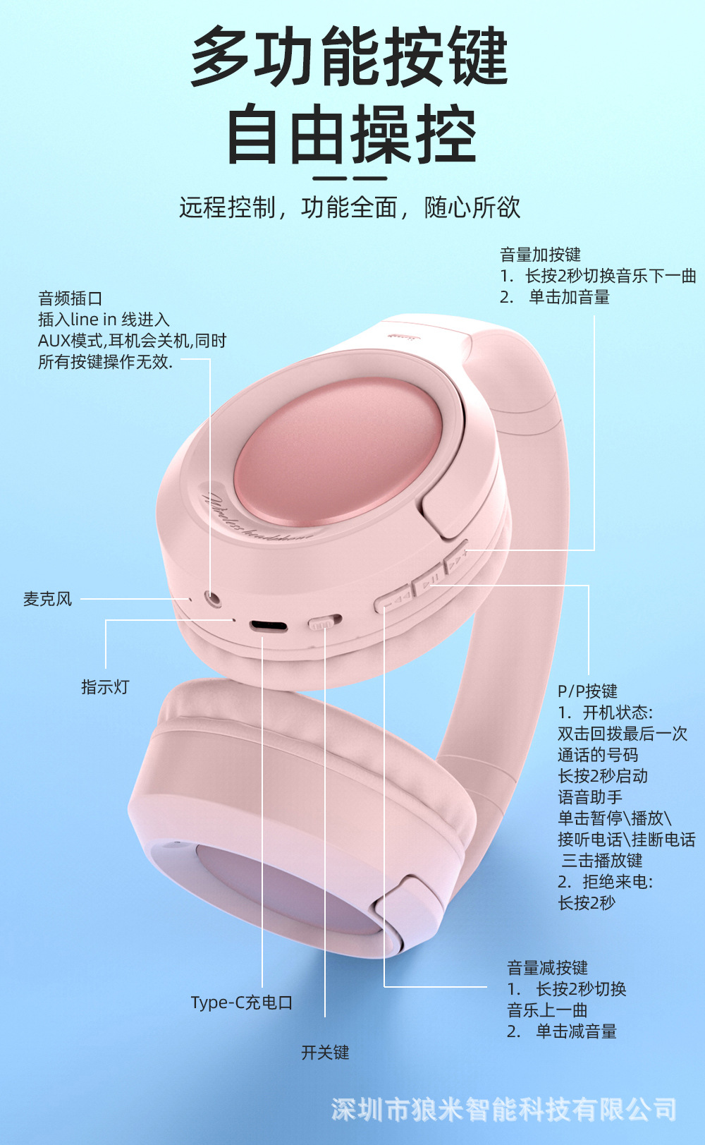 功能:调节音量、切换歌曲、来电接听、来电拒接、挂断电话、蓝牙播放、电话重播、蓝牙回连、语音提示、电量显示、EQ、纯英文播报