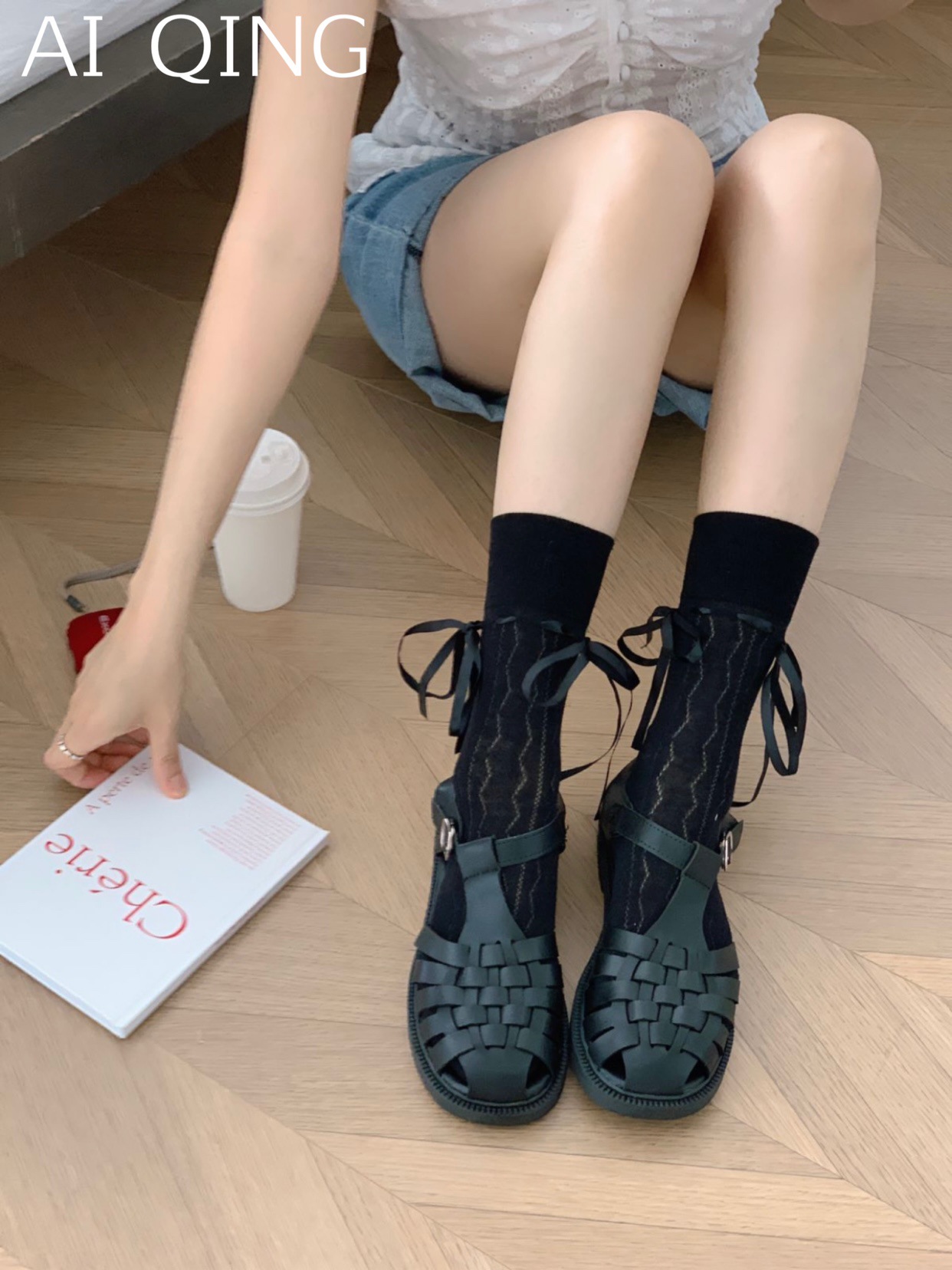 봄과 가을 발레 스타일 중공 스트랩 활 더미 스타킹 JK 리본 여름 짧은 양말 여성용 작은 가죽 신발