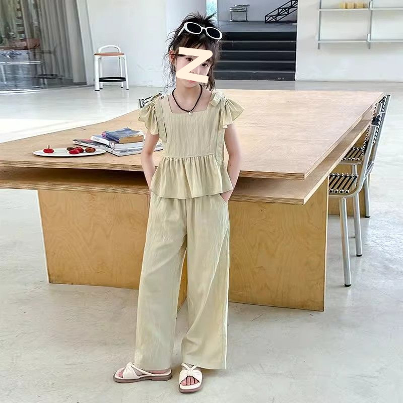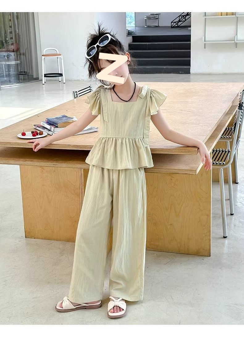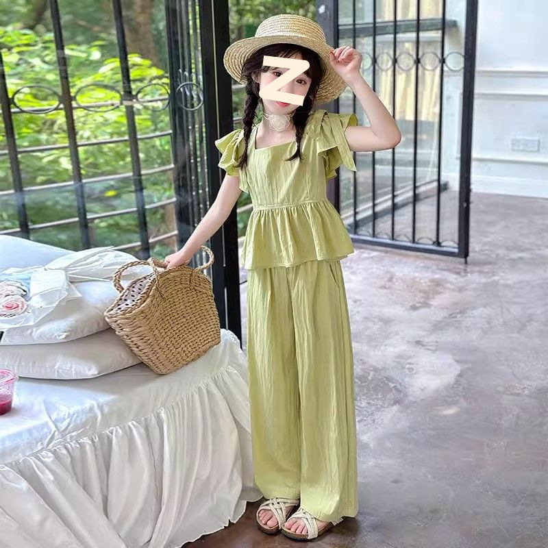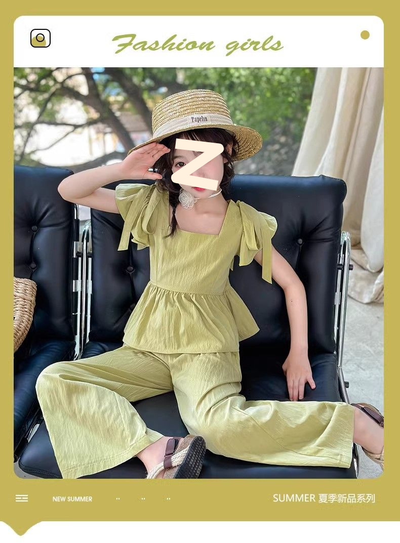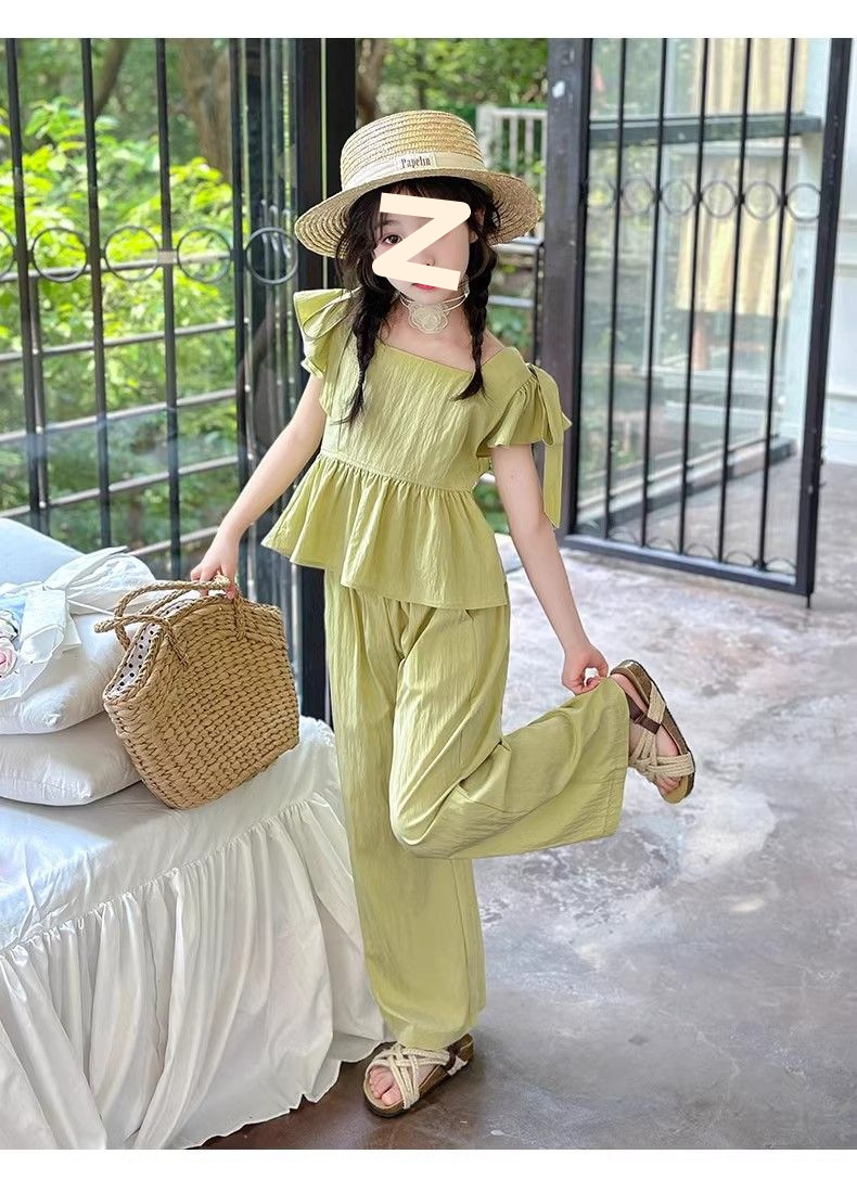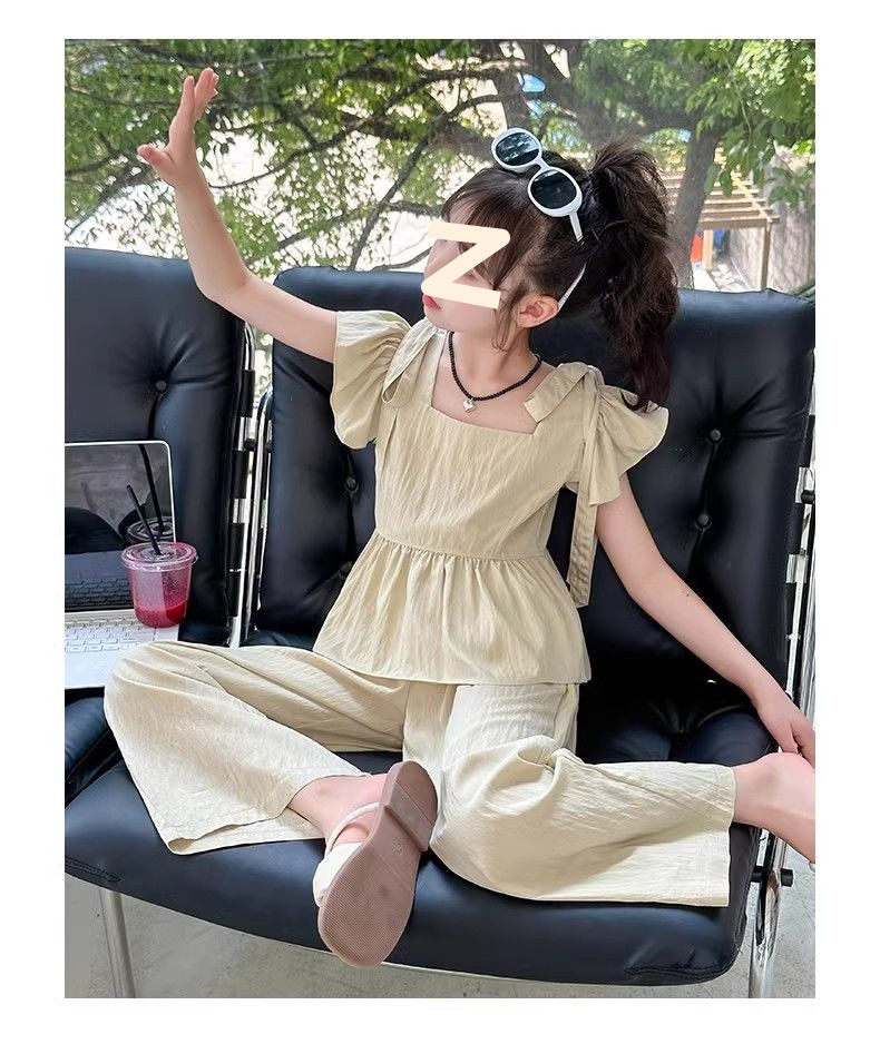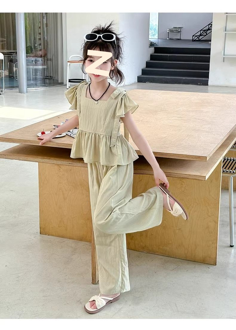 소녀 여름 착용 얇은 시폰 셔츠 세트 2024 새로운 스타일 중대형 어린이 우아한 여성 여성 최고 투피스 세트스토어 가기