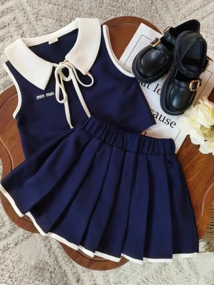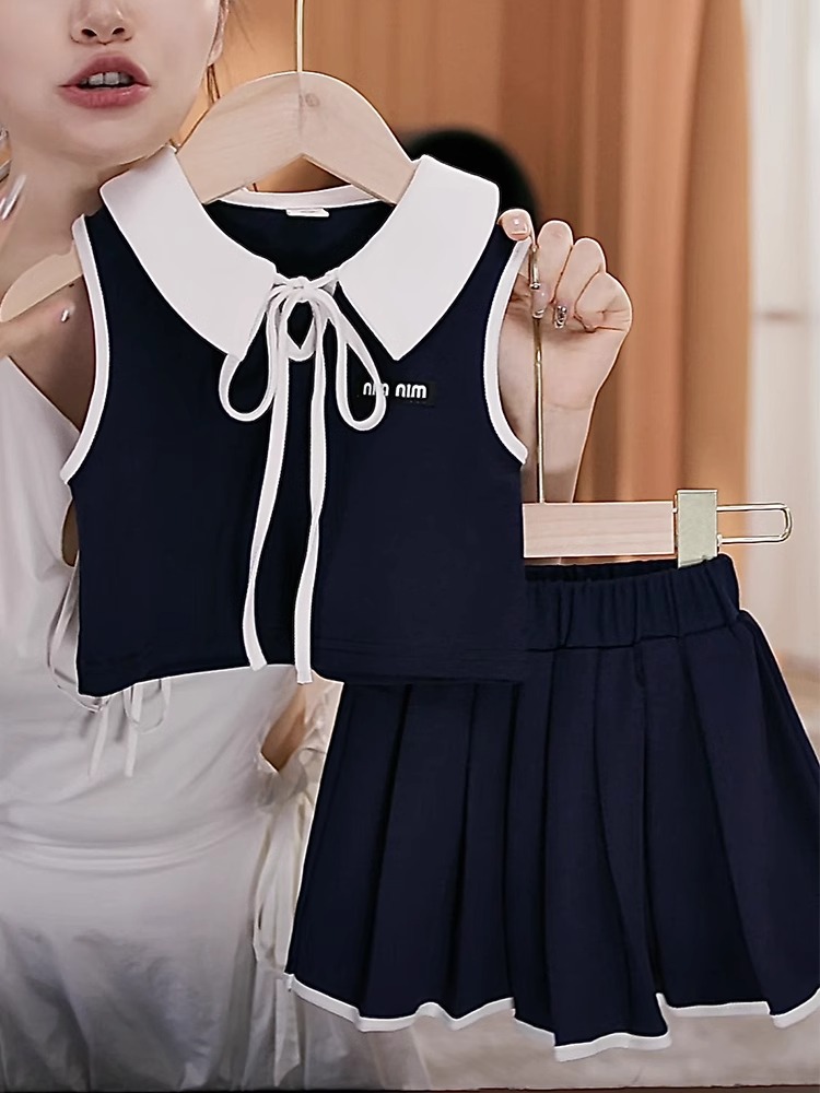 여아 대학 스타일 폴로 슈트 2025 신상 여름 의류 아동용 민소매 패셔너블한 플리츠 스커트 투피스 세트