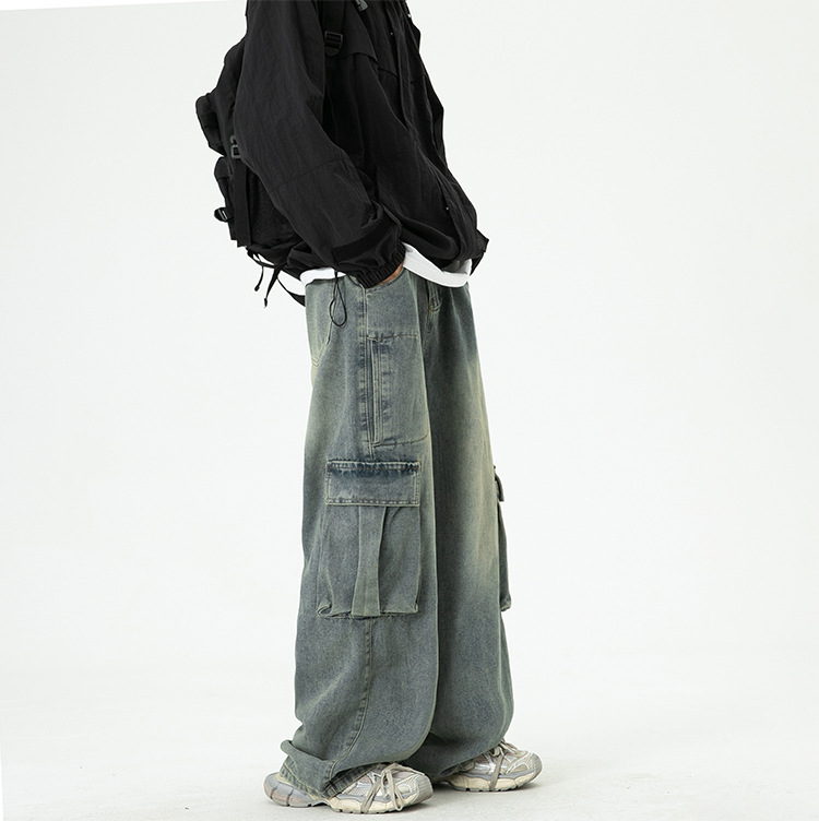 아메리칸 스타일 툴링 청바지 남성용 가을 오래 된 느슨한 다리 바지 유행 브랜드 내 레트로 와이드 레그 롱 바지스토어 가기