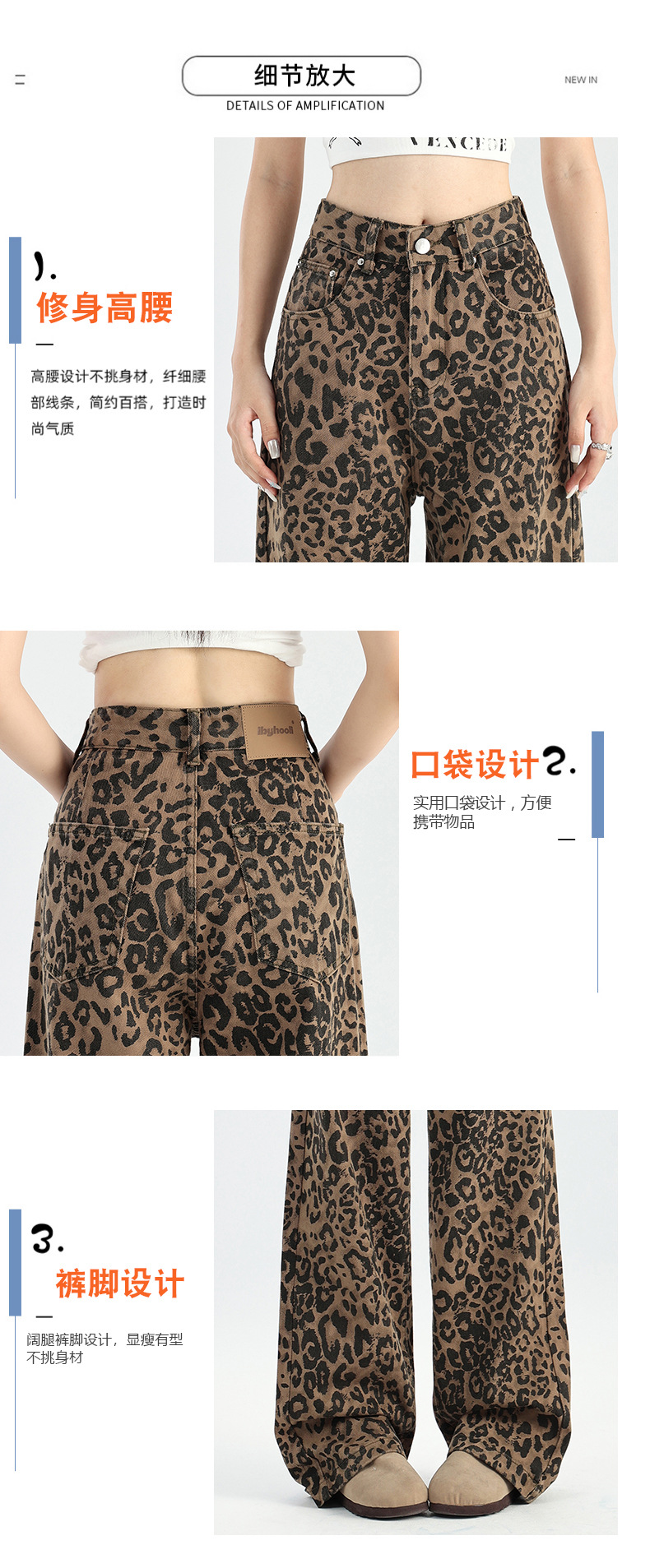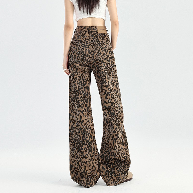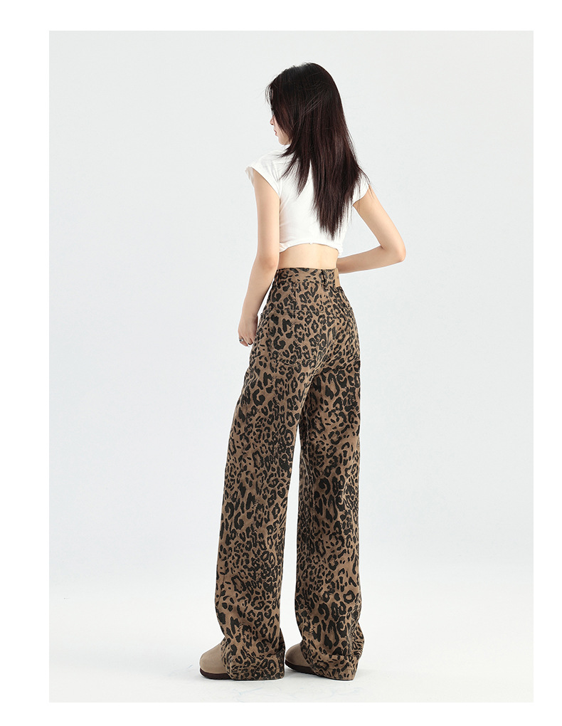 레오파드 프린트 와이드 레그 청바지 여성용 2025 가을 겨울 신상 하이웨이스트 아메리칸 스타일 루즈핏 슬림핏 벨벳 스트레이트 팬츠