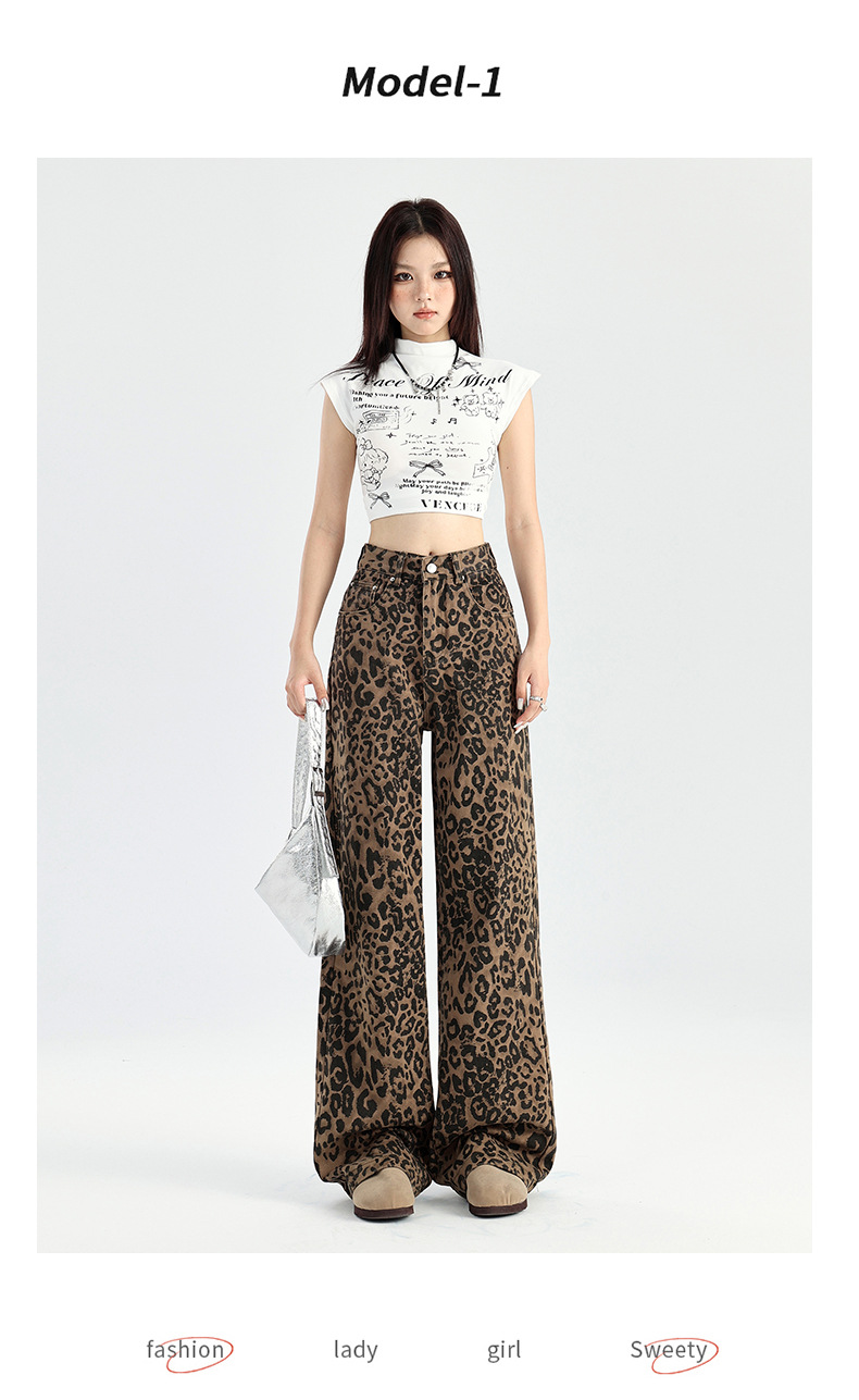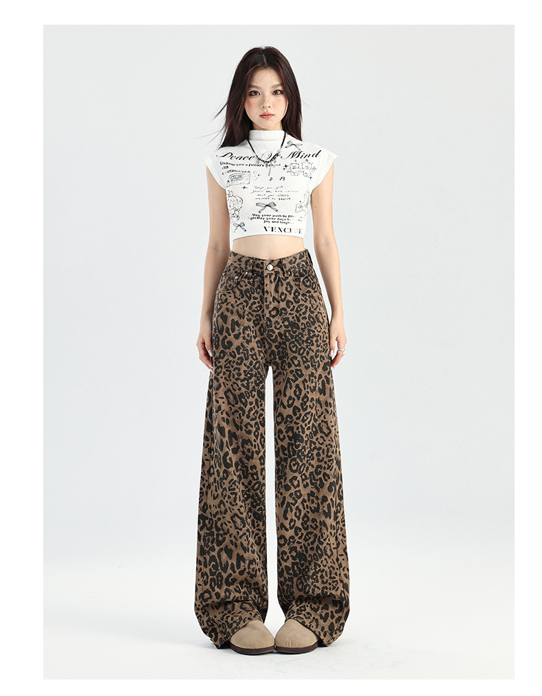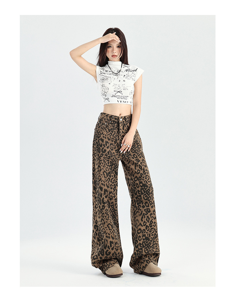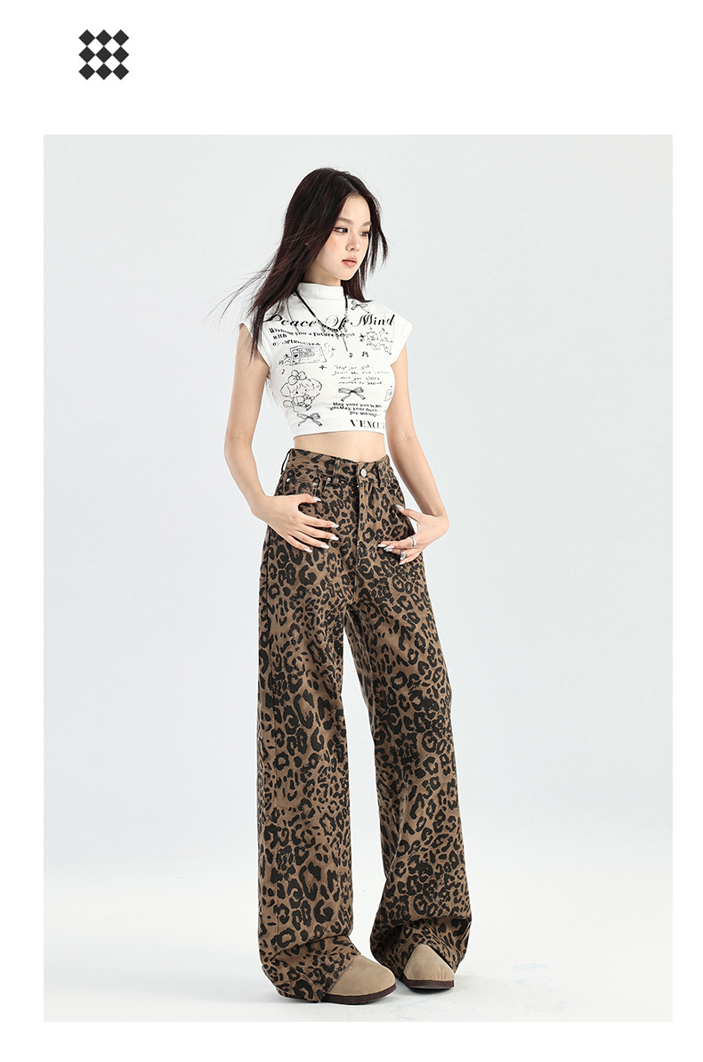 레오파드 프린트 와이드 레그 청바지 여성용 2025 가을 겨울 신상 하이웨이스트 아메리칸 스타일 루즈핏 슬림핏 벨벳 스트레이트 팬츠