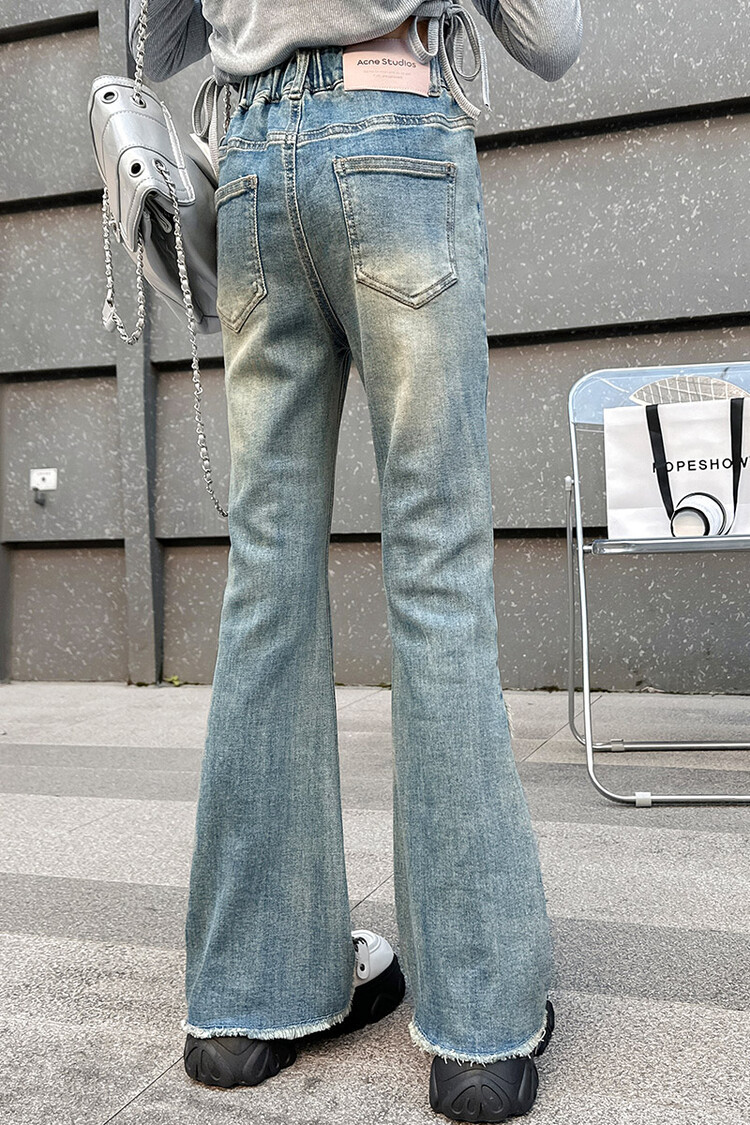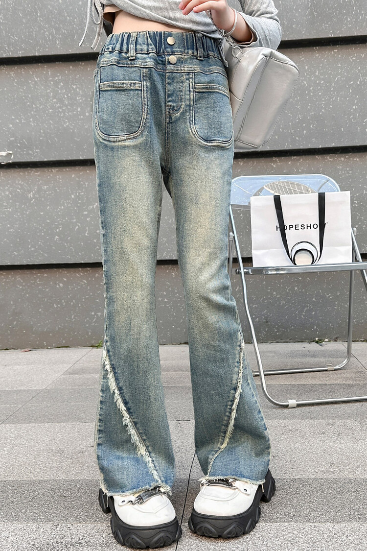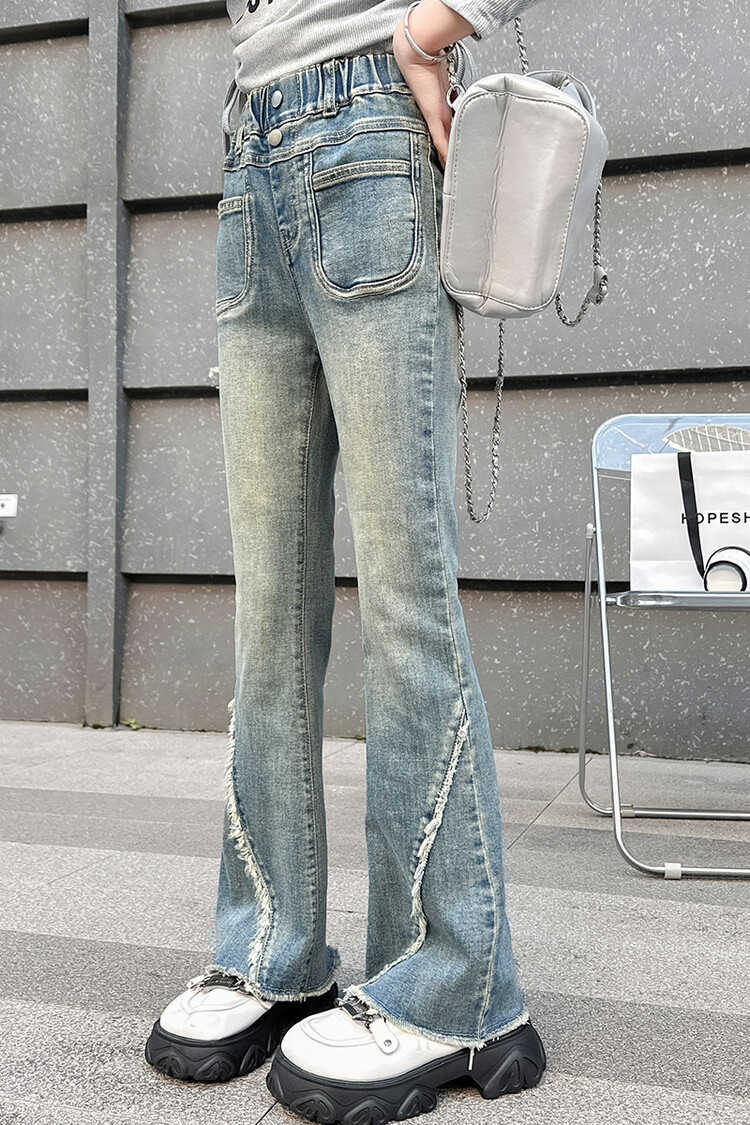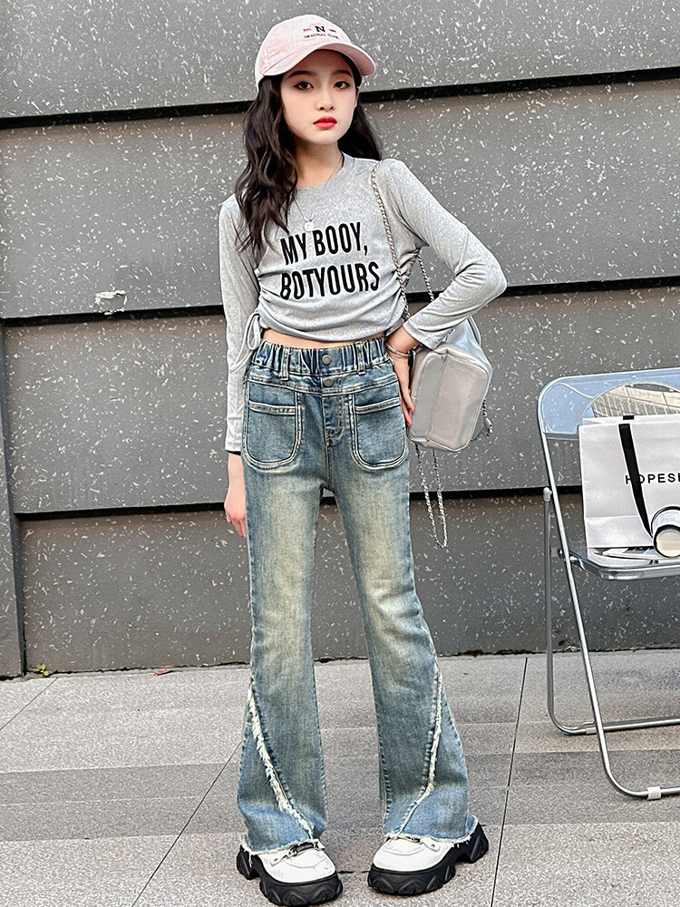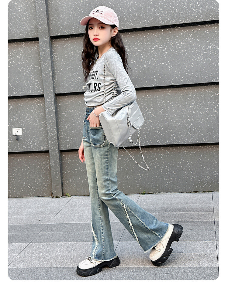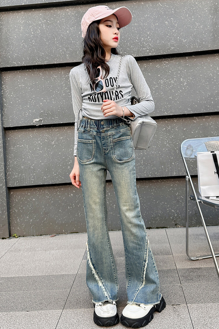 소녀 청바지 24 새로운 스타일 중대형 어린이 봄 및 가을 바지 소녀 올 매치 슬림 핏 플라 드 바지 대외 무역 어린이 바지