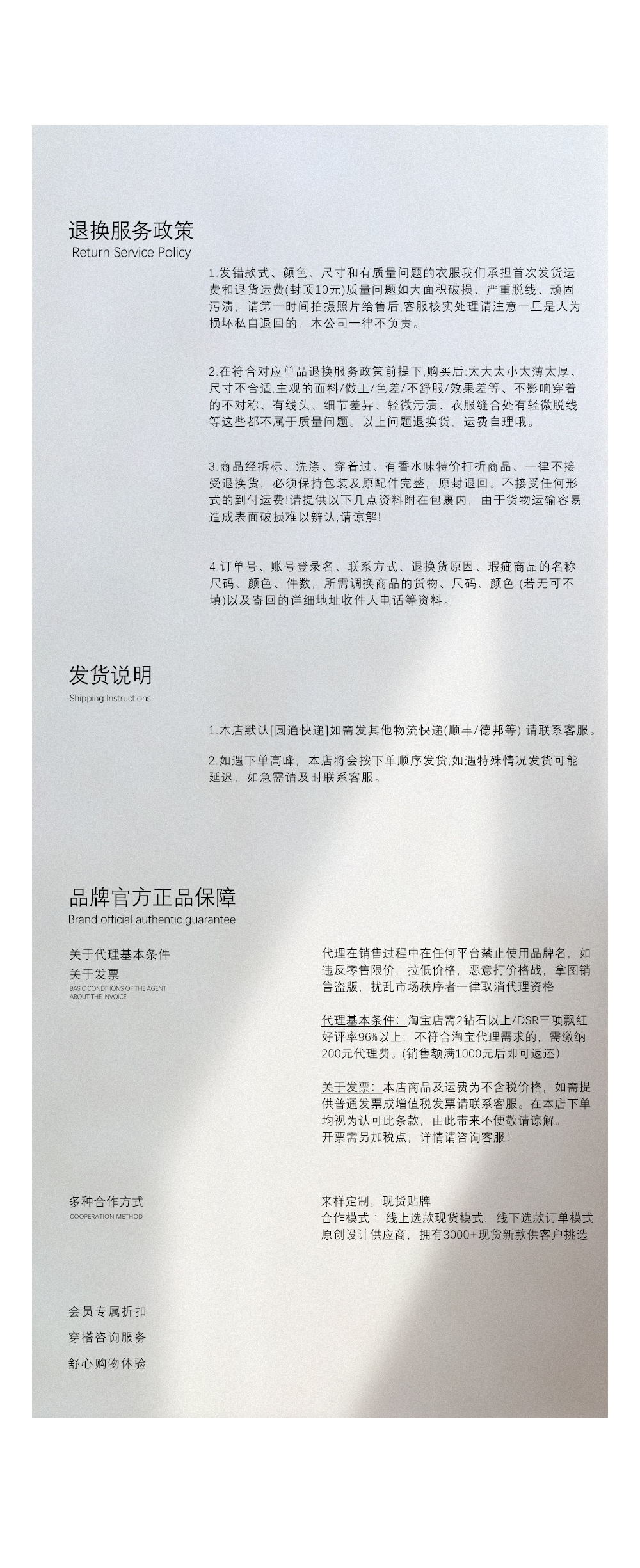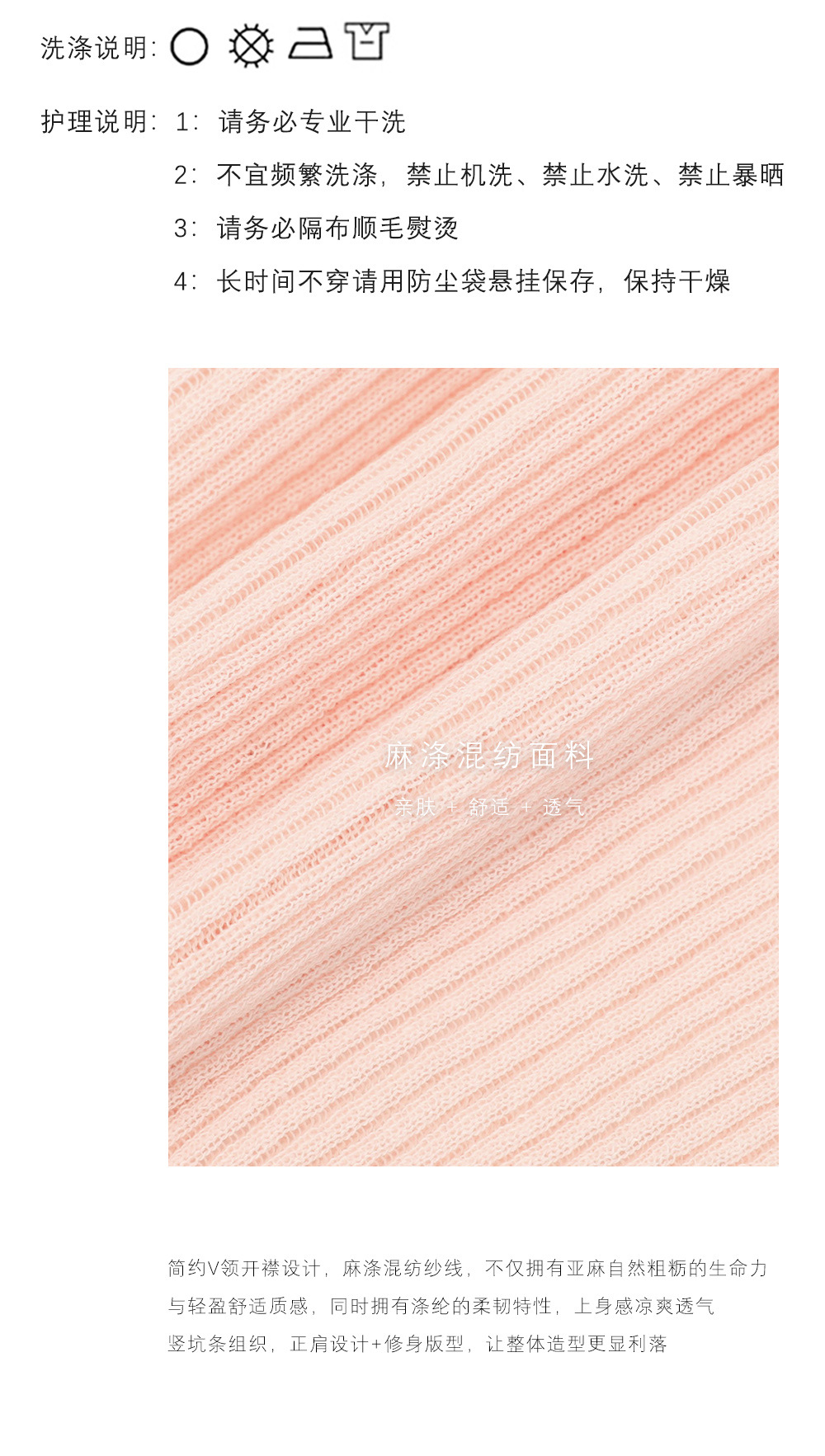| 注意:毛衣掉毛属正常现象!并非质量问题!不可机洗!下单默认已读。 工厂在加工毛衣时,为了追求更好的外观和手感,会进行一定的处理,这也会导致在毛衣表面留有少许浮毛。这些浮毛在后续的穿着过程中,通过摩擦和洗涤会逐渐脱落。并不会影响毛衣的质量。对于掉毛问题可以尝试一些简单的处理方法。例如,使用透明胶或者粘毛器将浮毛清除,或者选择使用抗静电洗衣液清洗毛衣,以减少掉毛的情况。通过适当的处理和保养,可以大大减轻这种现象。 毛衣购前须知:关于缩水的贴心提示 亲爱的顾客,感谢您选择我们的毛衣产品!为了确保您购买到称心如意的衣物,请在选购前仔细阅读以下关于毛衣缩水的须知事项: 1. 缩水是天然面料的常见特性 羊毛、羊绒、棉等天然材质因纤维特性,在洗涤或受热时可能出现轻微缩水(约3%-5%),这属于正常现象,并非质量问题。 合成纤维(如涤纶、腈纶)缩水率较低,但透气性和保暖性相对较弱。 2. 选购时建议“留有余地” 若喜欢合身效果,可按正常尺码选择;若担心缩水,建议选大1码(尤其是高羊毛含量款式)。 参考商品详情页的「面料成分」和「洗涤建议」,高比例羊毛(>50%)更需注意护理方式。 3. 正确的护理能减少缩水风险 洗涤方式:建议手洗或选择洗衣机的“羊毛模式”,水温≤30℃,避免长时间浸泡。 晾晒方法:平铺阴干,切勿悬挂或暴晒,防止变形。 熨烫技巧:中低温隔布熨烫,避免直接接触纤维。 |