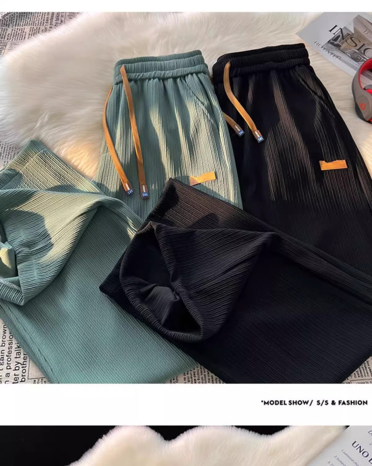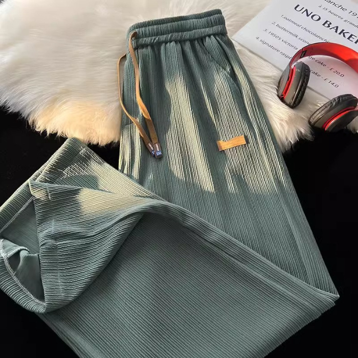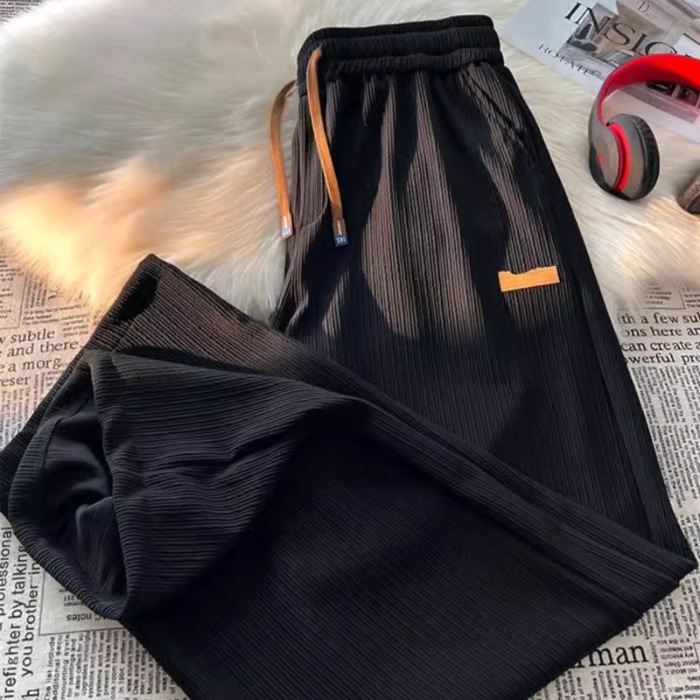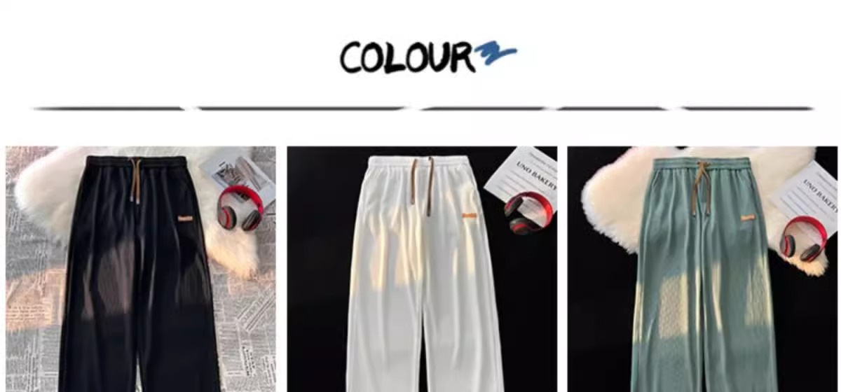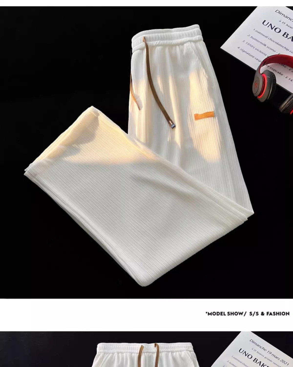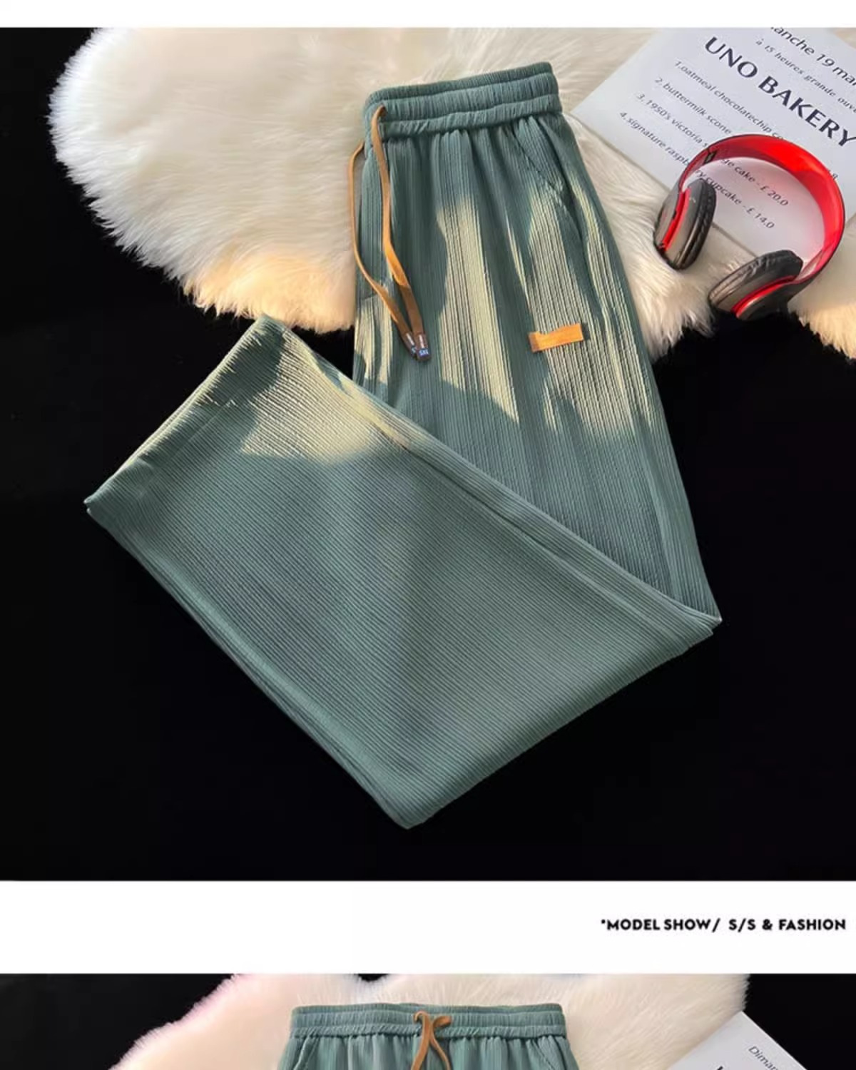 2024 플러스 사이즈 폭발 느슨한 캐주얼 아이스 실크 스트레이트 다리 바지 남성과 여성을위한 봄과 여름 새로운 디자인 수 놓은 넓은 다리 바지 느낌