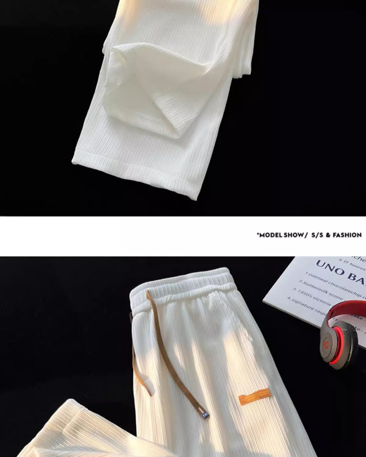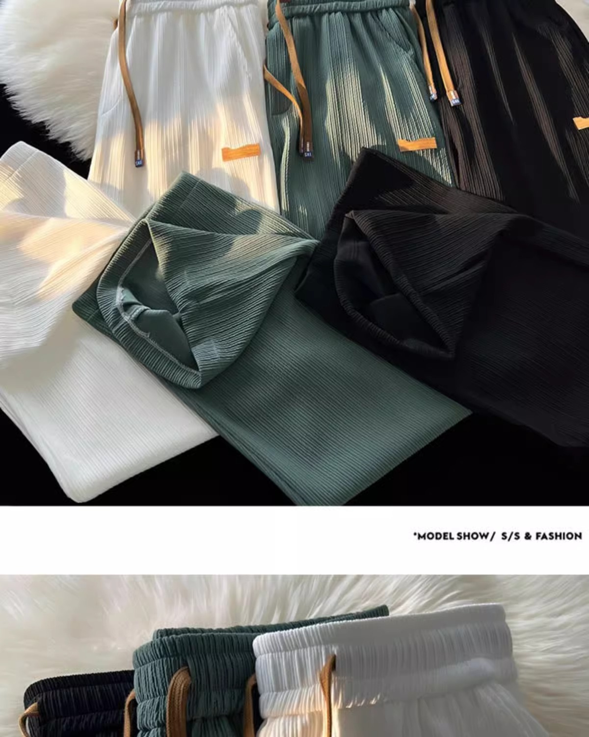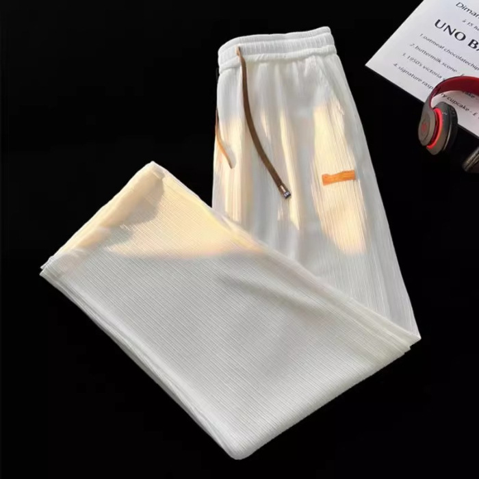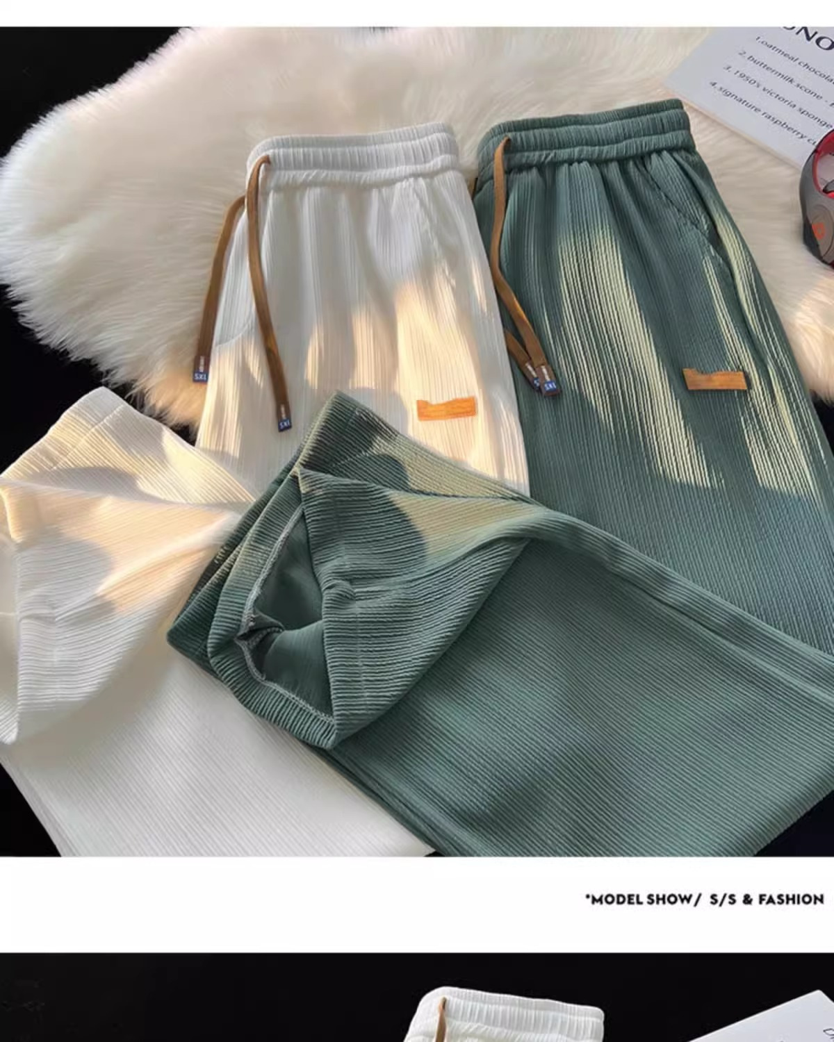 2024 플러스 사이즈 폭발 느슨한 캐주얼 아이스 실크 스트레이트 다리 바지 남성과 여성을위한 봄과 여름 새로운 디자인 수 놓은 넓은 다리 바지 느낌