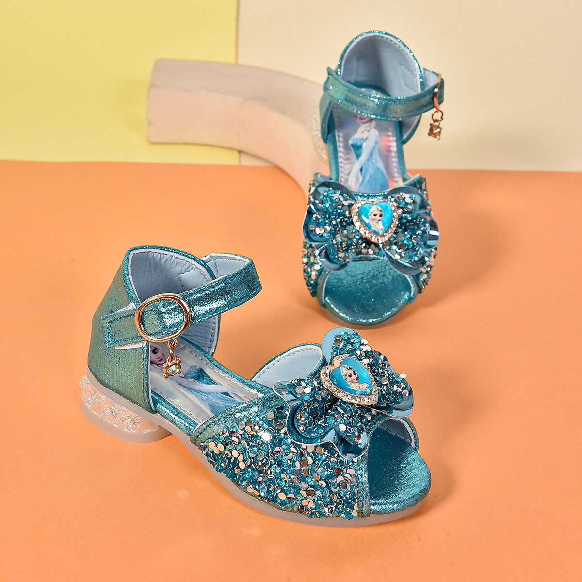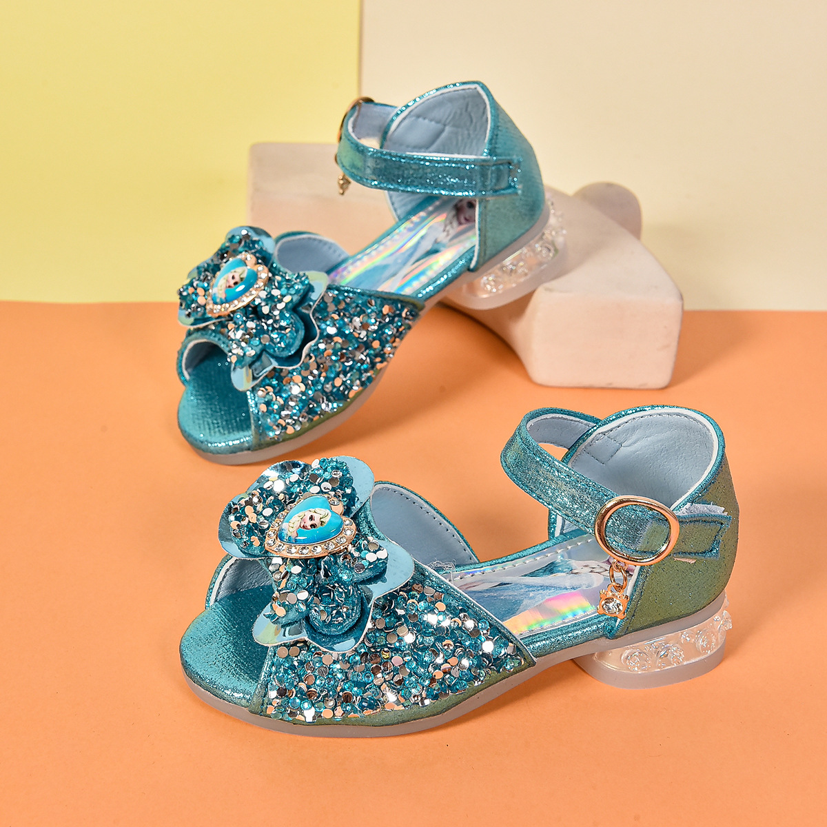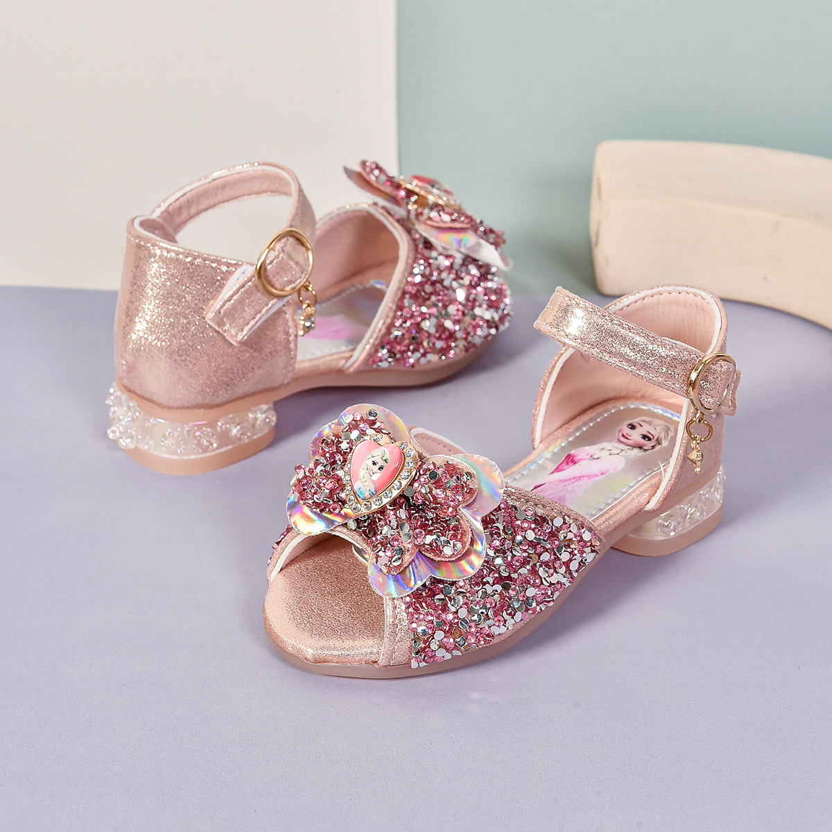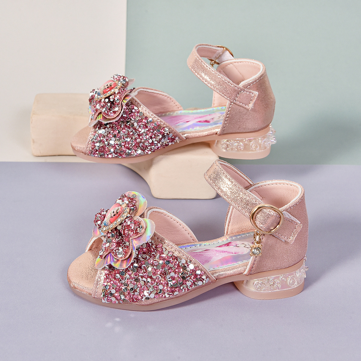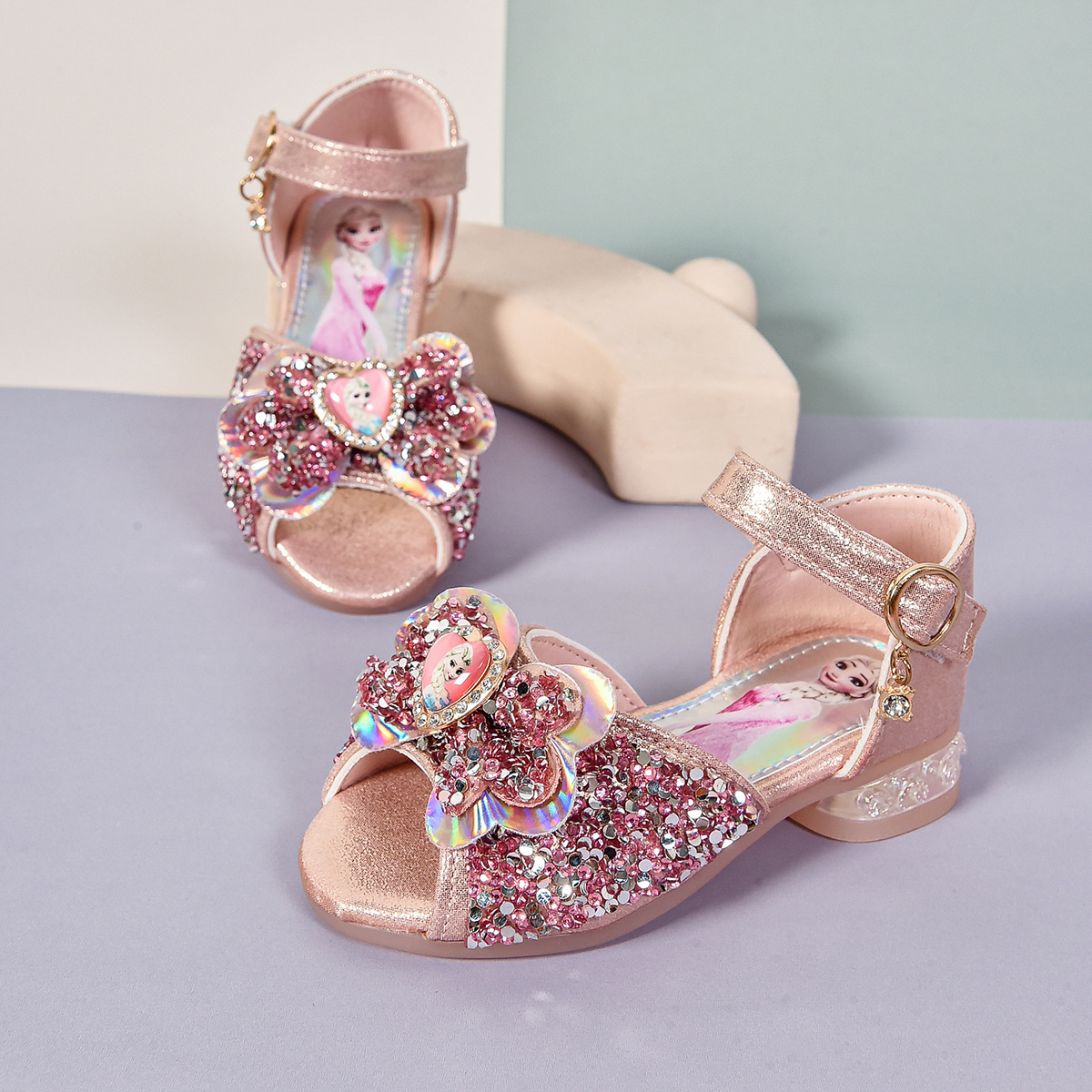 어린이 샌들 2024 여름 한국 스타일 소녀의 밝은 다이아몬드 활 하이힐 공주 샌들 학생 공연 신발스토어 가기
