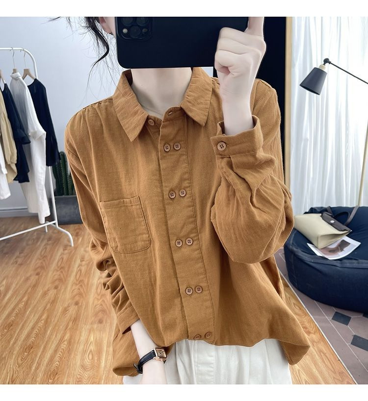 디자인 센스 솔리드 컬러 고급 올 매치 더블 브레스트 코튼 및 리넨 긴소매 셔츠 여성의 봄과 가을 뉴 폴로 칼라 루즈 셔츠스토어 가기