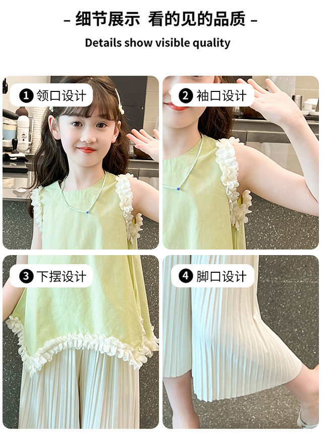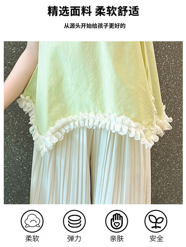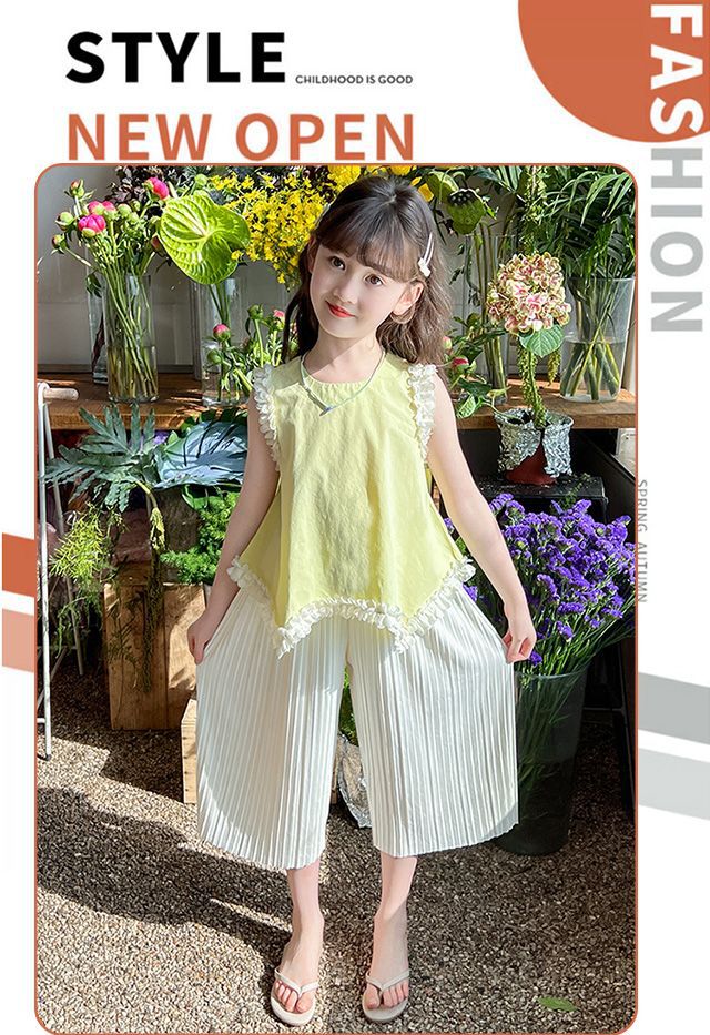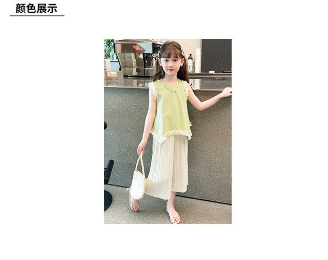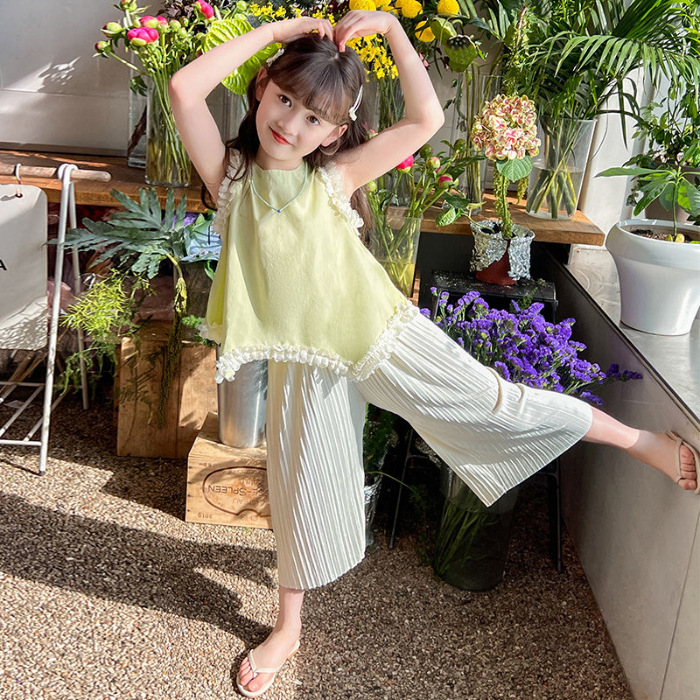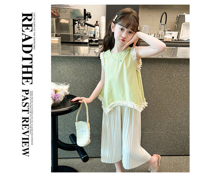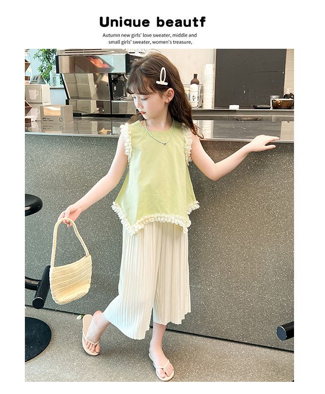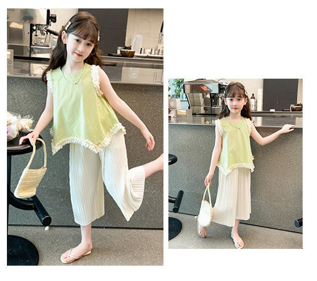 소녀 여름 외국 스타일의 세트 2024 인터넷-유명한 아기 소녀 불규칙한 레이스 탑 어린이 와이드 레그 바지스토어 가기
