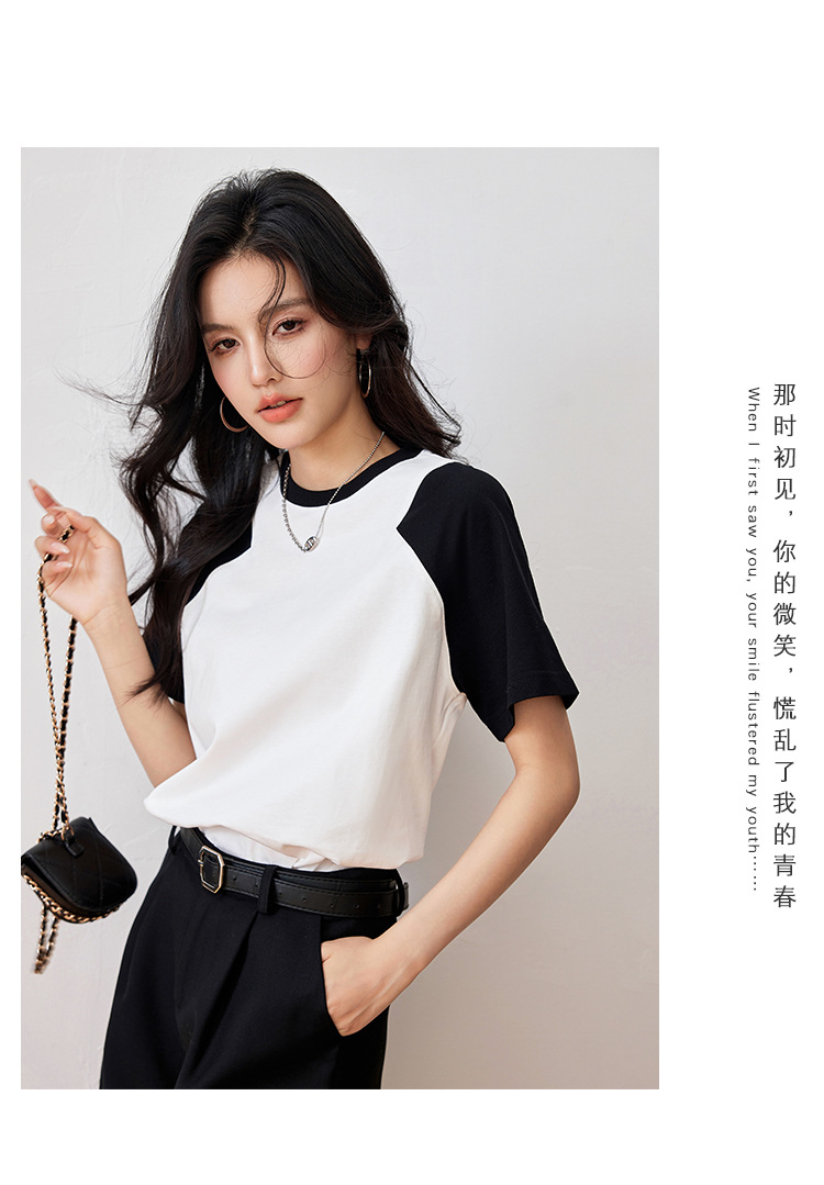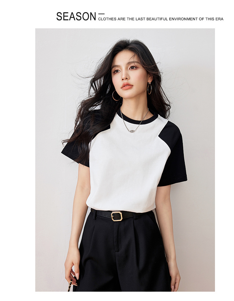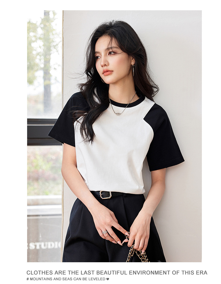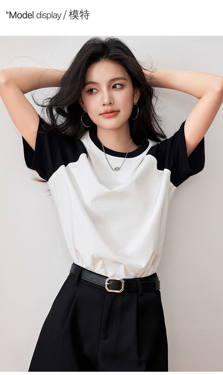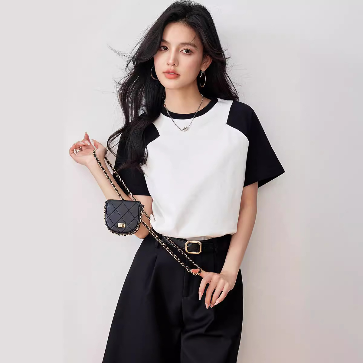 반팔 티셔츠 여성 2024 년 여름 새로운 한국식 디자인 센스 니쉬 대조 컬러 슬리밍 루즈 라운드 넥 Ins 트렌디 탑스토어 가기