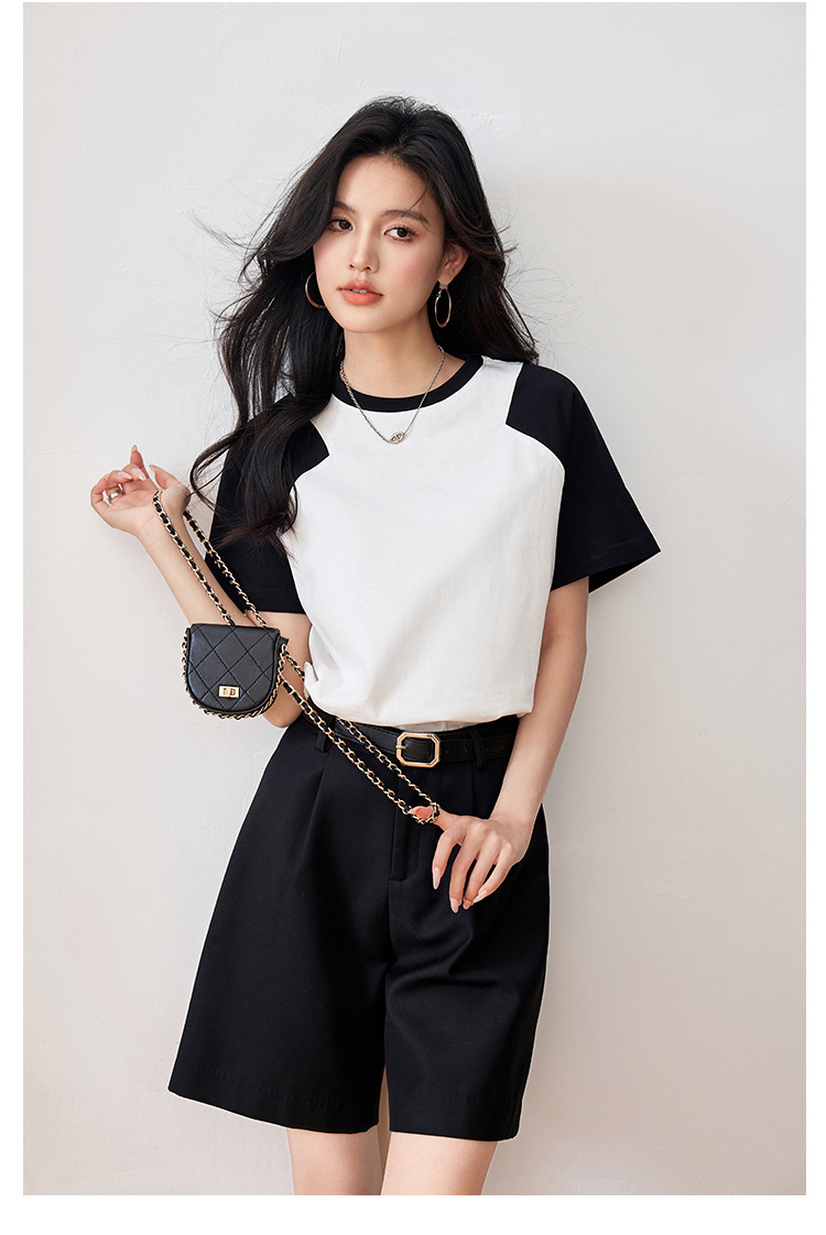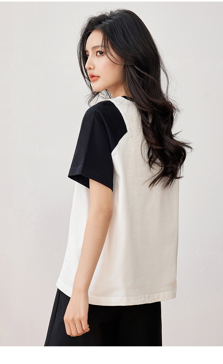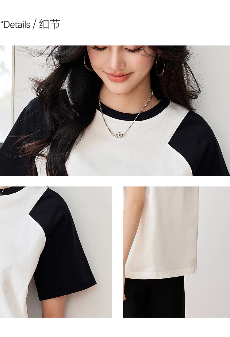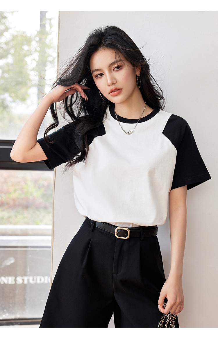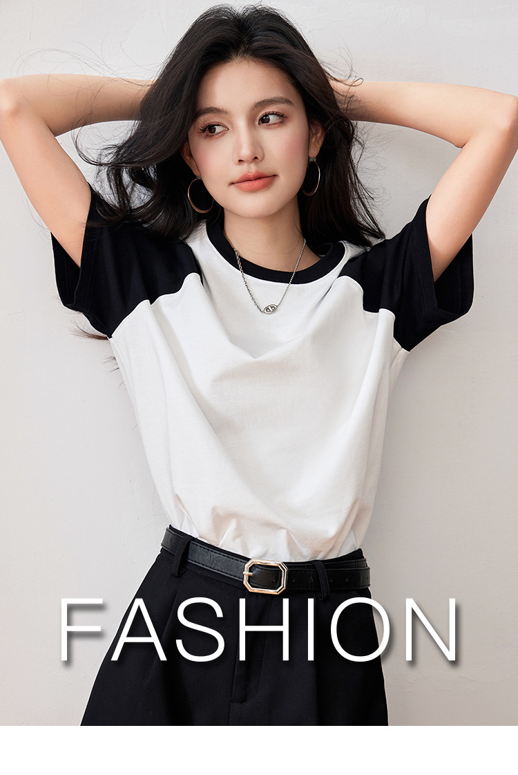 반팔 티셔츠 여성 2024 년 여름 새로운 한국식 디자인 센스 니쉬 대조 컬러 슬리밍 루즈 라운드 넥 Ins 트렌디 탑스토어 가기