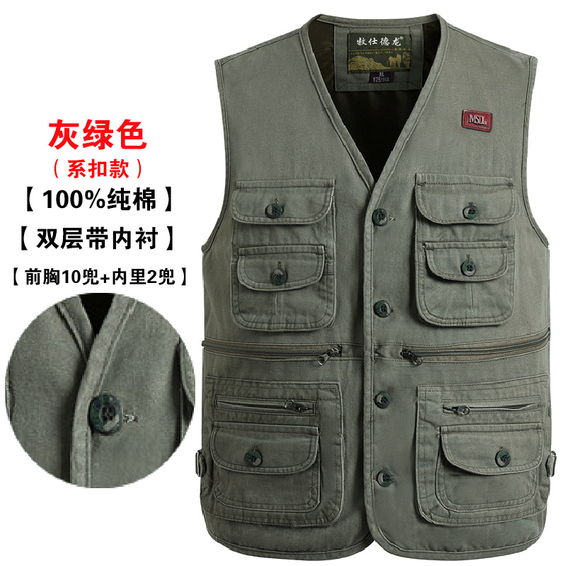 중년 및 노인을위한 Multi-Pocket Waistcoat 남성용 야외 등산과 봄과 가을 코튼 아빠 지퍼 더블 레이어 캐주얼 조끼