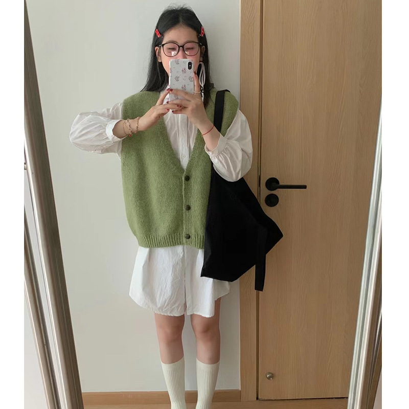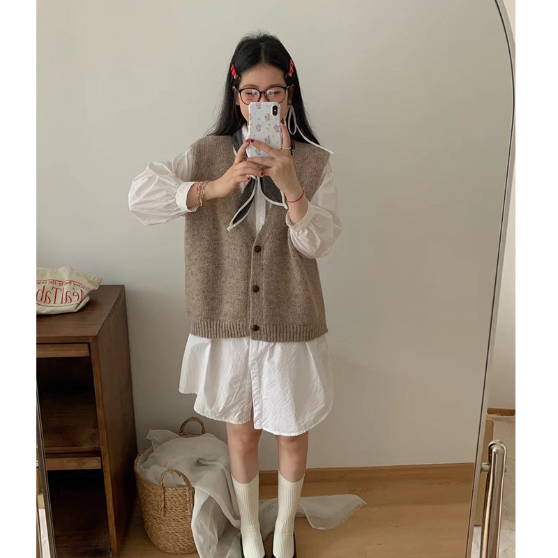 한국 스타일 게으른 스타일 간단한 V 넥 스웨터 조끼 여성 가을 겨울 새로운 오버랩 느슨한 스웨터 조끼