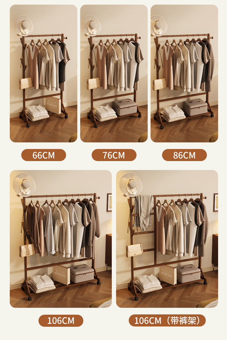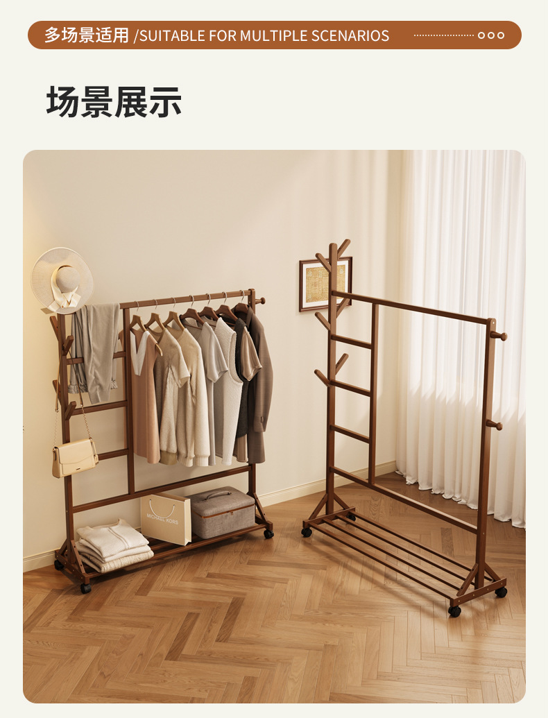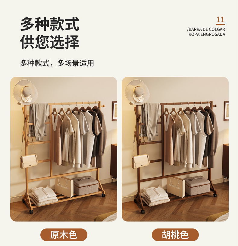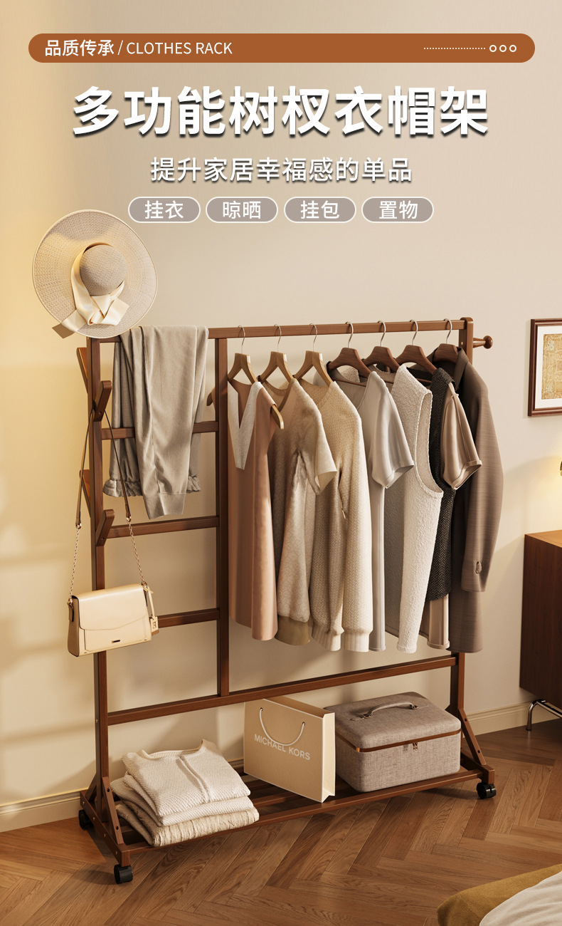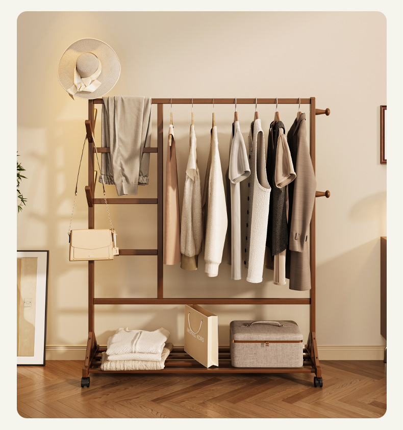 바닥 걸이 단단한 나무 건조 랙 간단한 코트 랙 침실 방 임대 홈 교수형 옷 선반 모바일 거실스토어 가기