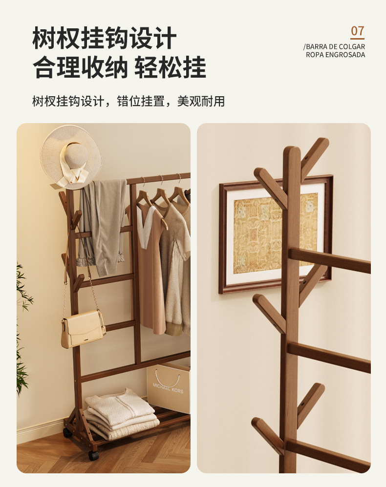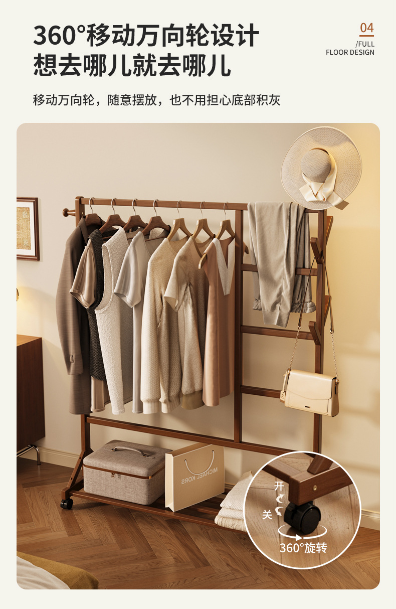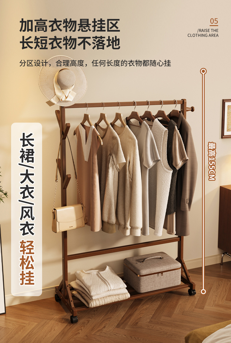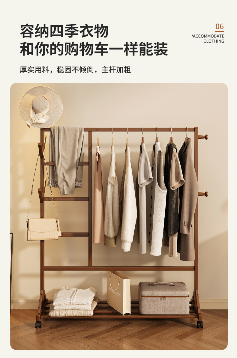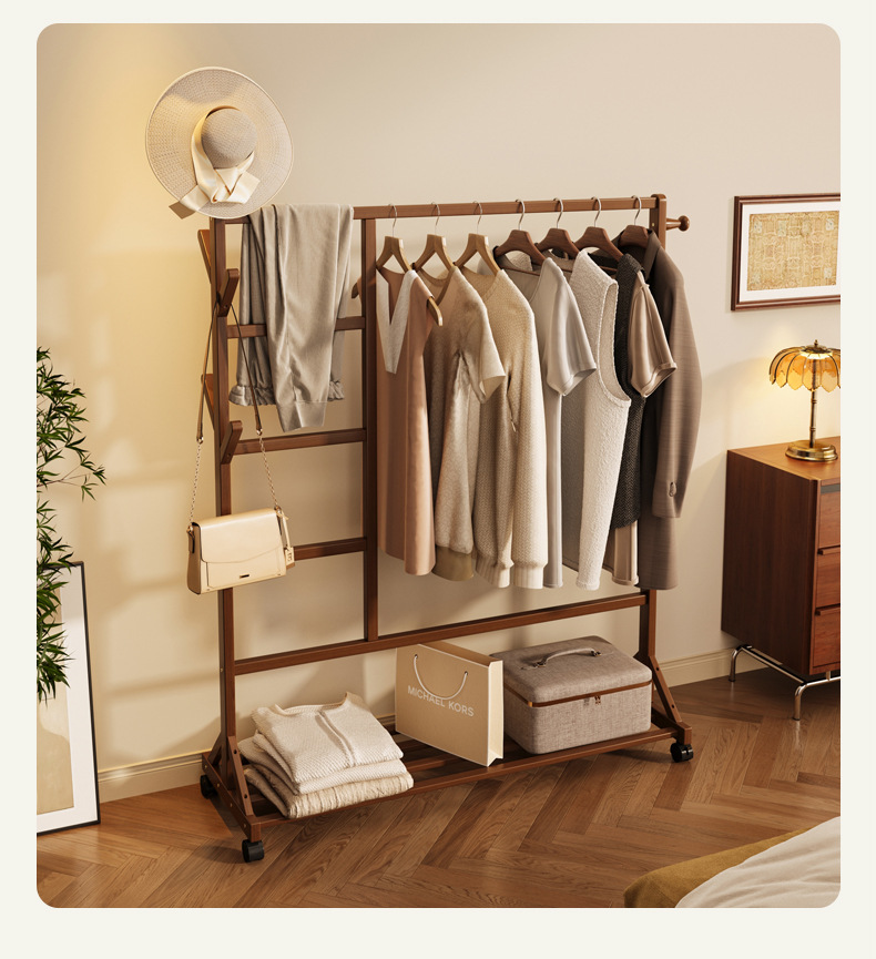 바닥 걸이 단단한 나무 건조 랙 간단한 코트 랙 침실 방 임대 홈 교수형 옷 선반 모바일 거실스토어 가기