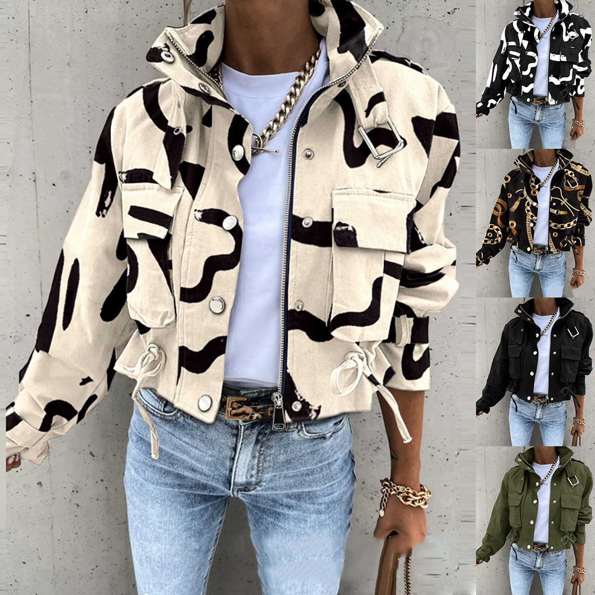 국경 간 대외 무역 유럽과 미국 여성 의류 아마존 AliExpress 2024 가을 패션 인쇄 지퍼 짧은 캐주얼 자켓스토어 가기