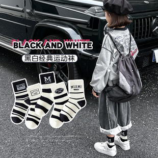 儿童袜子春秋韩系字母黑白条纹男女童中筒袜中大童潮流百搭学生袜