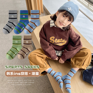 儿童袜子春秋韩系条纹笑脸男女童中筒袜中大童潮流百搭学生袜批发