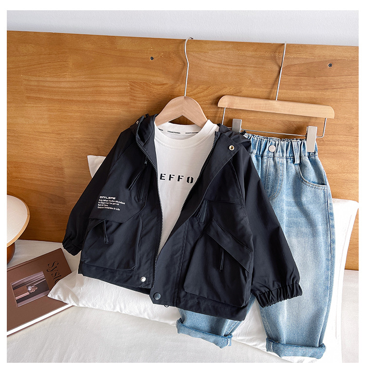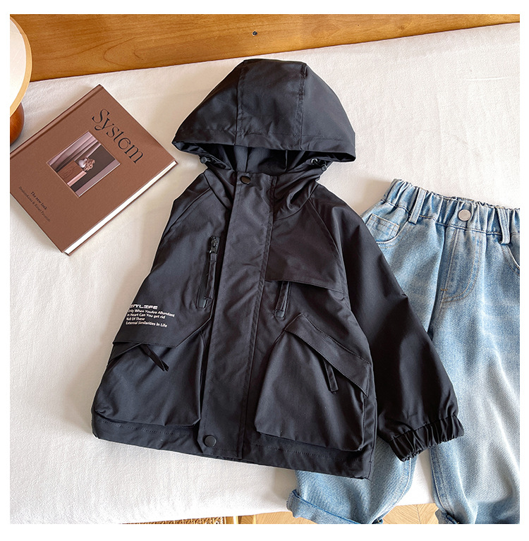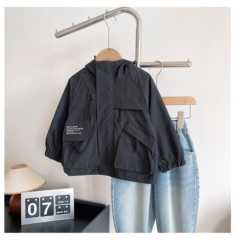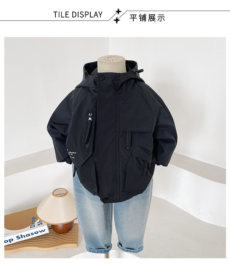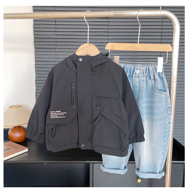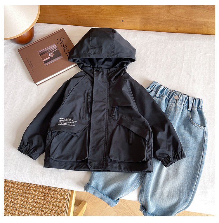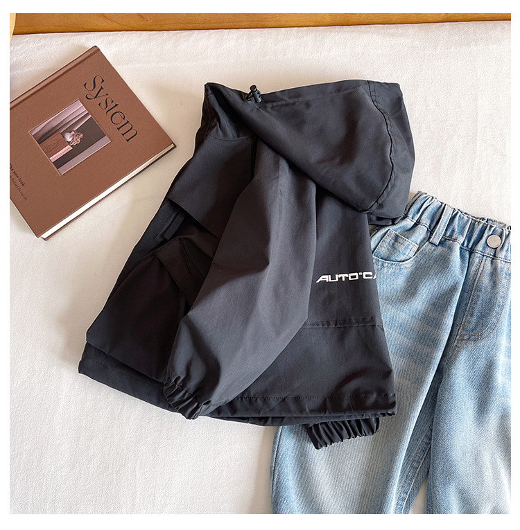 바람의 계곡 2024 가을 새 아동복 어린이 편지 포켓 루소 유행하는 핸섬 후드 자켓 소년 소녀