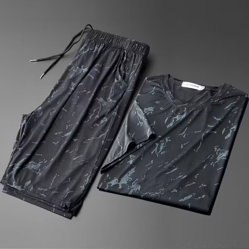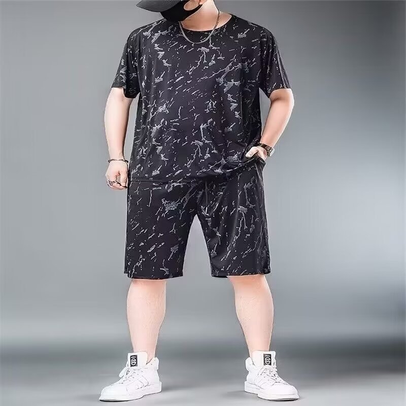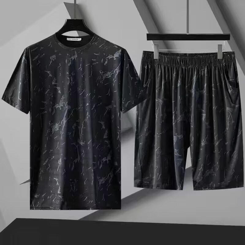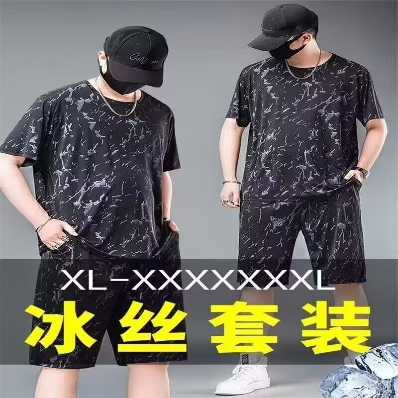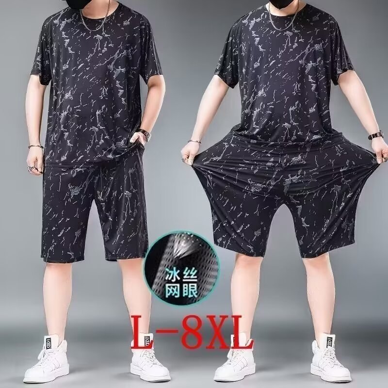 아이스 실크 세트 남성 여름 광범위한 플러스 사이즈 지방 스포츠 의류 빠른 건조 의류 반팔 반바지 새로운 위장 얇은스토어 가기