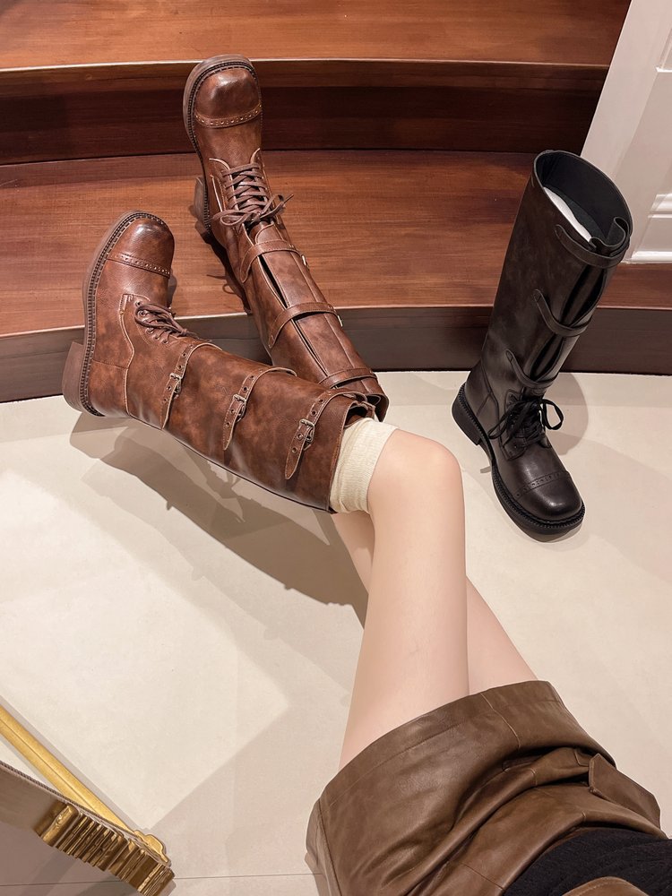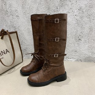 2024 년 가을 새로운 빈티지 고민 영국 마틴 부츠 스퀘어 토 레이스 업 하이 부츠 여성용 웨스턴 데저트 카우보이 부츠