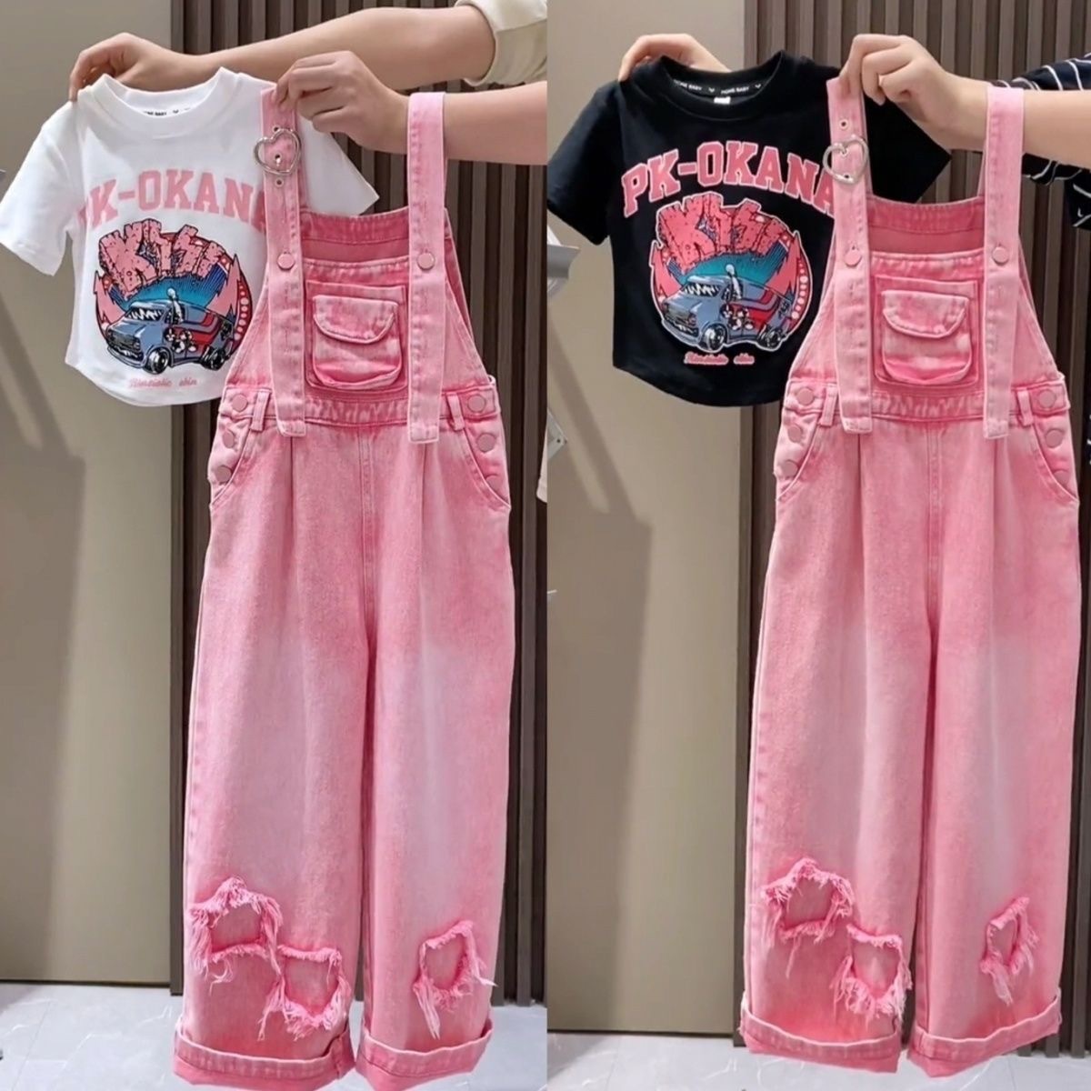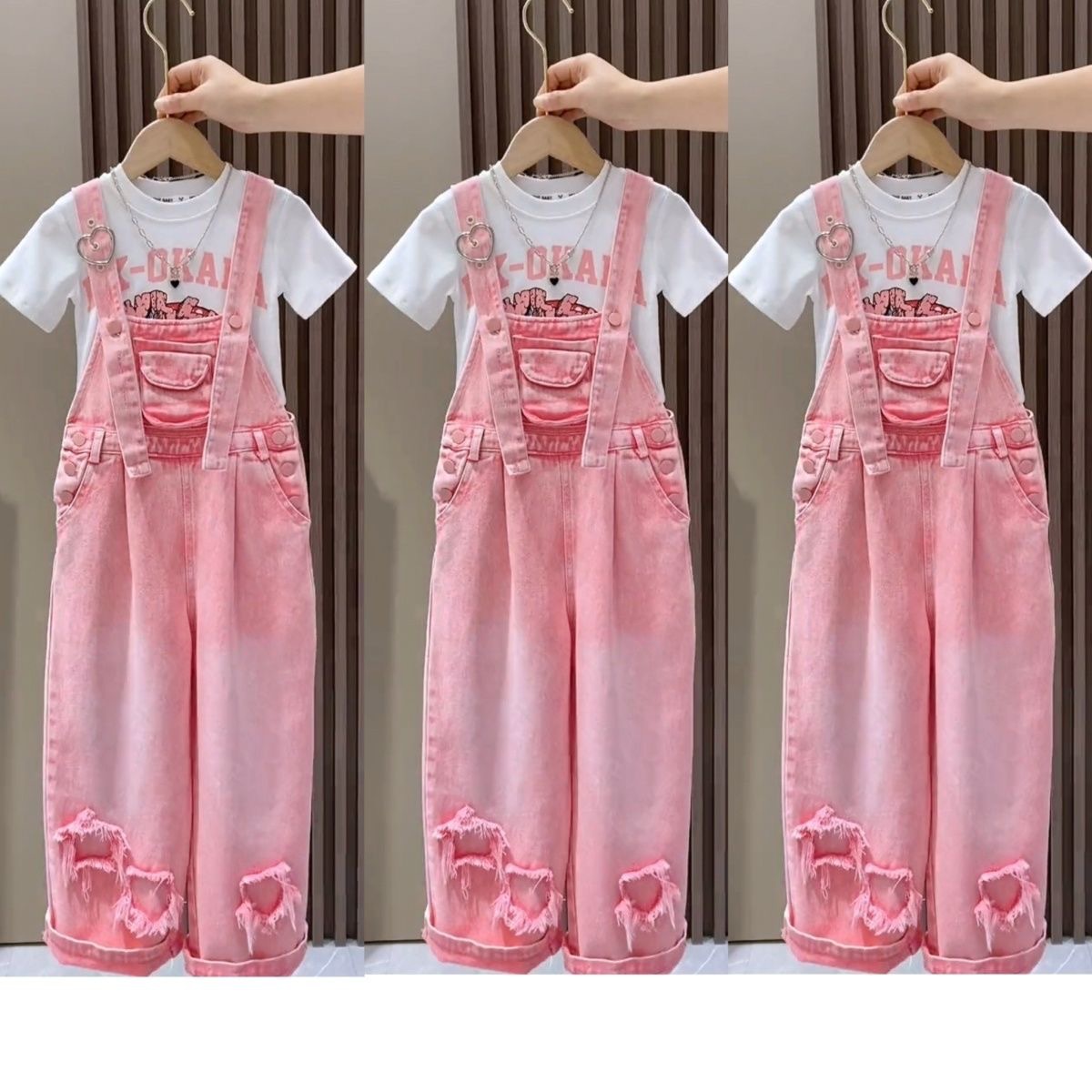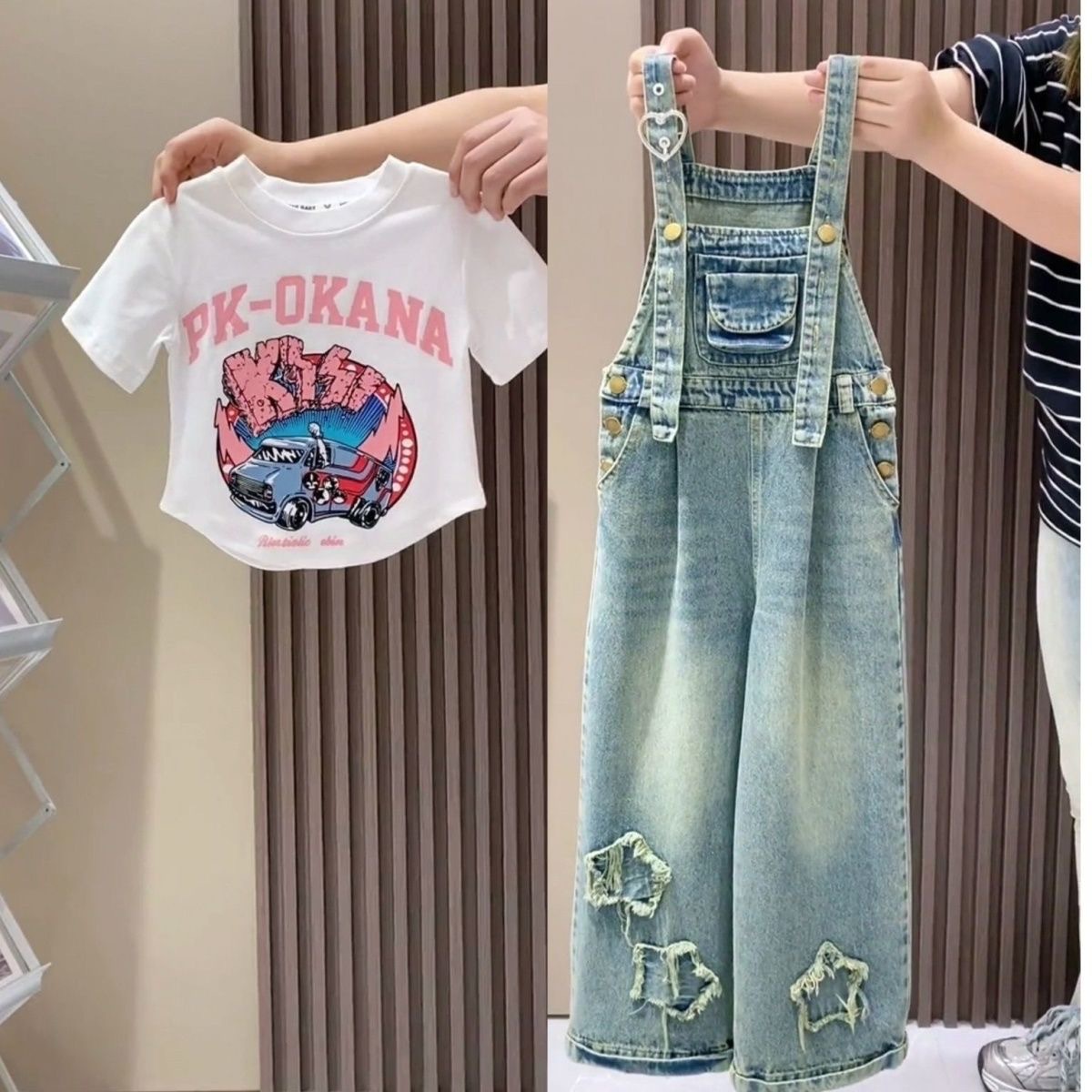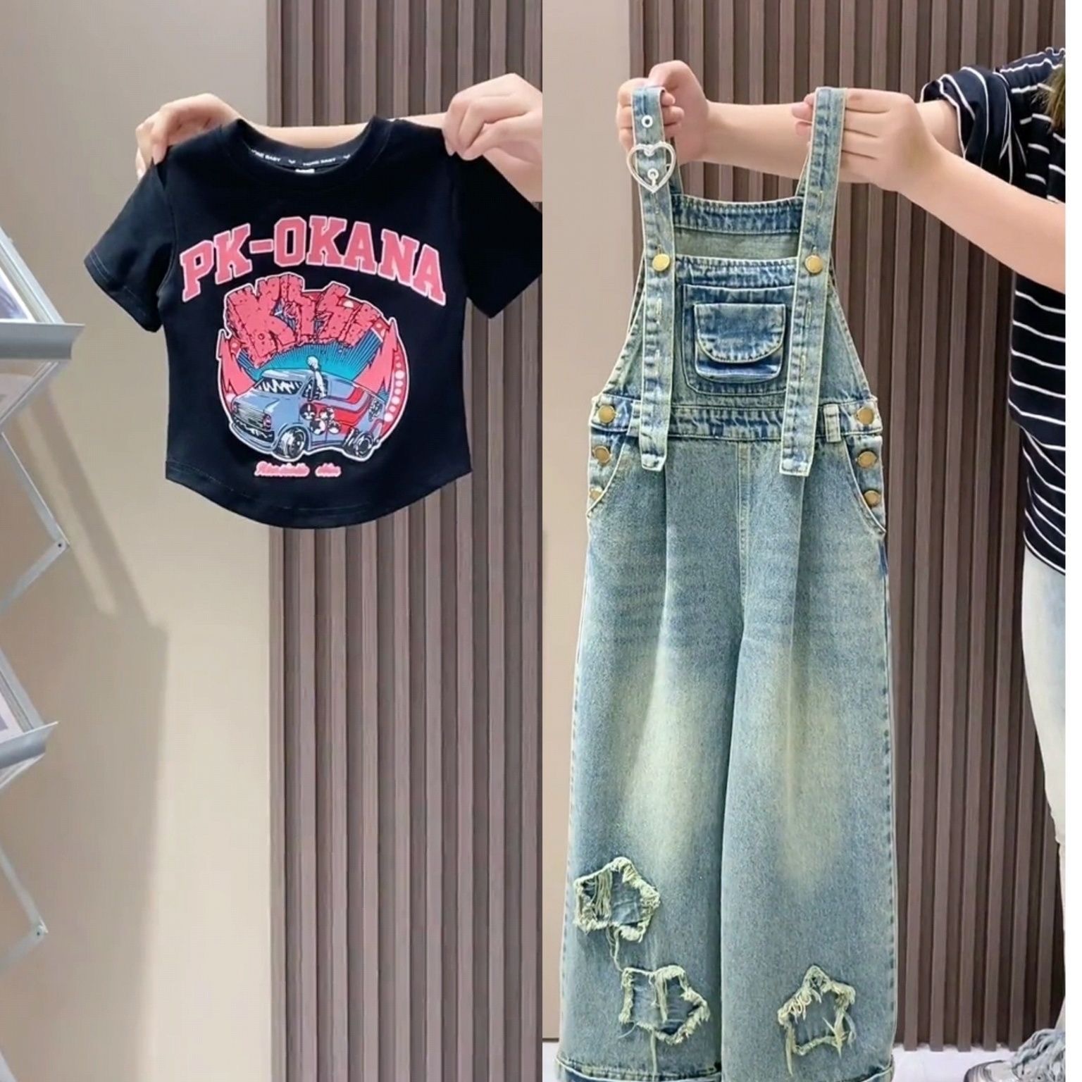 소녀 데님 스트랩 바지 세트 봄과 여름 2024 새로운 소녀 서양식 여름 유행 똥 거리 바지스토어 가기