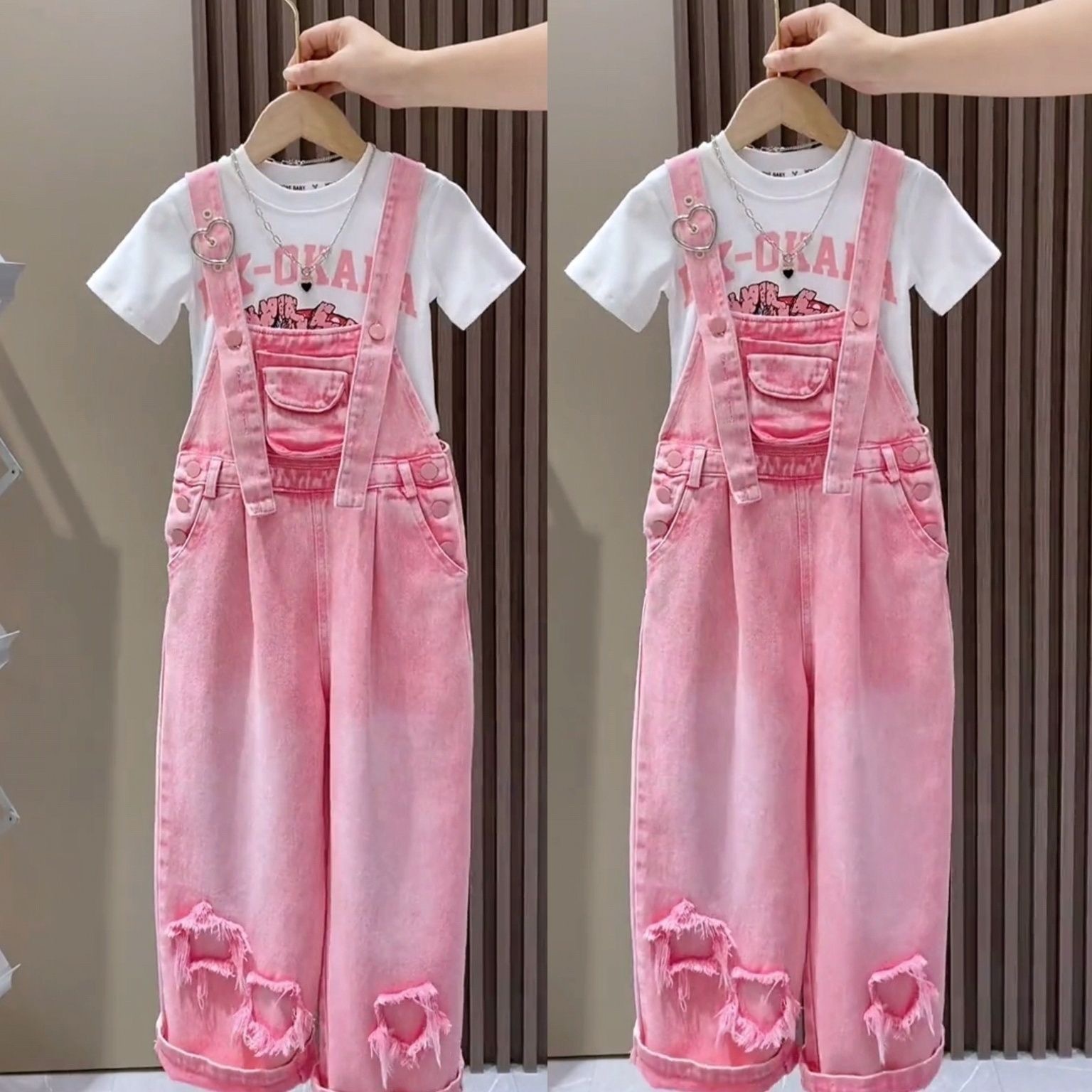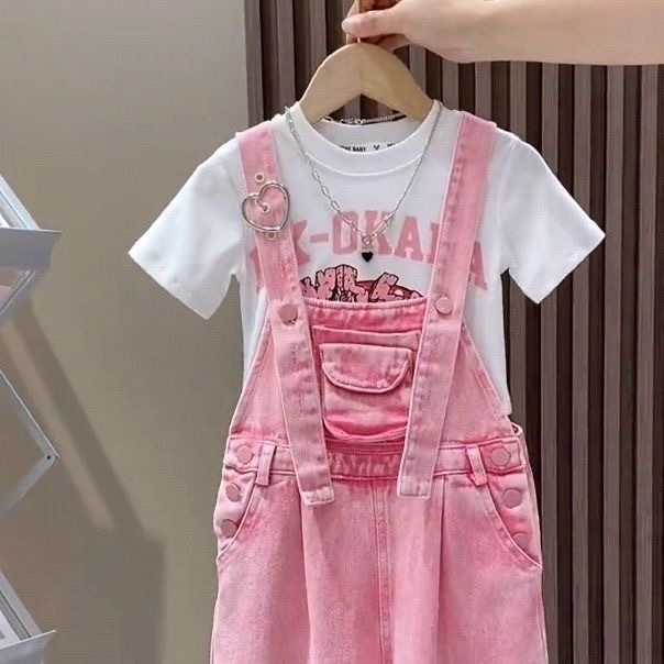 소녀 데님 스트랩 바지 세트 봄과 여름 2024 새로운 소녀 서양식 여름 유행 똥 거리 바지