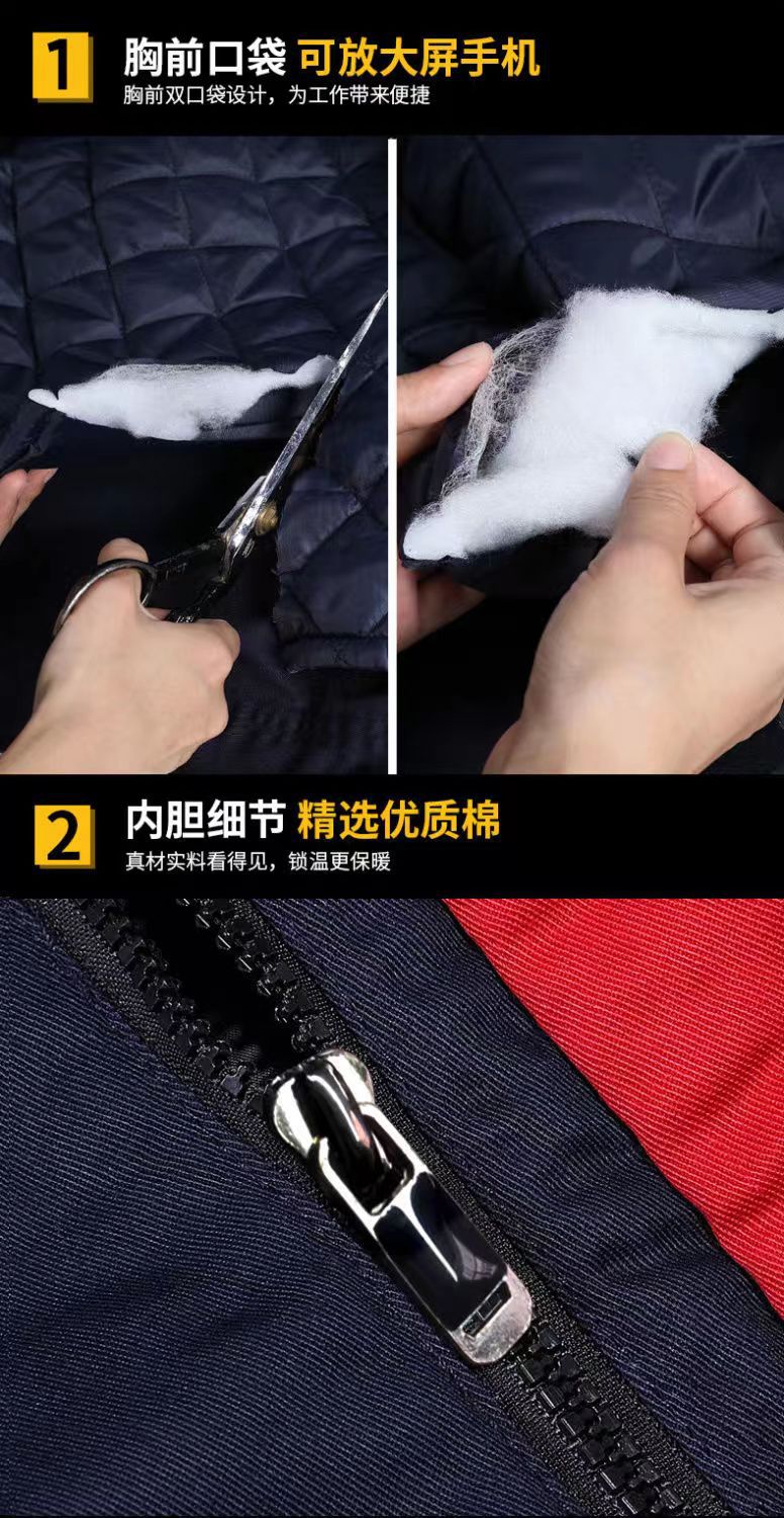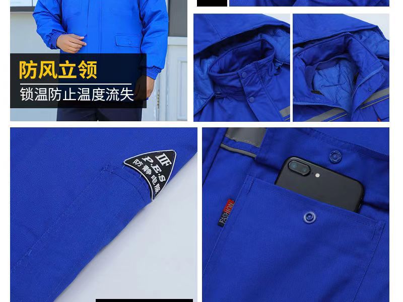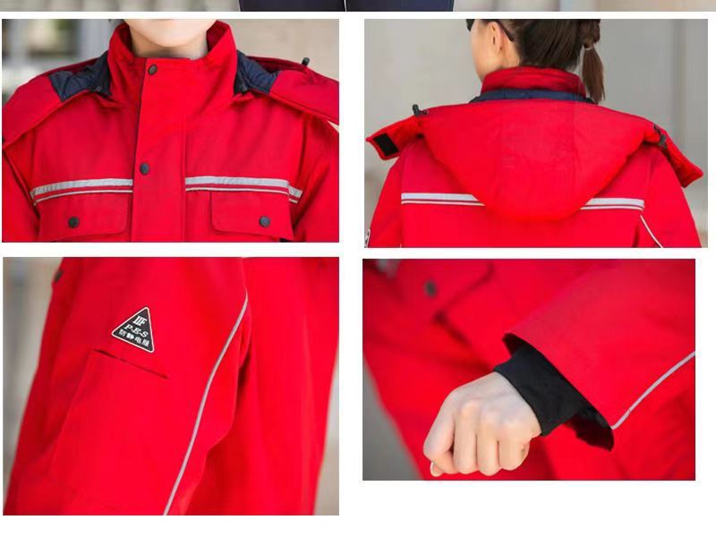겨울 정전기 방지 작업복 면화 패딩 코트 따뜻하게 유지 따뜻한 두꺼운 반사 스트립 상단 세트 중간 길이의 생활 국수