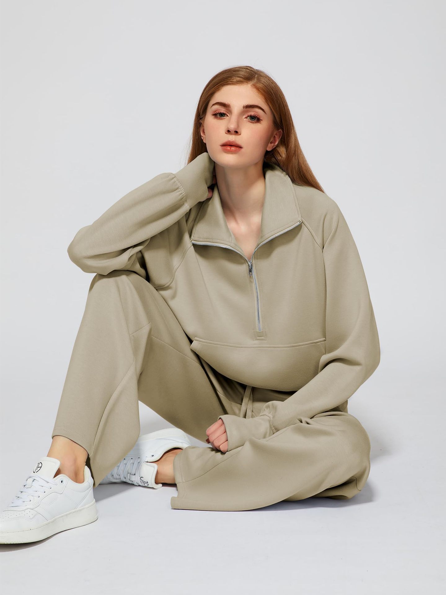 2025 유럽과 미국의 아마존 유럽과 미국 여성의 투피스 오버사이즈 하프 지퍼 스웨트 셔츠 와이드 레그 스웨트 팬츠 캐주얼 세트