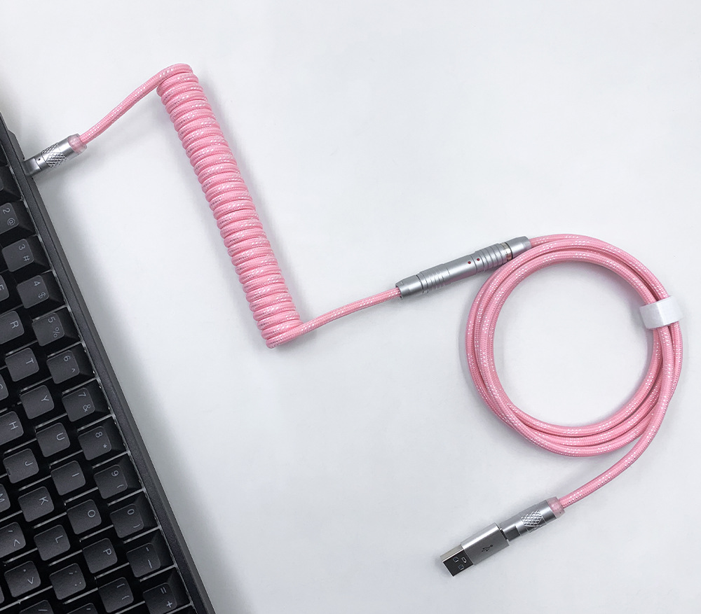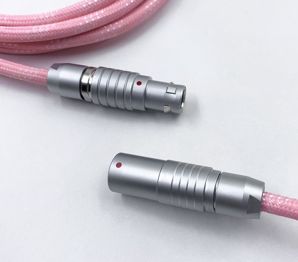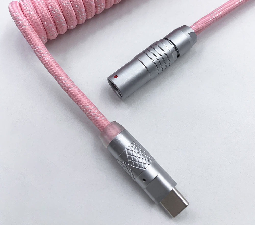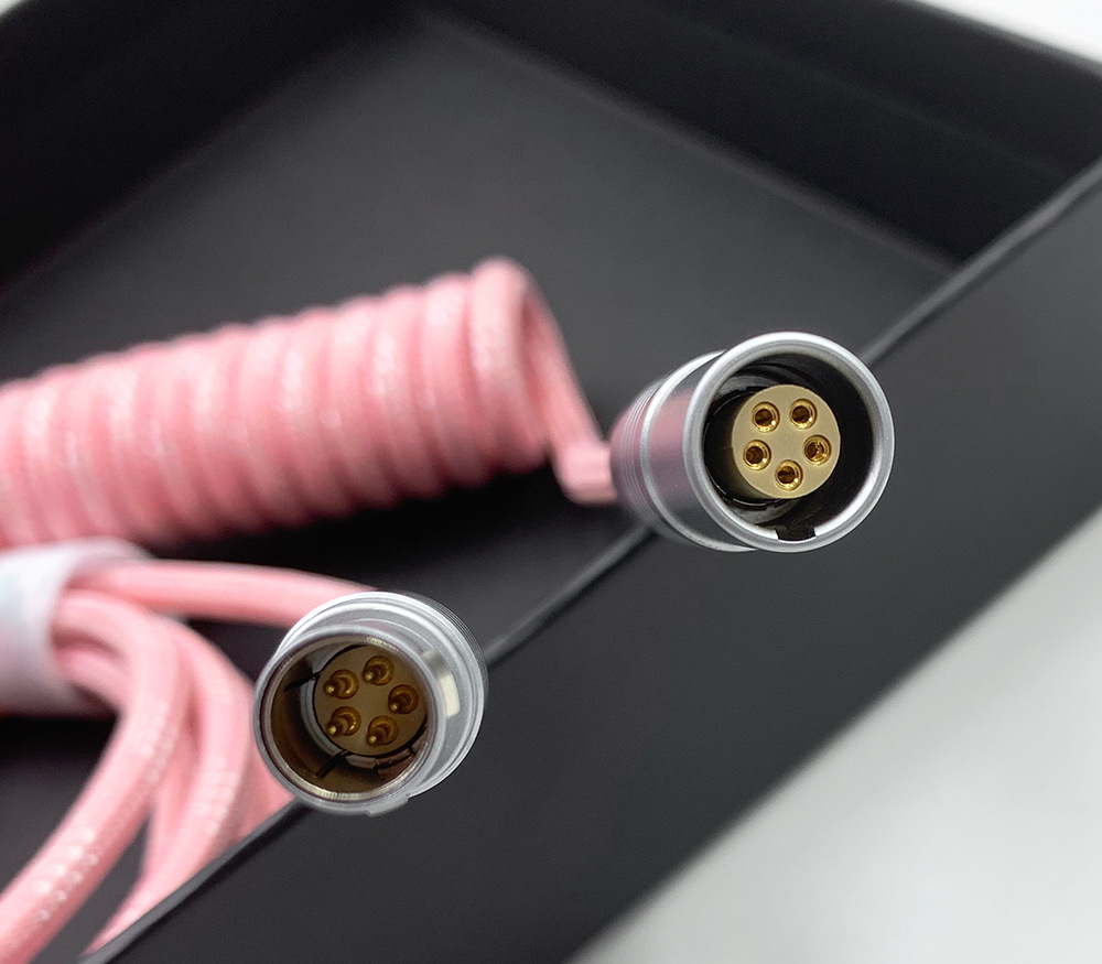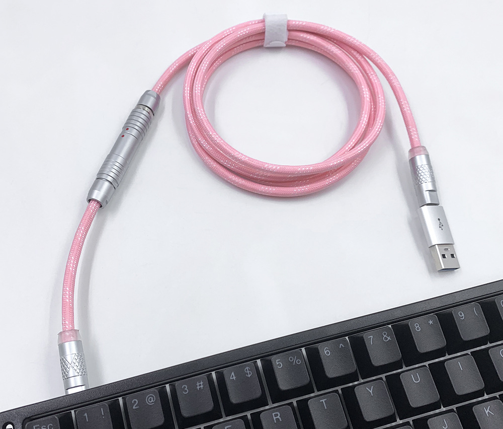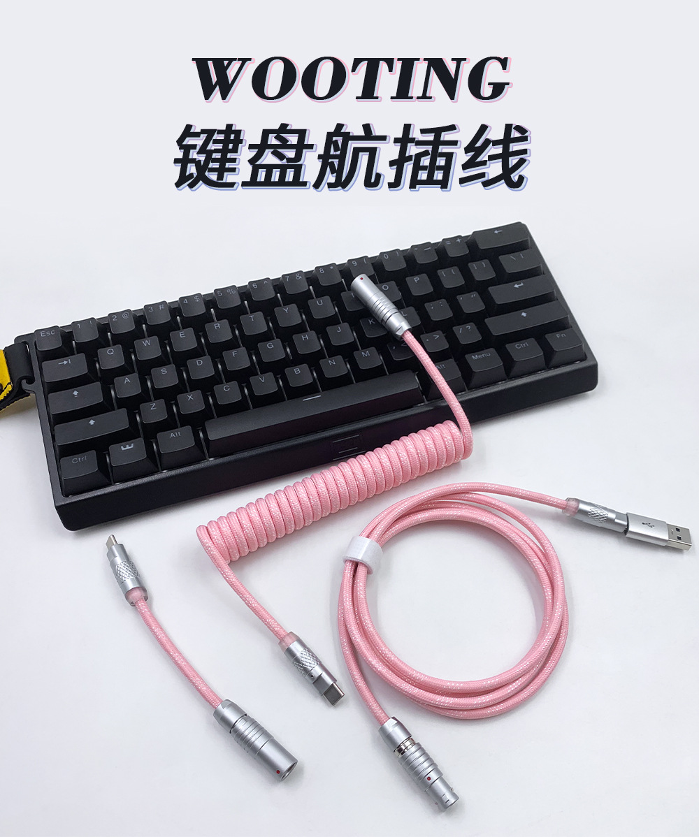 可拆卸电缆可以为包括 Wooting 60HE 在内的高性能设备提供稳定的电压,同时还提供独特的优质电缆。得益于耐用的 FGG/PHG 连接器,电缆可快速轻松地分成两部;长主电缆和短直电缆或较长的盘绕电缆。