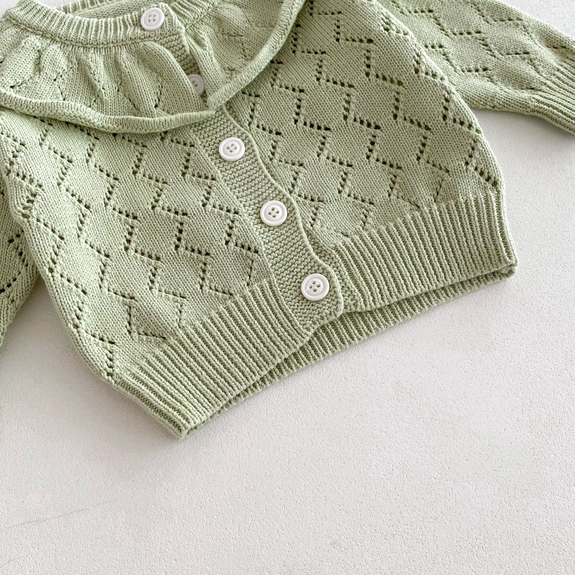 가을 2024 새로운 0-3 세 아기 소녀 스웨터 할로우 코튼 원사 니트 대형 로터칼라 긴 소매 자켓