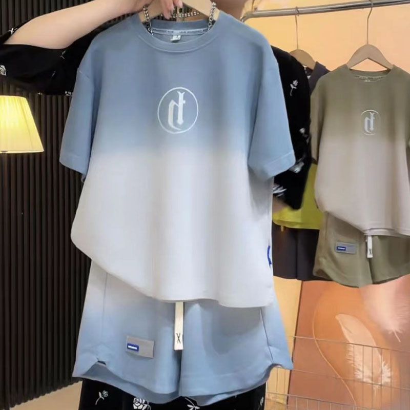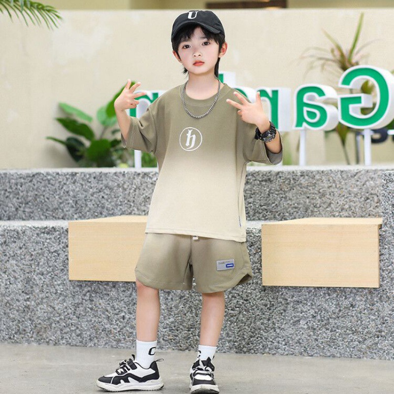 어린이 의류 소년 여름 의류 세트 2024 새로운 큰 어린이 여름 짧은 소매 투피스 어린이 스포츠 잘 생긴 튀김 거리 조수스토어 가기