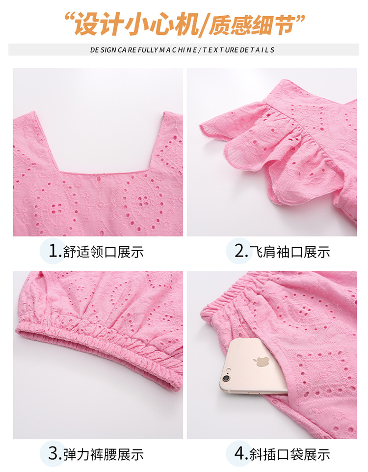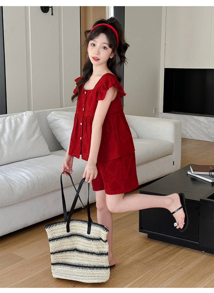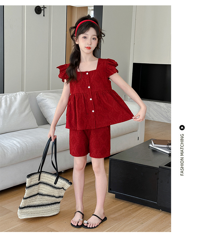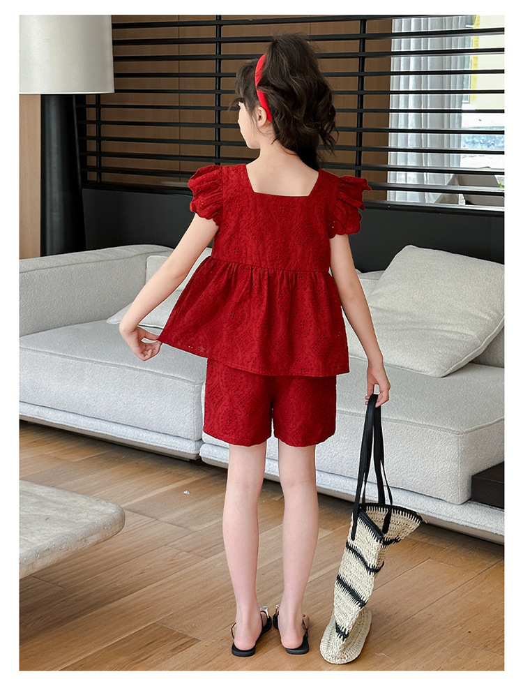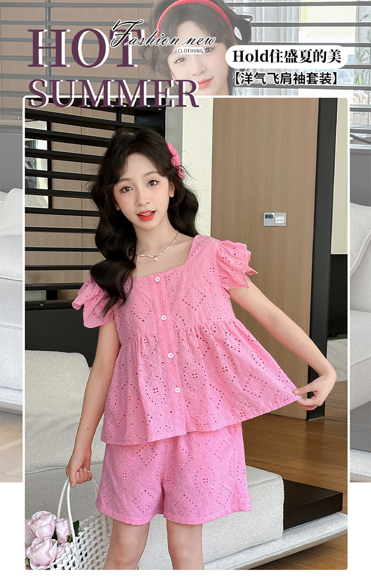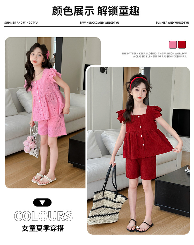 여자 여름 외국 스타일 세트 2024 새로운 한국 스타일 스퀘어 칼라 작은 플라이 슬리브 탑 캐주얼 반바지 투피스 트렌디스토어 가기
