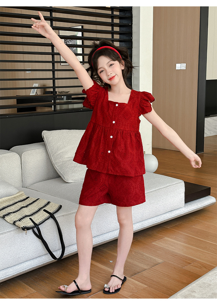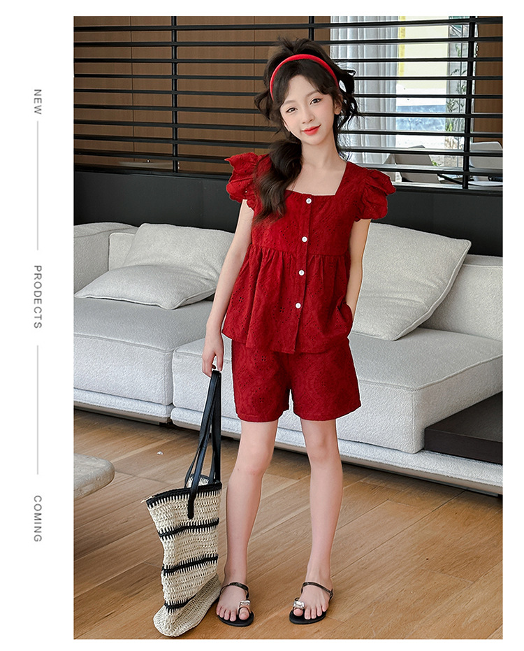 여자 여름 외국 스타일 세트 2024 새로운 한국 스타일 스퀘어 칼라 작은 플라이 슬리브 탑 캐주얼 반바지 투피스 트렌디
