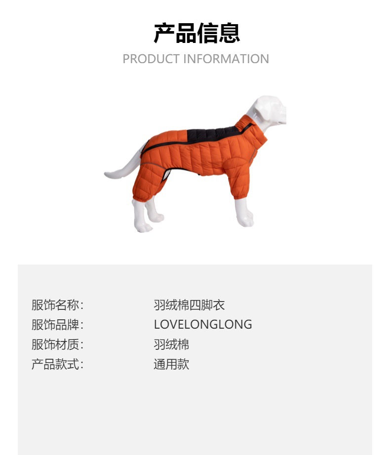 设计理念: 结合时尚与实用,这款狗狗四脚羽绒棉服拼接款采用创新设计,为爱犬提供美好的保暖体验。精选面料与精细工艺的结合,让这款羽绒棉服成为冬日里的温暖伴侣。
