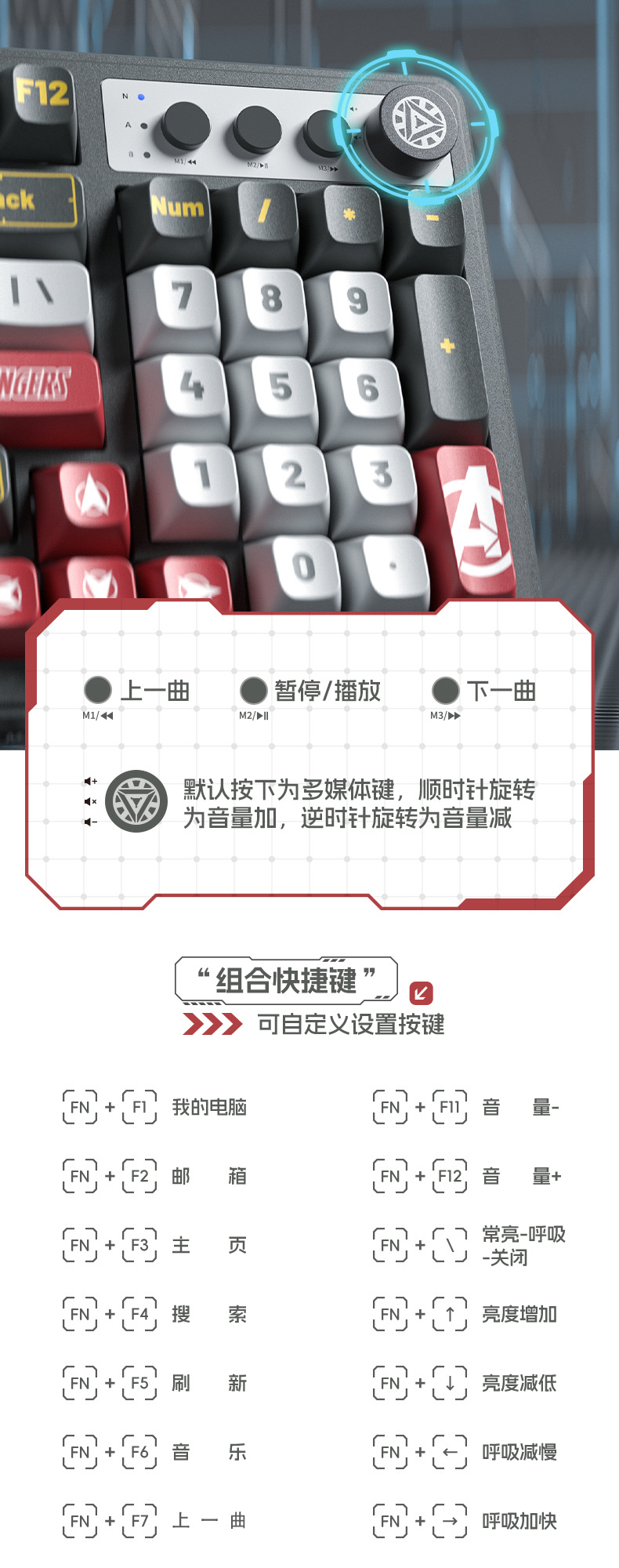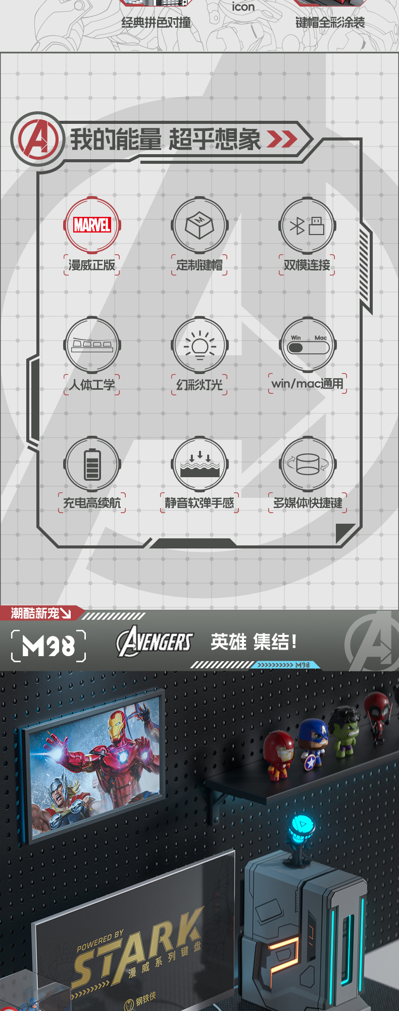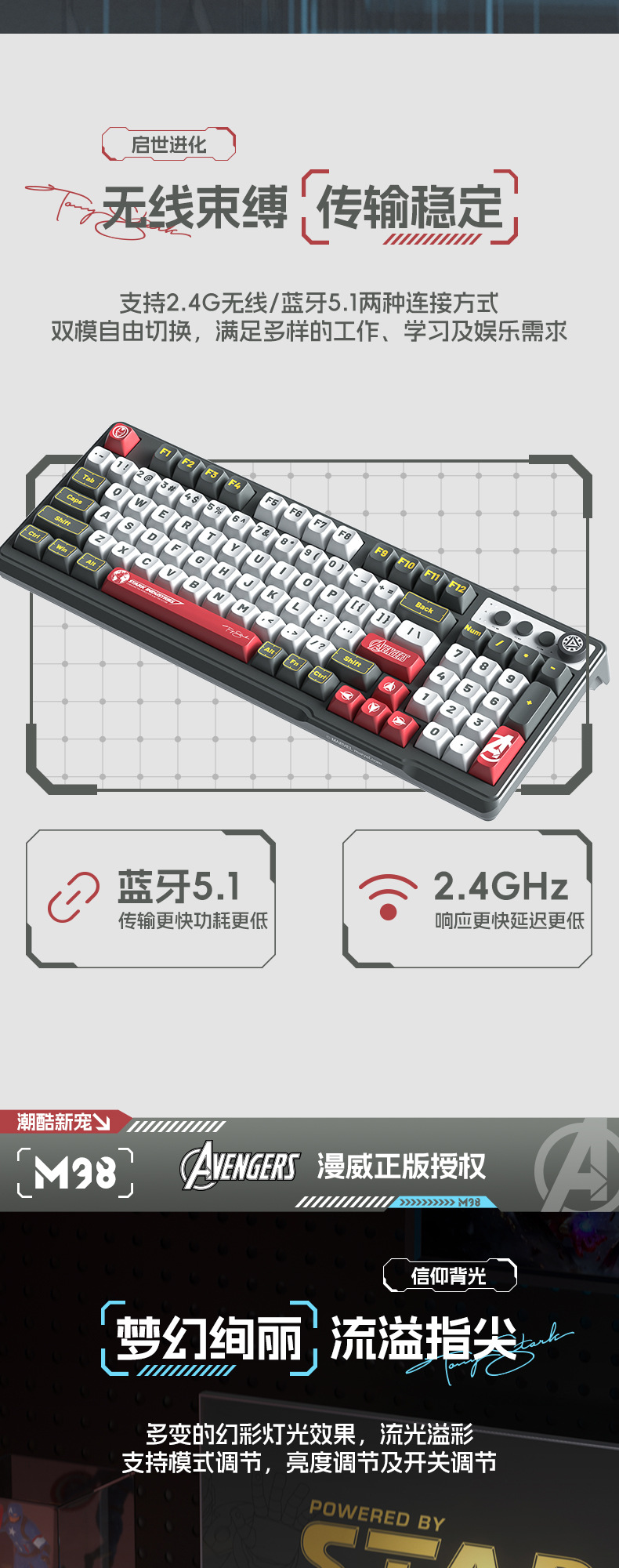 • 마블 정품-아이언 맨 (그레이-블랙 혼합 라이트)-무선 블루투스 듀얼 모드 키보드