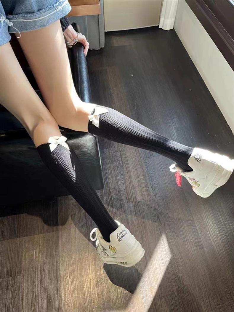 흑백 맞춤형 힐 보우 송아지 통기성 양말 무릎 Jk 스타일 소녀 Ins 슬리밍 여성용 귀여운 스택 양말스토어 가기
