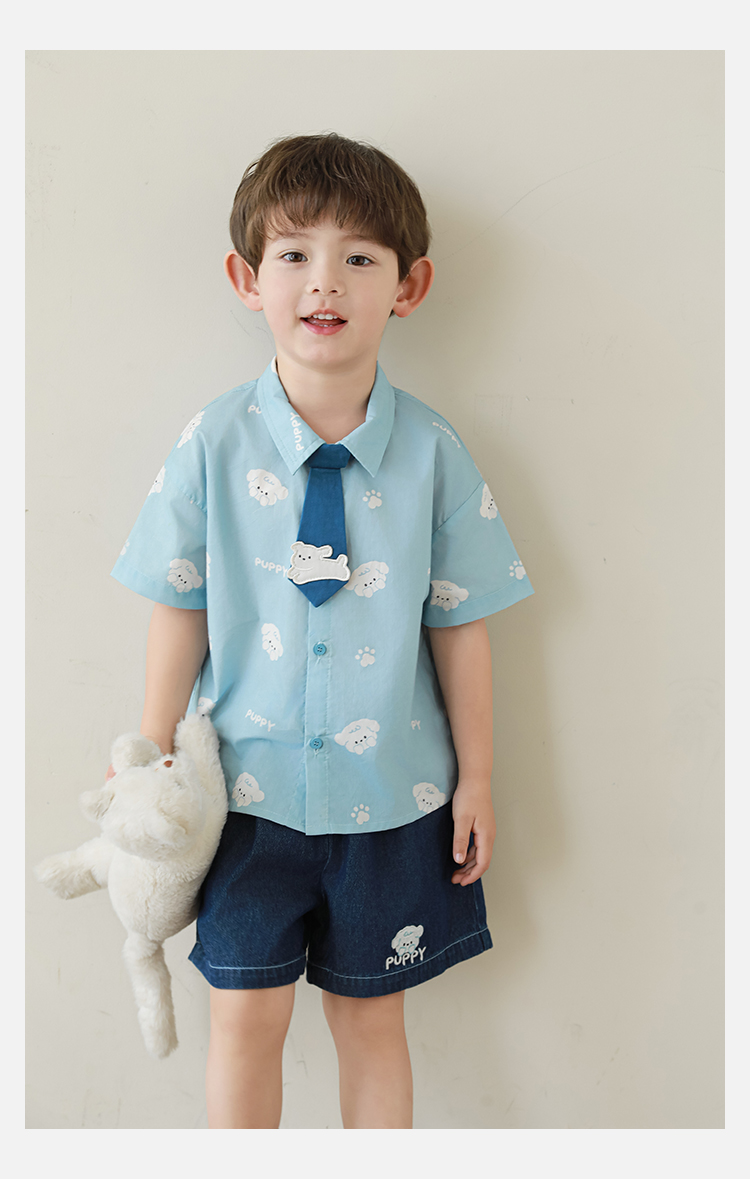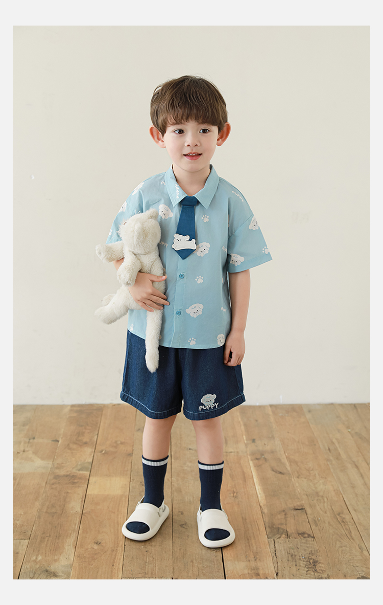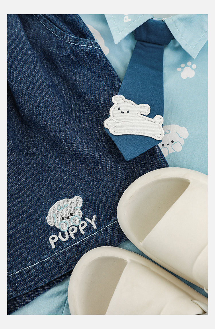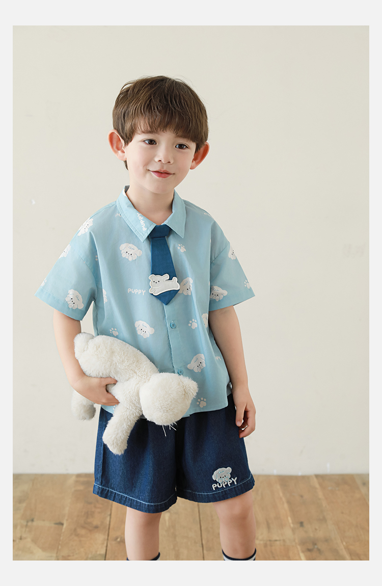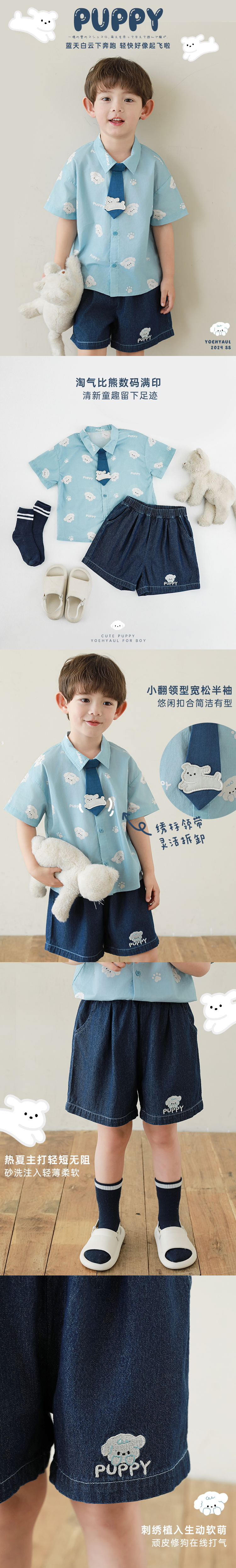 우립 소년 여름 새로운 만화 반팔 셔츠 캐주얼 느슨한 데님 반바지 어린이 트렌디 쿨 세트스토어 가기