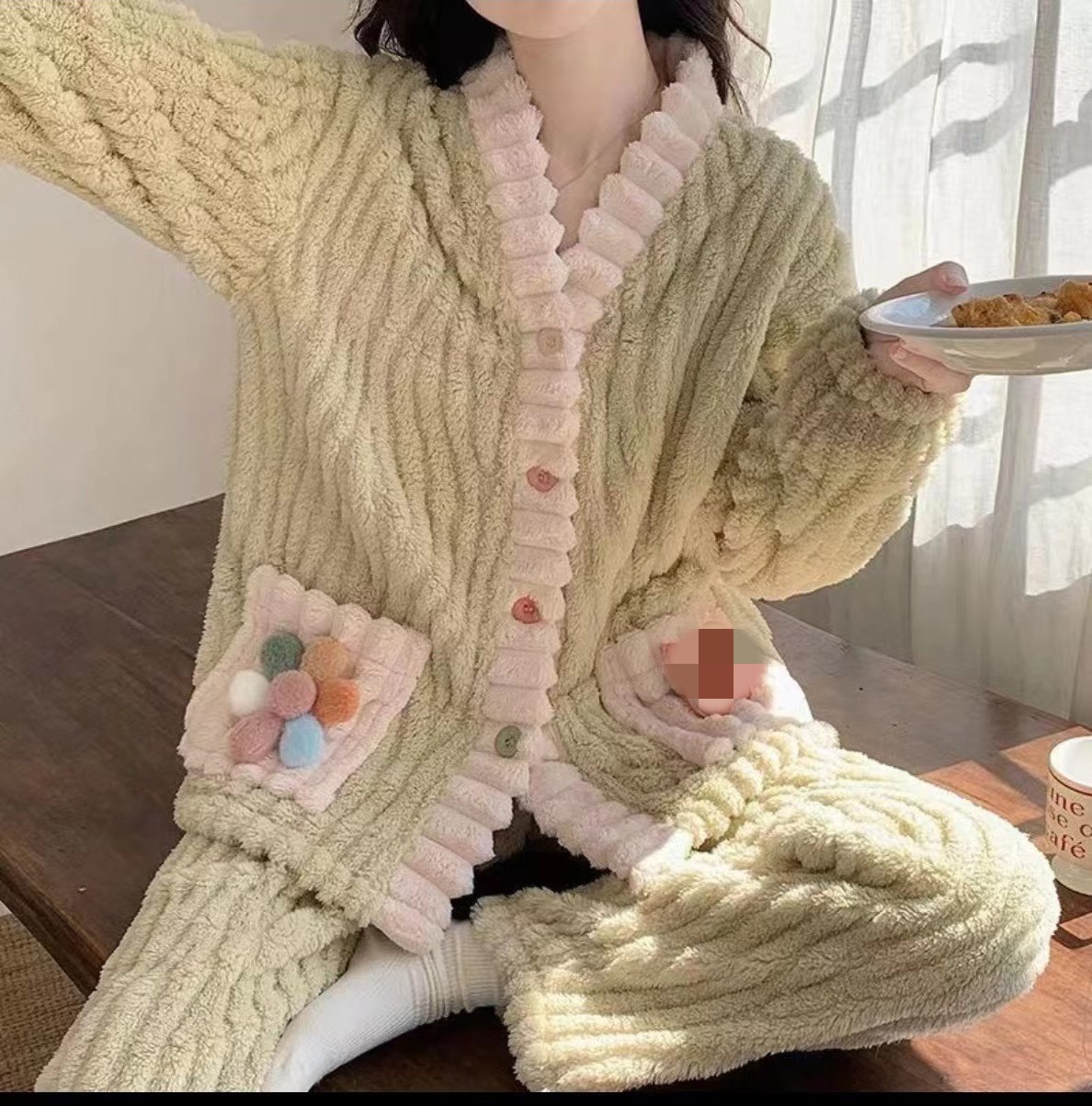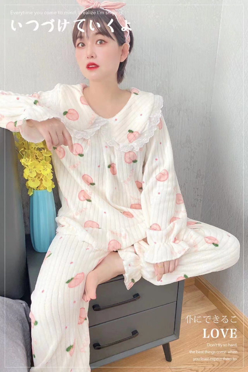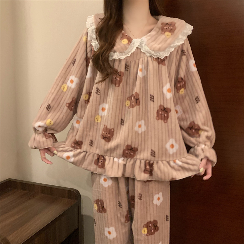 산호 양털 파자마 여성의 겨울 두꺼운 외부 착용 귀여운 플란넬 홈 옷 유행 느슨한 긴 카디건 세트